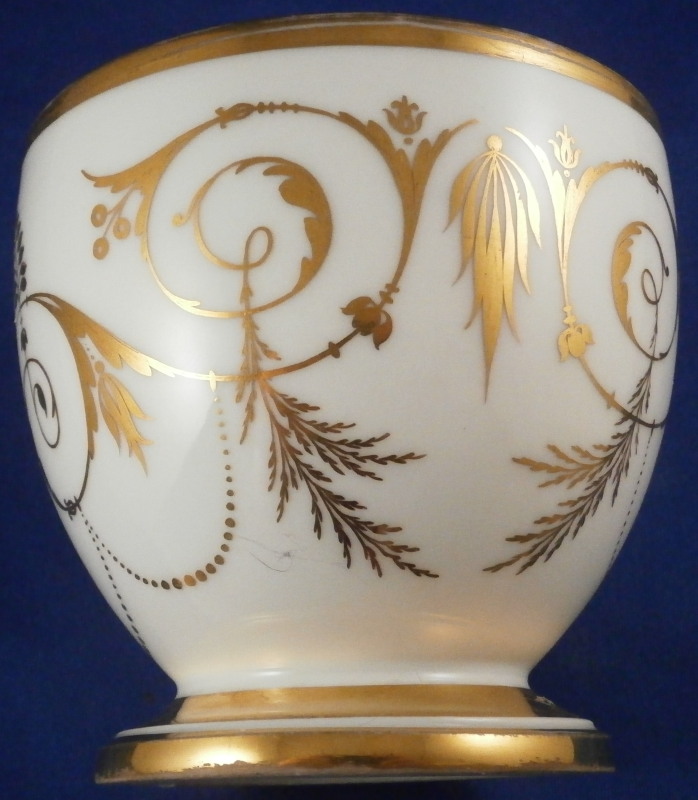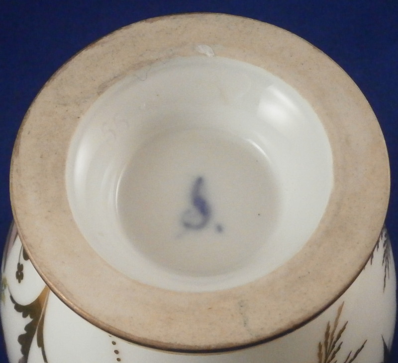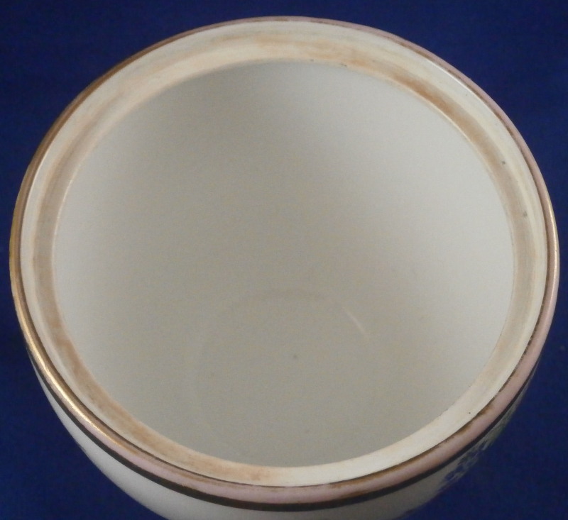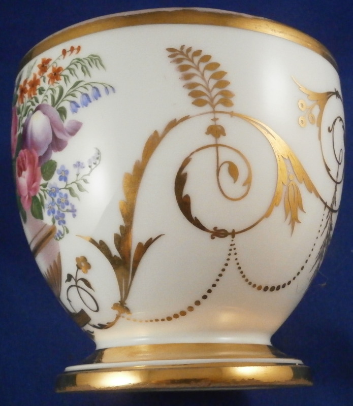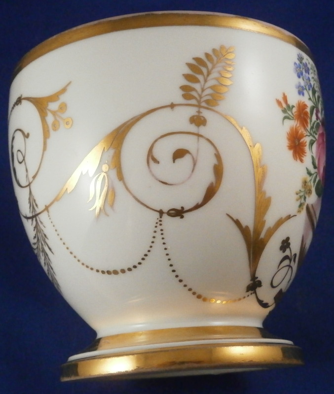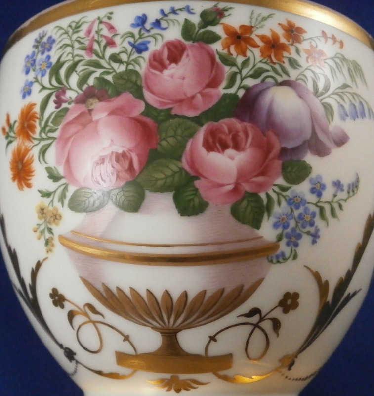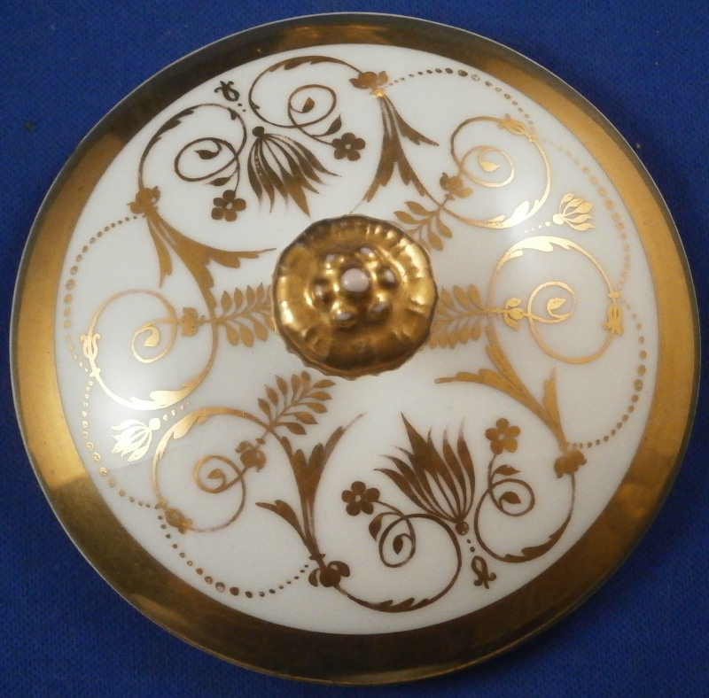 This is a really nice suagr dish with its original lid made made by Schlaggenwald in the early 19th century. It is hand painted with a superb floral arrangement coming out of a gold and pink urn / vase on the front as well as lots of fancy gilding all around as shown. Same gilding on the lid. One of the nicest piece I have ever seen by them! One can definitely see the French / Paris influence as well as that of Vienna on this piece. A very special piece from this maker for sure. The sugar dish is in great condition with some minor wear to the gilding mostly to the top edge of the main body where the gilding is gone quite a bit but otherwise is it almost perfect in that department as well. The piece is marked with the under glaze blue script S. mark used before 1830 as well as an impressed number 55. The piece including the finial is 4.625 inches tall and 3.75 inches in diameter. I also have the matching creamer and two cups and saucers if anyone is interested in a matching set. Please email me for more information or photos.