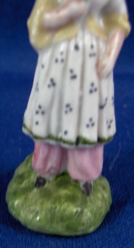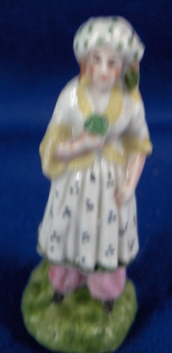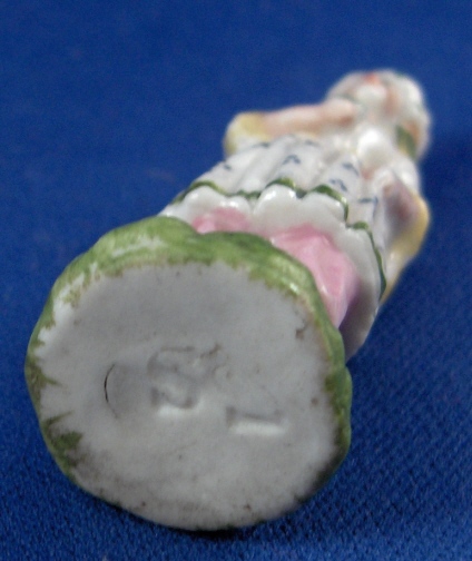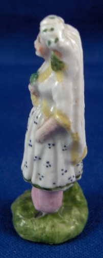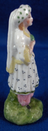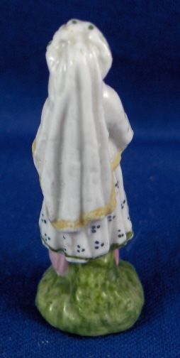 This is a miniature lady figurine made by Schlaggenwald in the mid 19th century. I was told she is probably a pipe tamper which would make her even more spectacular. Schlaggenwald was founded by Georg Paulus in 1793. The Greiners took it over around 1800 and in 1808 Lippert & Hass took it over from them. It was still around after 1945. The figurine is nicely modeled and handpainted especially for a miniature! She is wearing some type of veil and is holding a flower so it might have been made for a wedding. The figurine is in perfect condition. It is marked with the impressed S mark as well as an impressed 1. She is 2 inches tall and the base is 0.75 inches in diameter. Please email me for more information or photos.