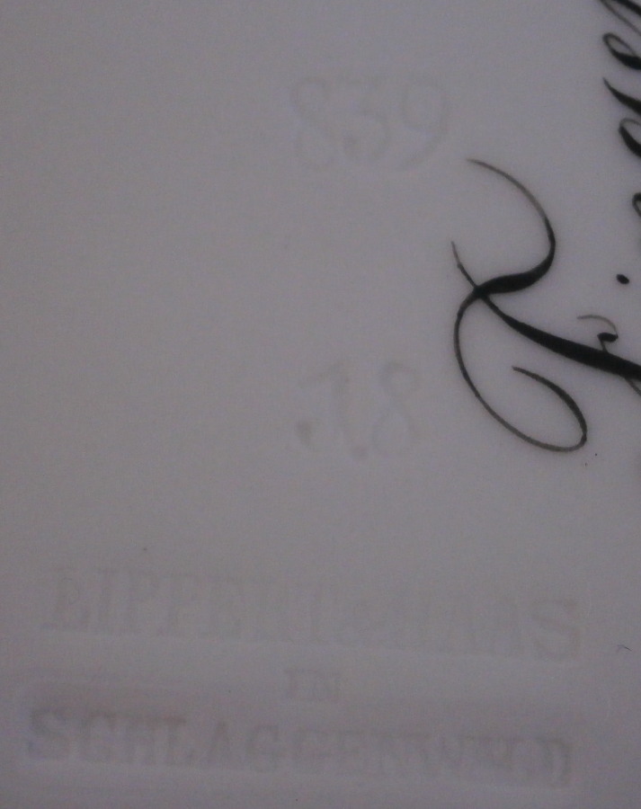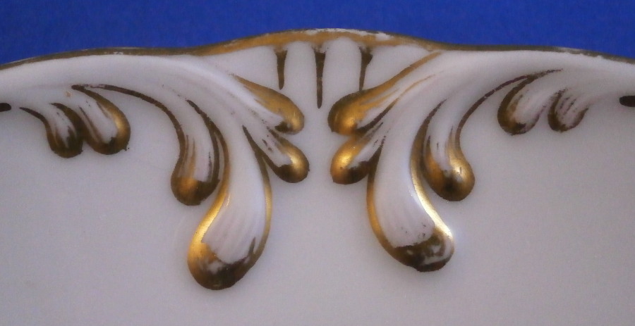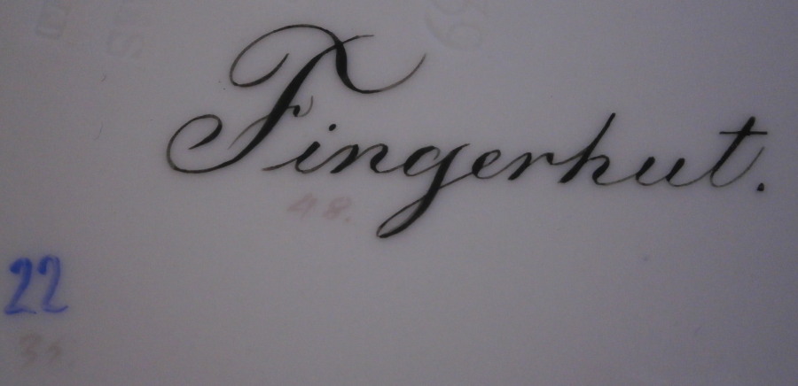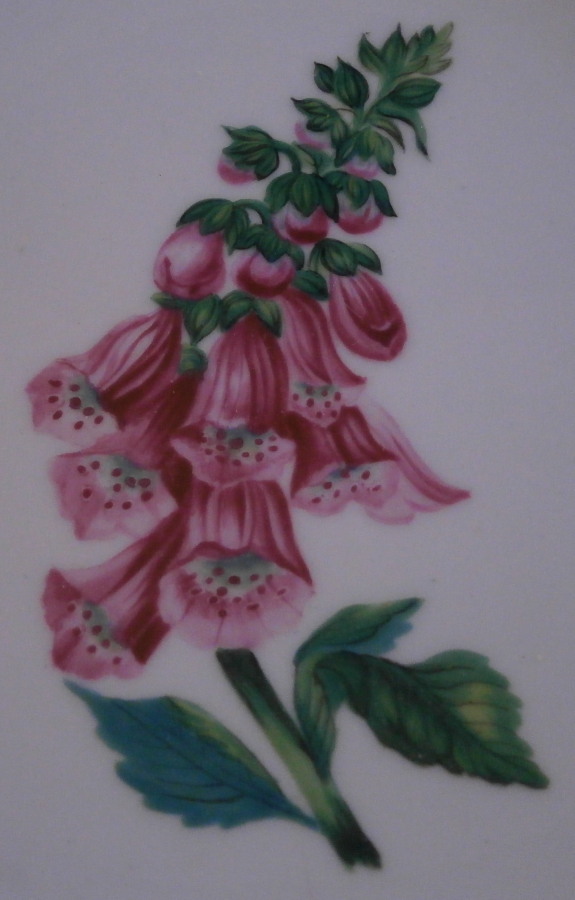 This is a plate made by Schlaggenwald in the mid 19th century around 1840. Schlaggenwald was founded by Georg Paulus in 1793. The Greiners took it over around 1800 and in 1808 Lippert & Hass took it over from them. It was still around after 1945. The plate has a nice shape to it with the relief design jutting into the rim from the edge highlighted with gilding and the superb hand painted flower in the center in this case being the poisonous Foxgloves plant which is very pretty. It has a piece of the green stalk with two green leaves and the bell shaped pink fowers coming off it. The plate is in good condition with a little wear to the gilding but it displays very nicely as shown in the pictures. The piece is marked with the impressed Lippert & Haas In Schlaggenwald mark as well as an impressed 839 for 1839 (similar to Vienna ), another impressed letter and number and three different painter's marks - a 22 in blue, a 35. in black and a 48. in black as shown. The name of the flower in black script on the back in German - Fingerhut. The plate is 1.25 inches tall and 7.75 inches in diameter. I have a few other plates from this set on the site if anyone is interested in a pair or more. Please email me for more information or photos.