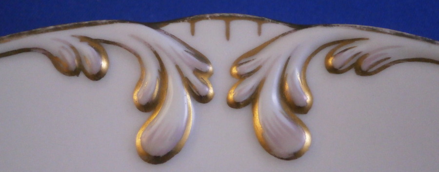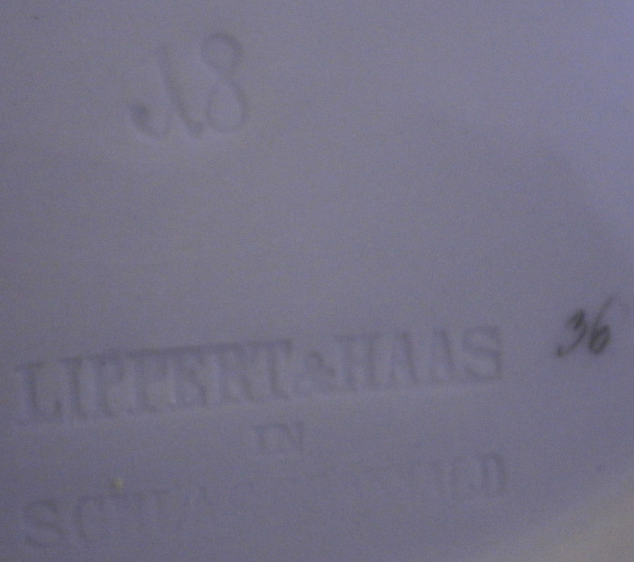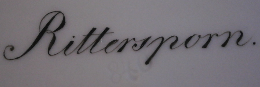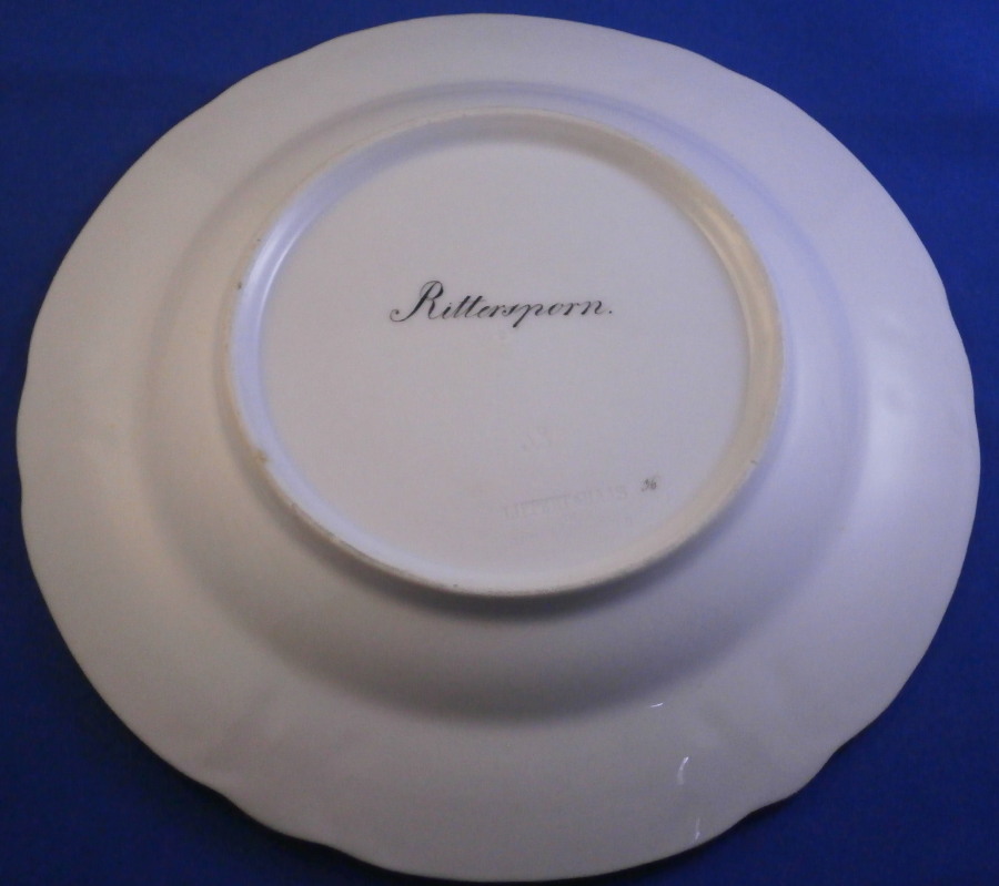 This is a plate made by Schlaggenwald in the mid 19th century around 1840. Schlaggenwald was founded by Georg Paulus in 1793. The Greiners took it over around 1800 and in 1808 Lippert & Hass took it over from them. It was still around after 1945. The plate has a nice shape to it with the relief design jutting into the rim from the edge highlighted with gilding and the superb hand painted flower in the center in this case being a nice purple Delphinium - my wife really likes these! It has the green stalk with its leaves and a few purple blossoms to it. The plate is in good condition with wear to the gilding and a spot of wear to one of the blossoms and a tiny scratch to another. It displays very nicely as shown in the pictures. The piece is marked with the impressed Lippert & Haas In Schlaggenwald mark as well as an impressed 840 for 1840 (similar to Vienna ), another impressed letter and a number mark as well as the number 36 in black as a painter's mark. The name of the flower in black script on the back in German - Rittersporn. The plate is 1.25 inches tall and 7.875 inches in diameter. I have a few other plates from this set on the site if anyone is interested in a pair or more. Please email me for more information or photos.