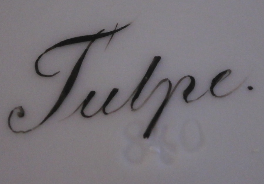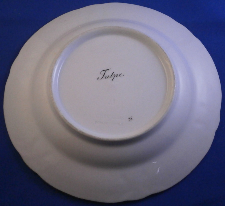 This is a plate made by Schlaggenwald in the mid 19th century around 1840. Schlaggenwald was founded by Georg Paulus in 1793. The Greiners took it over around 1800 and in 1808 Lippert & Hass took it over from them. It was still around after 1945. The plate has a nice shape to it with the relief design jutting into the rim from the edge highlighted with gilding and the superb hand painted flower in the center in this case being a nice orange and yellow tulip which is very pretty. It has a piece of the green stalk with two leaves on the sides and the blossom to the top. The plate is in good condition with wear to the gilding and a tiny scratch to the flower but it displays very nicely as shown in the pictures. The piece is marked with the impressed Lippert & Haas In Schlaggenwald mark as well as an impressed 840 for 1840 (similar to Vienna ), another impressed letter and a number 36 in black as a painter's mark. The name of the flower in black script on the back in German - Tulpe . The plate is 1.25 inches tall and 7.75 inches in diameter. I have a few other plates from this set on the site if anyone is interested in a pair or more. Please email me for more information or photos.