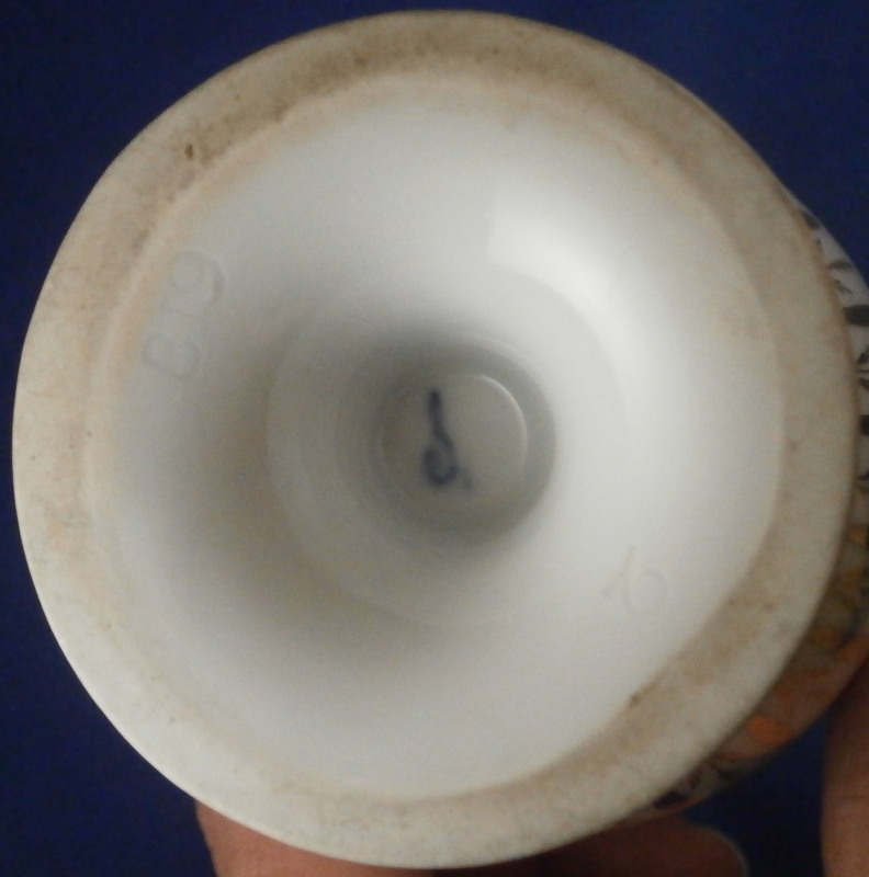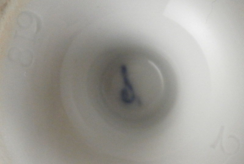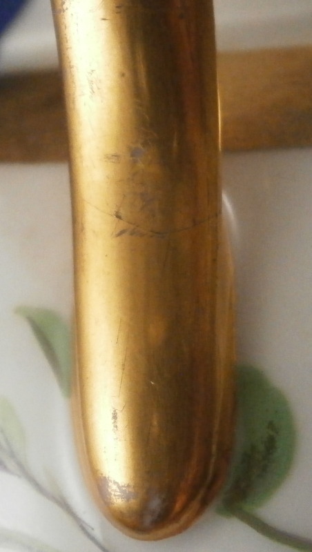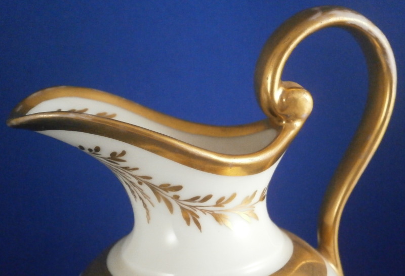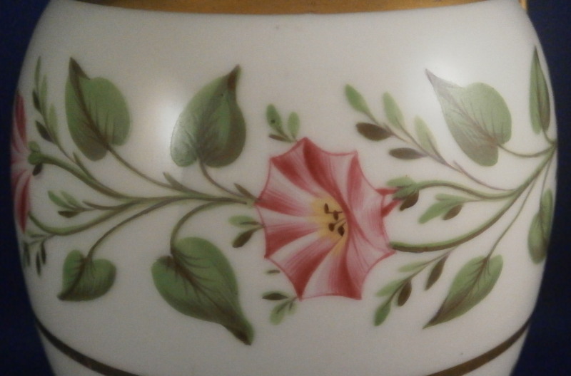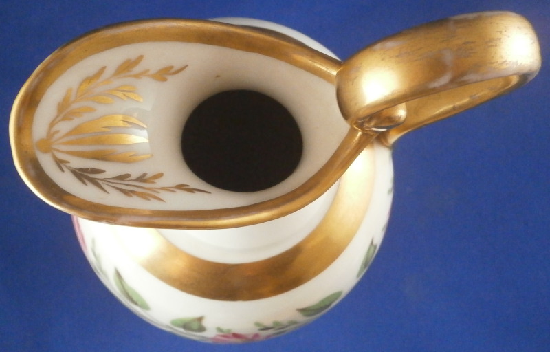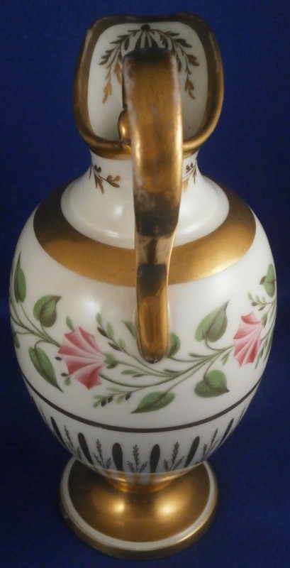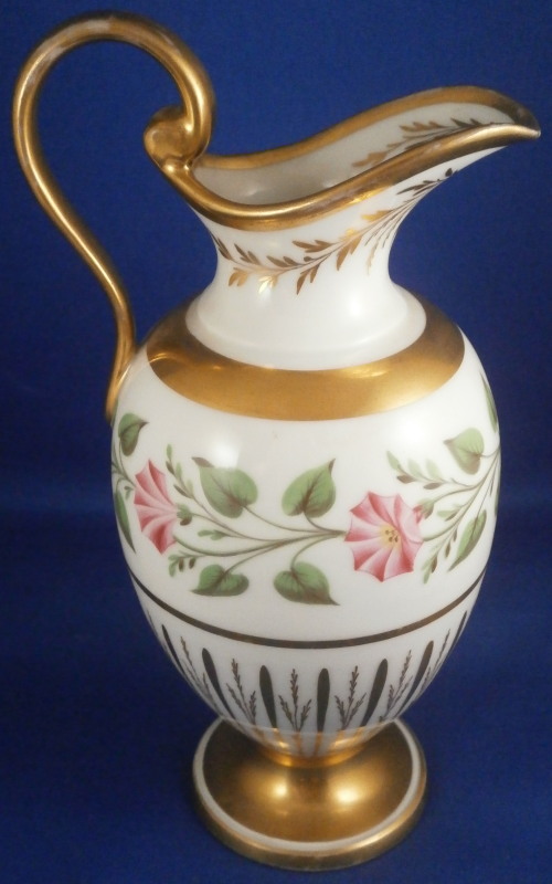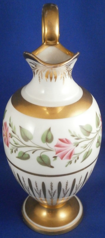 This is a pitcher or large creamer / milk jug made made by Schlaggenwald in the early 19th century. It is hand painted with a nice pink morning glory flower garland around the mid section with some nice gold trim to the bottom part and around the spout. More gilding the to edges and handle. A nice looking piece for sure. The milk jug is in great condition with some wear to the gilding mainly on the handle and a tight hard to spot hairline to the bottom terminal of the handle. It is marked with the under glaze blue script S. mark used before 1830 as well as an impressed number 2 and 819 which might be the date code. The piece including the handle is 7.625 inches tall and 3.25 inches in diameter. Please email me for more information or photos.