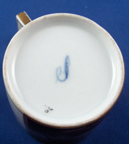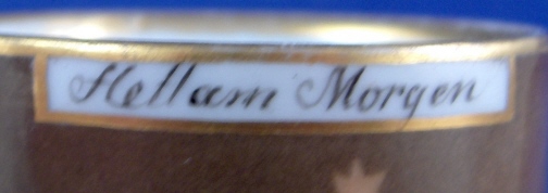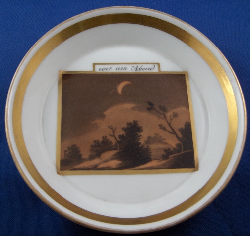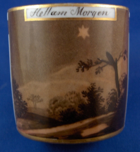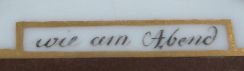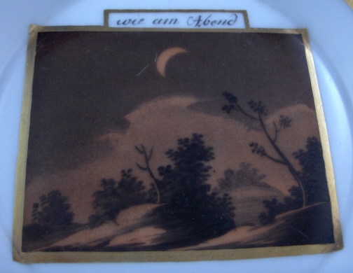 This is a rare scenic cup and saucer made by either Schlaggenwald or Schney in the late 18th century. Both pieces are handpainted with a sepia scene of a night landscape as well as some nice gold trim. The heading on the scene of the cup is - Hell am Morgen (bright in the morning) and on the saucer it is - wie am Abend (as in the evening). I am assuming it is talking about the moon and the stars here. Not sure what the meaning of it all is - maybe my love for you never wanes?! The cup and saucer are both in great condition with just a bit of wear to the gilding. The saucer is 1 inch tall and 5.375 inches in diameter. The cup is 2.375 inches tall and the same in diameter. Both the cup and the saucer are marked with the underglaze blue script S mark with the cup also having a black 2. Please email me for more information or photos.