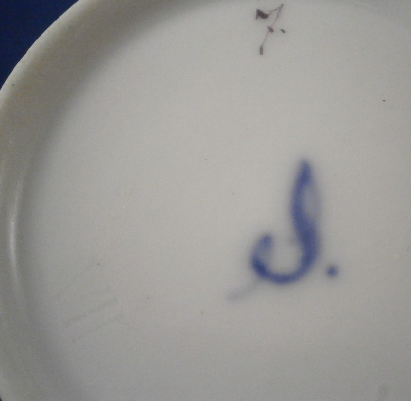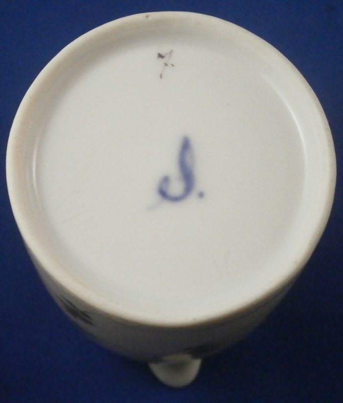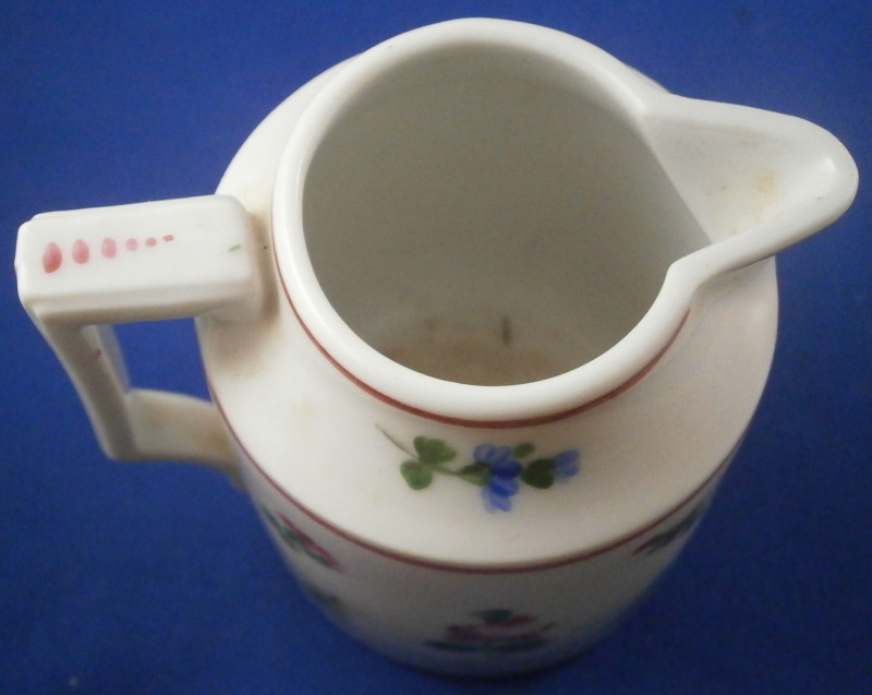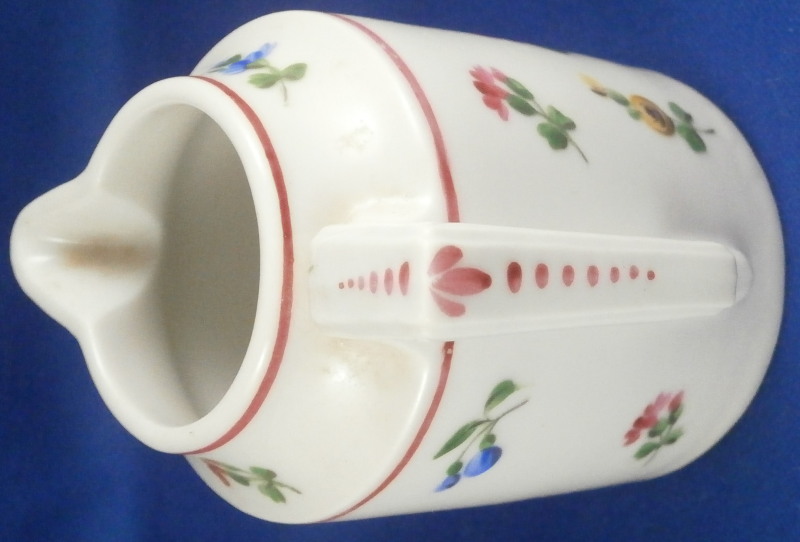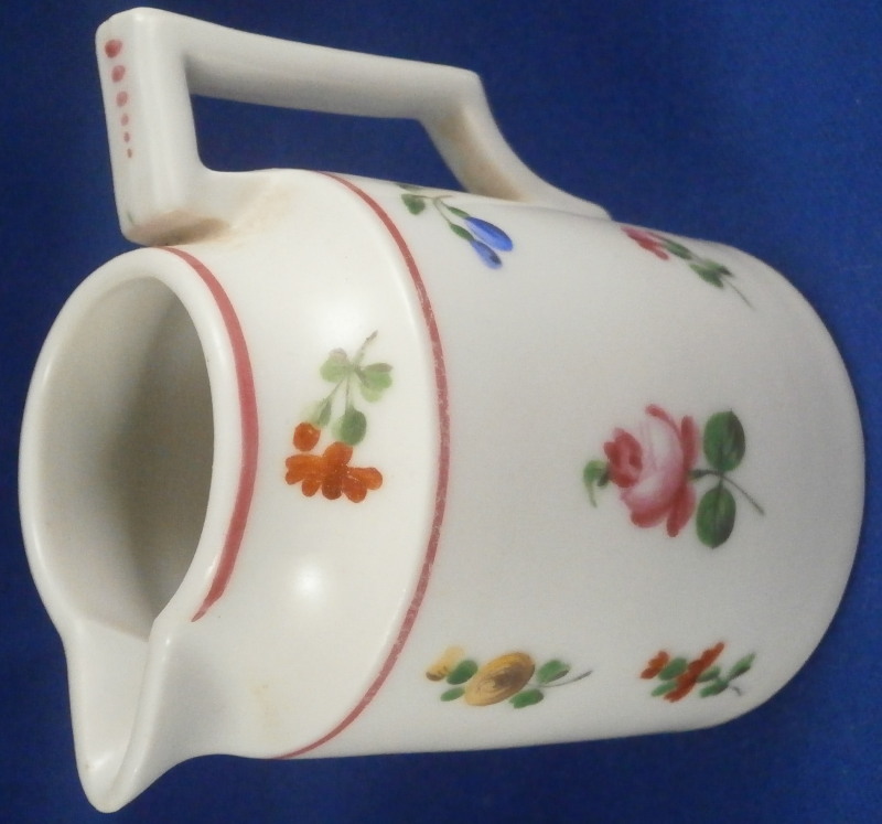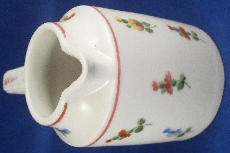 This is a cute little creamer made by either Schlaggenwald or Schney in the early 19th century century. It is hand painted with lots of scattered small single flowers as well as a puce trim. The piece is in great condition. It is 2.75 inches tall and 2.125 inches in diameter. The creamer is marked with the underglaze blue script S mark with a dot behind it as well as a black number 7, a Roman numeral VII and an impressed 16. Please email me for more information or photos.