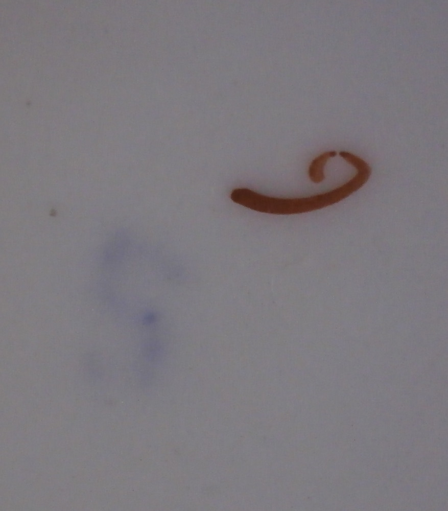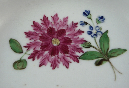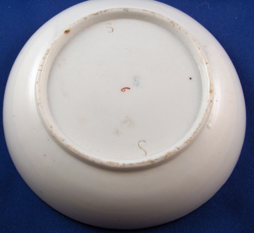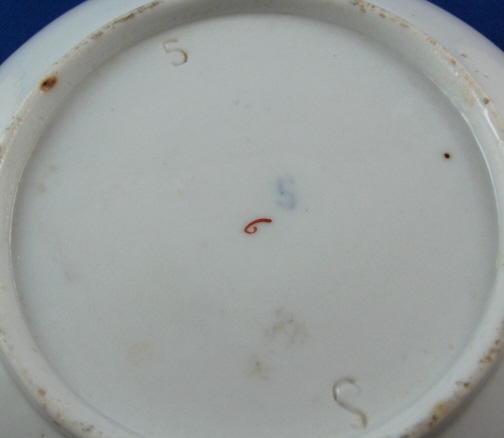 This is a saucer made by ??? in the 18th century. I first thought the mark was an under glaze letter S but none of those makers really fit the porcelain. Now I am pretty sure it is actually a letter G which would mean three options - Gera , Gotha of Germany or Gardner of Russia. I can't recall having seen this sort of flower on German porcelain and that odd light brown trim is pretty typical of Russian porcelain so I am leaning towards it having been made by Gardner in Russia. It would be a nice early piece for them. The porcelain almost feels like soft paste so it's a mystery to me! Either way the dish is hand painted with a superb large fancy flower with a smaller blue one in an arrangement as well as two smaller ones. Reddish brown trim to the rim. It is in perfect condition with very little wear and marked underneath with the script G. mark in under glaze blue as well as an incised S, an incised number 5 and a red number 6. The saucer measures 1.25 inches tall and 5.125 inches in diameter. Please e-mail me for more information or photos.