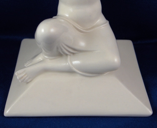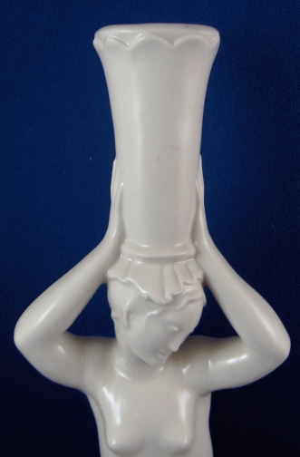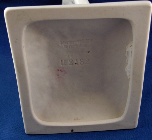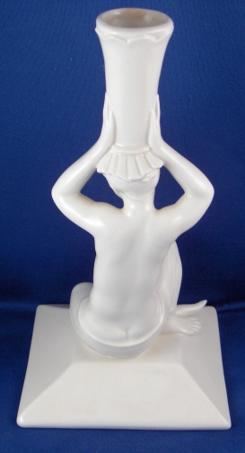 This is a figural candleholder made by the Schwarzburger Werkstätten für Porzellankunst around 1930. That means ite is one of the rare original pieces. This piece is supremely elegant and quite typical for this maker. It is of a topless lady holding an urn on her head which form the holder for the candle. The base is simply rectangular with a nice angle to it. The piece is in perfect condition with a little wax on the inside of the top from use which I am not about to clean :) The stick is 8.25 inches tall, 4.5 inches wide and 4 inches deep. It is marked with the impressed fox mark as well as the impressed model number U2182 underneath. Also the complete name of this maker is impressed underneath. Please email me for more information or other pictures.