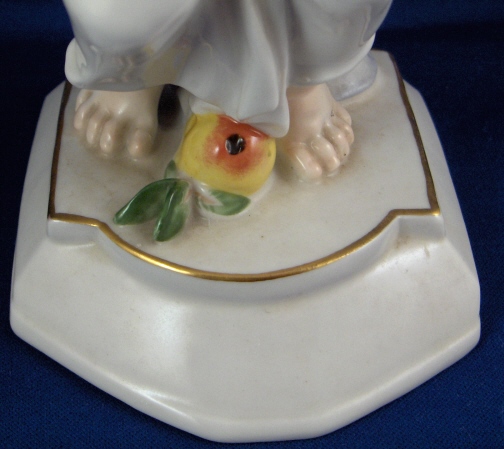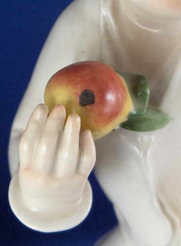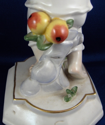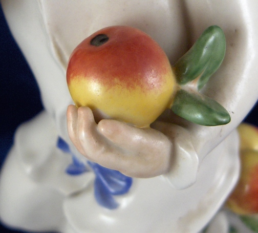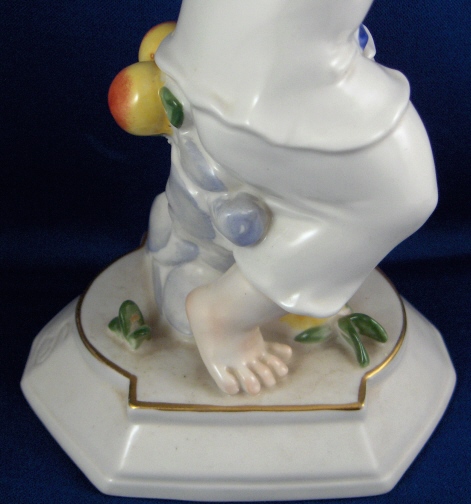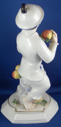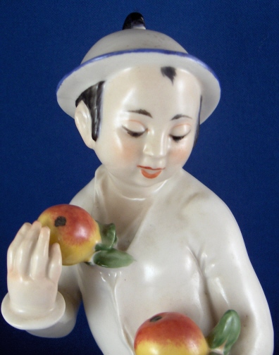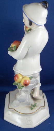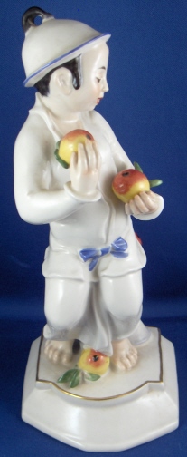 This is a superb figurine made by the Schwarzburger Werkstaetten in about 1920 when he was first designed by Martha Schlameus . That means he is one of the rare Schwarzburger Werkstätten original pieces. And also a very typical figurine for them in the style and coloration of the Art Nouveau period. It is an Asian influenced figurine holding some apples in his hands (coming home from apple picking?), one is by his feet and two are behind him. Great base with a gold trim line. The piece is in perfect condition just as good as when first made. A few small firing spots original to the making on the hat. Simple decoration makes it even more elegant I think! The piece is 9 inches tall, 3.5 inches wide and 4.875 inches deep. He is marked with the underglaze blue fox mark as well as U 524 - the model number - underneath. Also impressed on the base we find the artist initials MS impressed for Martha Schlameus. It also stated Schwarzburger Werkstatten fuer Porzellankunst impressed underneath. Please email me for more information or other pictures.