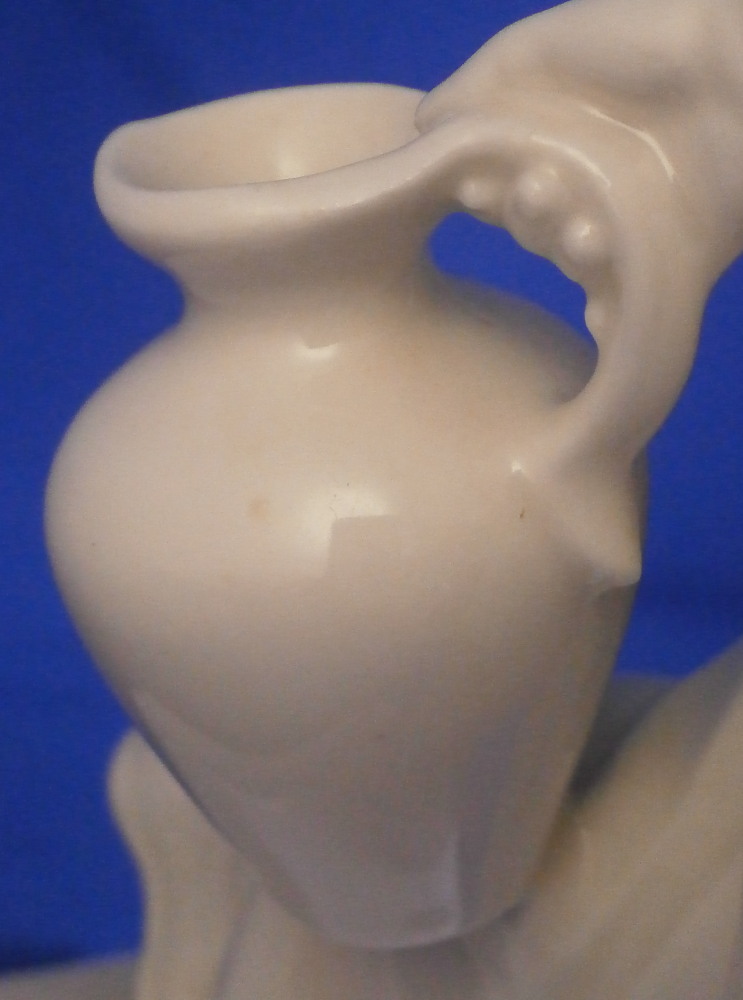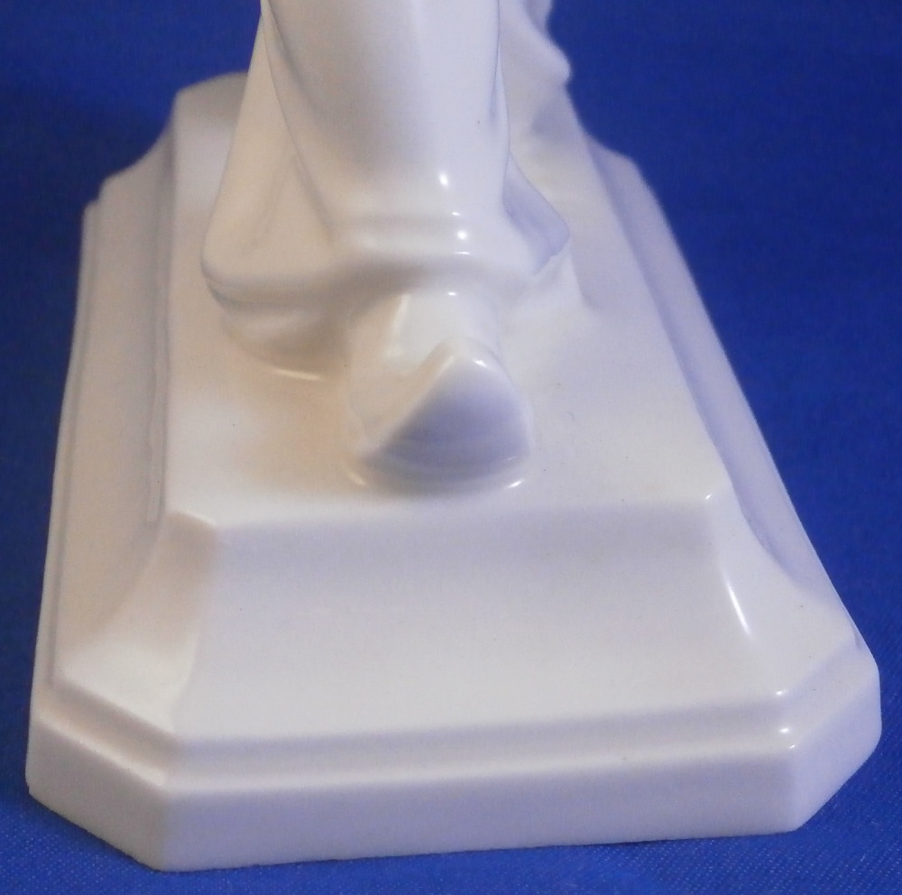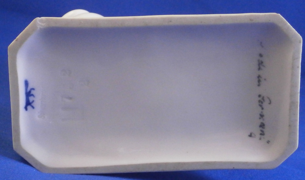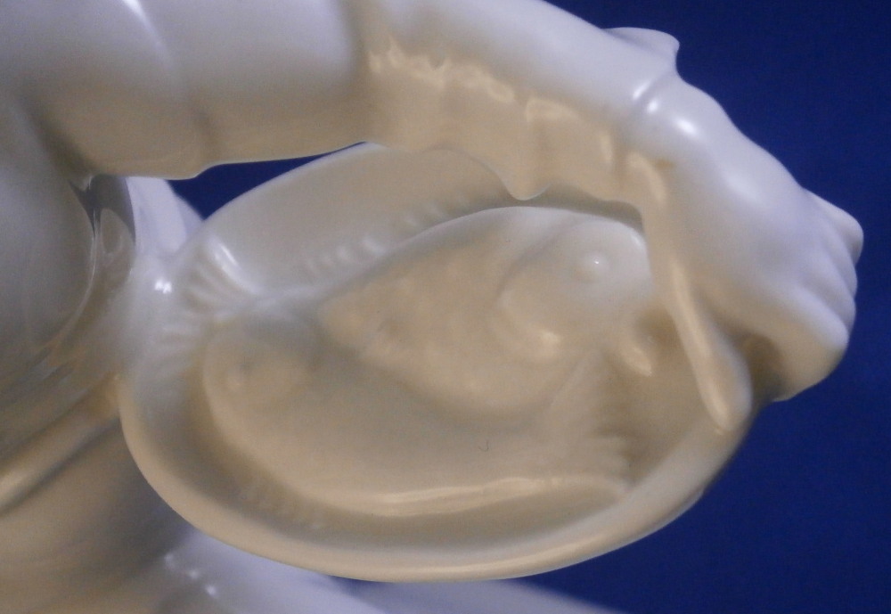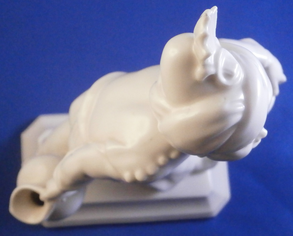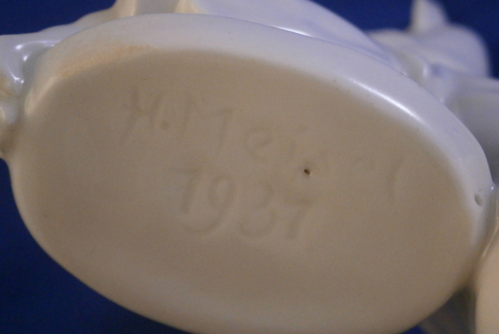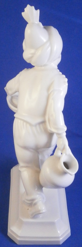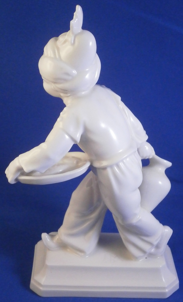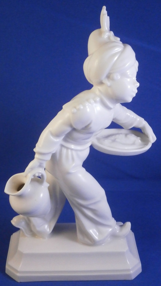 This is a figurine made by the Schwarzburger Werkstätten around 1931 when he was first designed. That means he is one of the rare original pieces. I have not come across a white version of this piece before but it is just as stunning as their painted ones (which I have an example off for sale on. The figure is of a blackmoor holding a platter with two fish on it in one hand and a jug in his other hand. He is wearing a turban with a decoration to the front and a nice flowing set of pants. Typical rectangular base with a nice shape to it. The piece is in great condition with a tiny flat chip to the bottom of the base almost invisible from the side and he displays perfectly! The piece is the smaller version being about 7.25 inches tall, 2.125 inches wide and 4.375 inches long. He is marked with the under glaze blue fox mark as well as the model number U 752 over 2 and the impressed stamp stating Schwarzburger Werkstaetten für Porzellankunst. Impressed on top of the base we find the artist initials HM for Hugo Meisel. In blue we have Made in Germany above glaze on the underside. H.Meisel 1931 underneath the fish platter. Please email me for more information or other pictures.