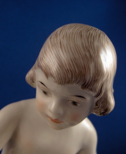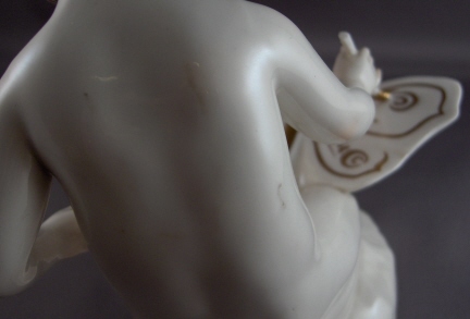 This is a girl painting a butterfly figurine made by the Schwarzburger Werkstaetten around 1925 when she was first designed. That means she is one of the rare original pieces. And a very typical figurine for them in style and coloration. Always simple and elegant and in the Art Nouveau style. She is holding a brush pot in her left hand and painting the butterfly that sits in front of her with the brush in her right hand. The piece is in great condition with some roughness to spots on her back. Must have scraped somewhere a bit. Doesn't take away from the piece at all. She is 5.25 inches tall, 4.625 inches wide and 3.25 inches deep. She is marked with the impressed fox mark as well as U. 538. underneath. Also the impressed stamp (be it lightly) stating Schwarzburger Werkstaetten fuer Porzellankunst. On the side of the base a stamp with the artist name - Georg Wolf. Please email me for more information or other pictures.