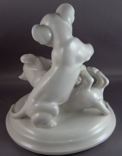 This is a figurine of a pair of lion cubs playing made by the Schwarzburger Werkstaetten around 1930. It was designed by Etha Richter who was one of the most important animal modelers of the Jugendstil / Art Deco period. The one is one top of the other that is lying down on his back. All on a rounded base. Again a very simple figurine yet so elegant. That is why these figurines are so collectable. The figurine is in great condition with a glaze line to the tail of the one standing up. The figurine is marked with the impressed fox mark as well as U. 1097. underneath. Also the impressed stamp Schwarzburger Werkstaetten fuer Porzellankunst. The piece is 5.5 inches tall, 5.375 inches wide and 4.625 inches deep. Please email me for more information or other pictures.