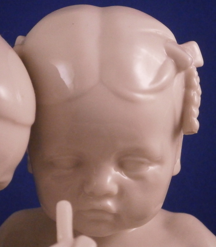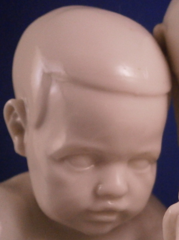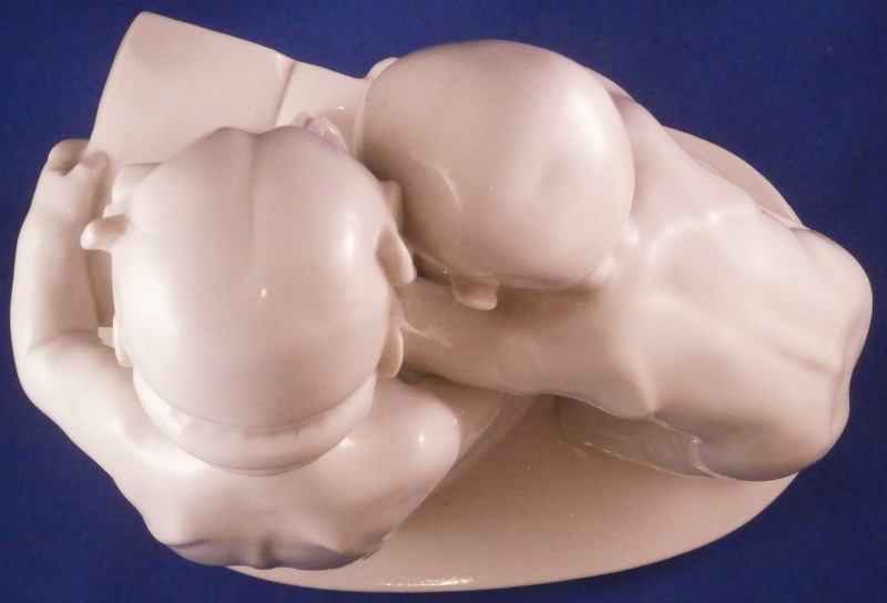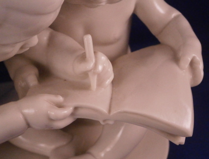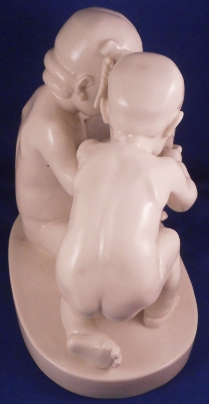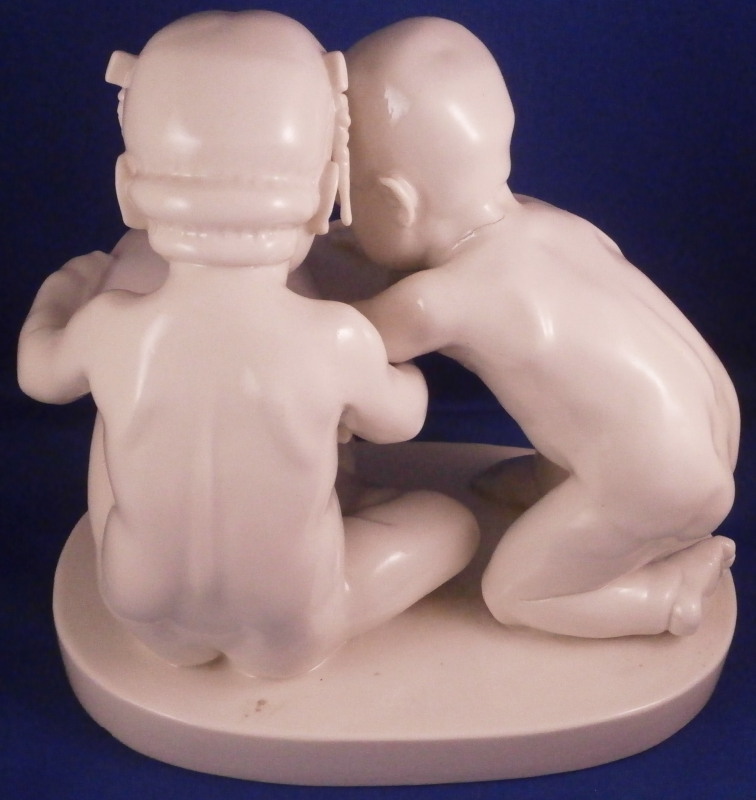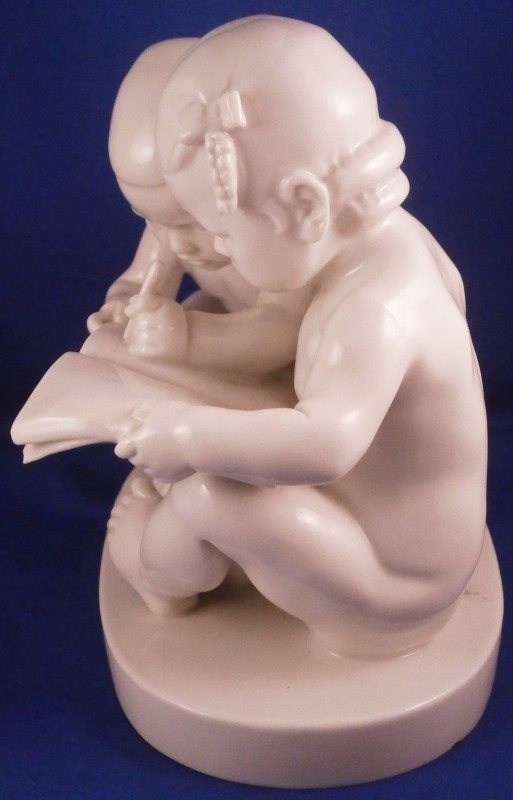 This is a nice figurine made by the Schwarzburger Werkstätten für Porzellankunst around 1925. Modeled by Otto Thiem during this period. This piece is left in the white and the superb off white paste of this maker means it looks quite elegant without being painted! The figure is of a young boy and girl next to each other with the girl holding a book open and the boy writing in it. Plain oval base. The girl has pig tails in her hair which are super cute.The figurine displays very nicely but has a small chip to the front right corner of the book as well as some manufacturing flaws - a small firing crack in the back of the next of the boy and a flaw to the base behind the girl's butt. Nothing that takes away from the piece! The piece is 6.25 inches tall, 6.625 inches wide and 4.125 inches deep. It is marked with the impressed fox mark underneath as well as the impressed model number U29 underneath. Also the complete name of this maker is impressed underneath. The fox has a cut mark through it denoting it being a second choice because of the firing cracks. Please email me for more information or other pictures.