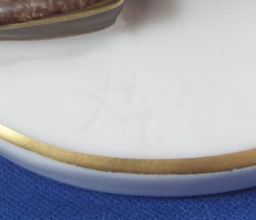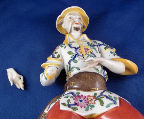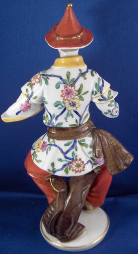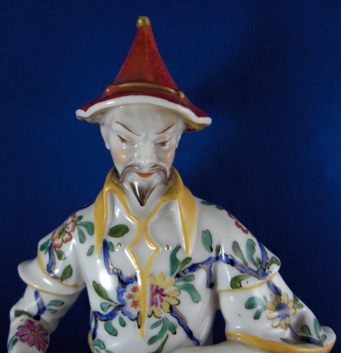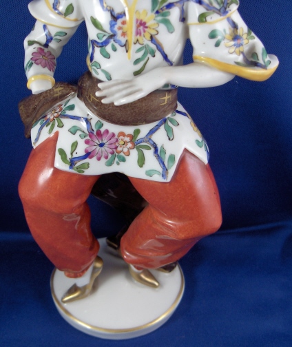This is a figurine made by the Schwarzburger Werkstaetten around 1925 when he was first designed. A very typical figurine for them in the style and coloration of the Art Nouveau period. It is an Asian man dressed in a colorful outfit with a nice hat, a floral shirt and red pants. The piece is in great condition except his right hand was cleanly broken off and was reglued by me. Very hard to see. The piece is 10.125 inches tall, 4.25 inches wide and 3 inches deep. He is marked with the blue fox mark as well as the impressed model number U545 underneath. An impressed #3 and also the the impressed stamp stating Schwarzburger Werkstaetten fuer Porzellankunst. The stamp was ground out mostly and the fox has a slash through it denoting a second choice piece. He has a hard to see flaw by his groin which matters very little when on display if at all. On the side of the base we find the artist name impressed - H.M. for Hugo Meisel . Please email me for more information or other pictures.