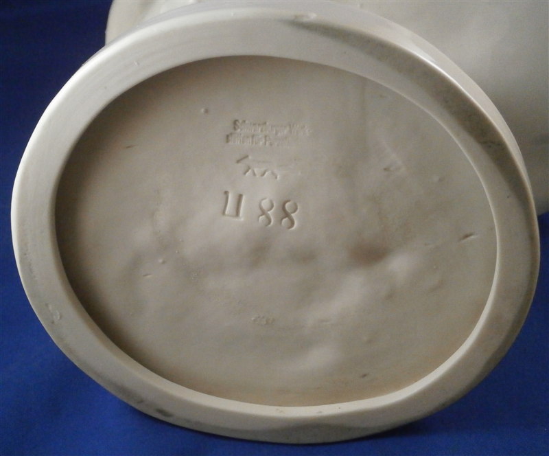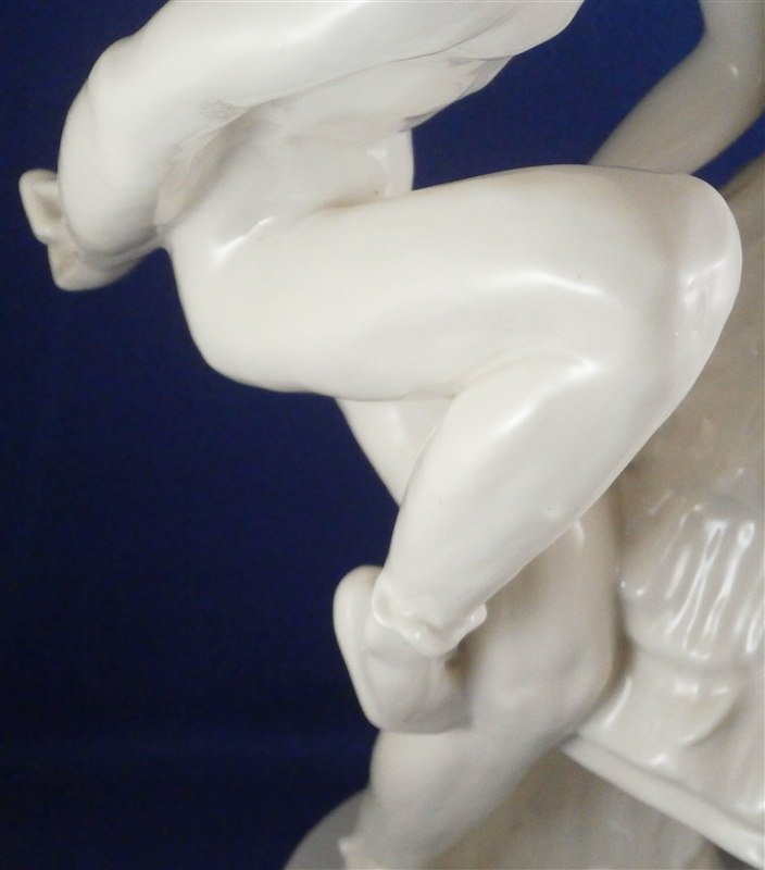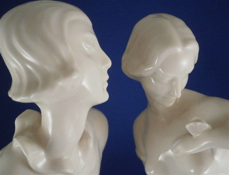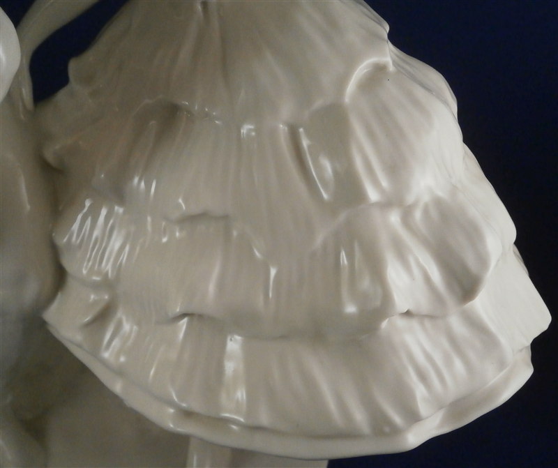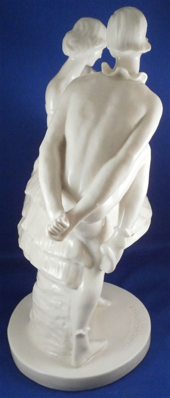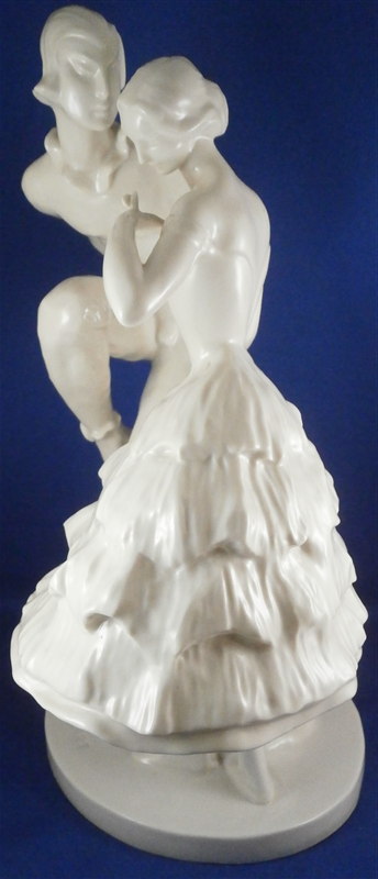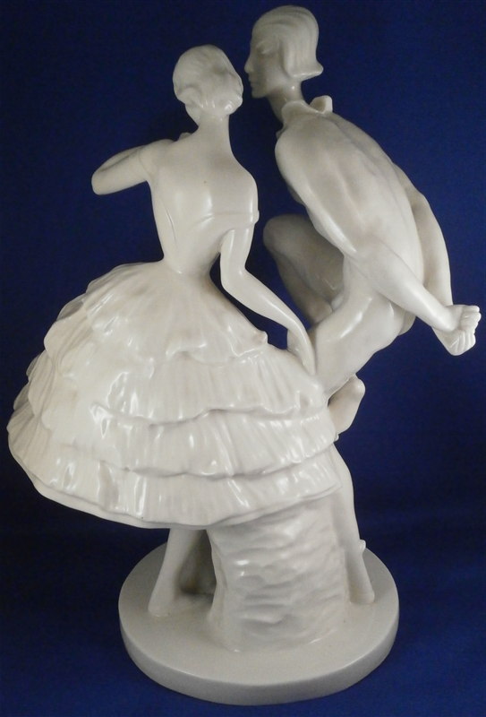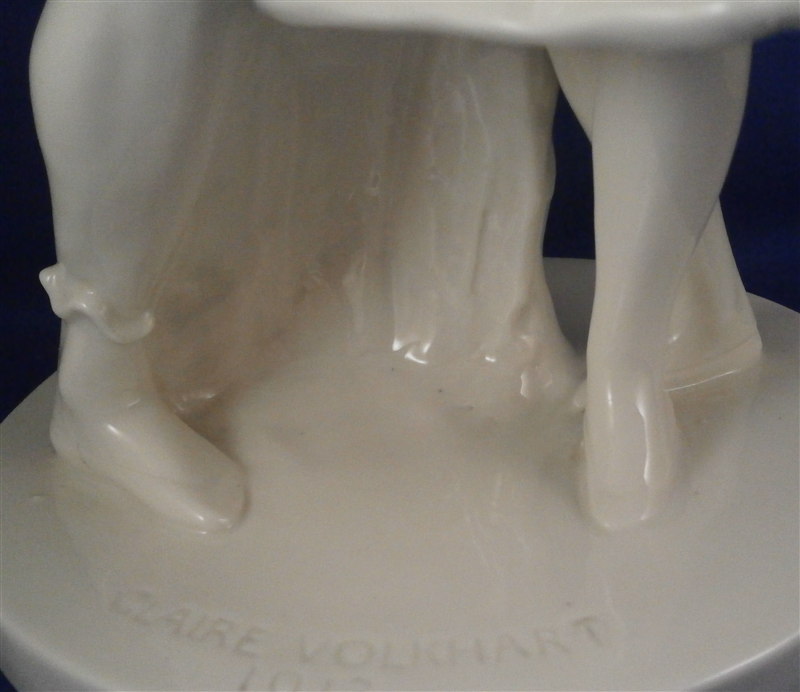 This is a large and superb figurine made by the Schwarzburger Werkstaetten around 1913 when it was first designed by Claire Volkhart . It is of a ballet dancer couple that is nicely modeled and left in the white to show off all the detail of the porcelain itself. She has a butterfly on her left hand which is a nice addition. A very well done and elegant piece and rather large! The figurine is 13 inches tall, 9.5 inches wide and 6 inches deep. The figure is marked with the impressed fox mark as well as an impressed U88 for the model number and the impressed stamp stating Schwarzburger Werkstaetten fuer Porzellankunst . On the front of the base we find the artist name as well as the year 1913 impressed. The piece is in perfect condition but there are some marks of where the firing supports were attached as shown to the underside of her skirt and his right arm. There is one spot on the bottom edge in the front where something appears to have stuck during the firing and then chipped off but it doesn't take away from the piece at all. Please email me for more information or other pictures.