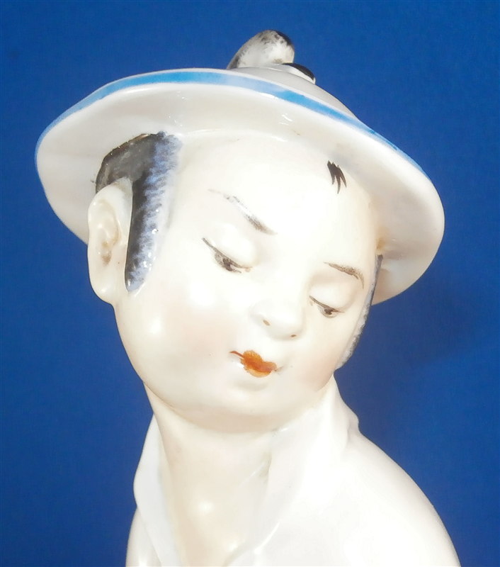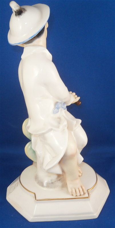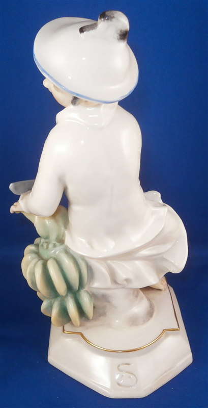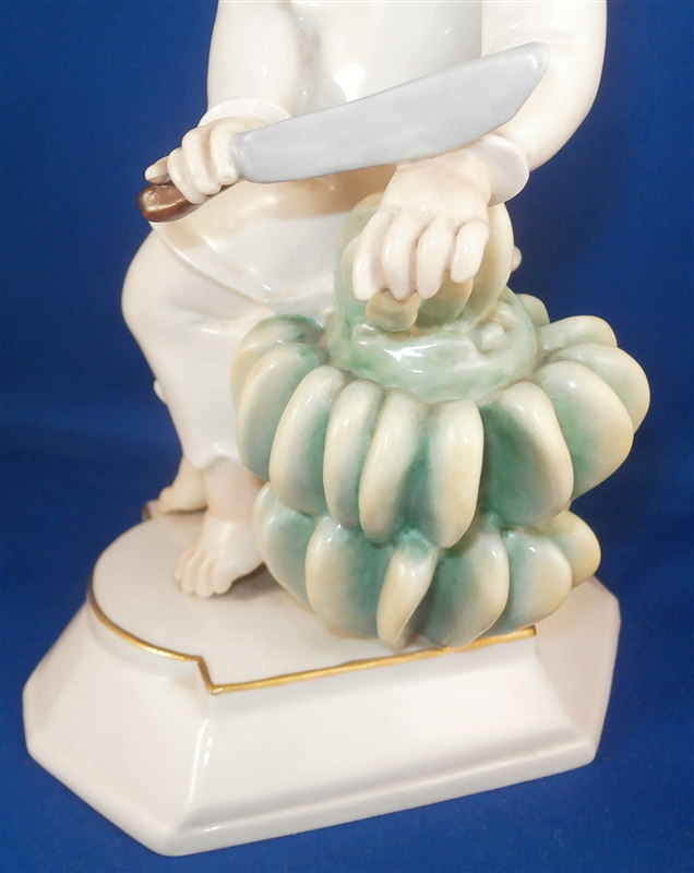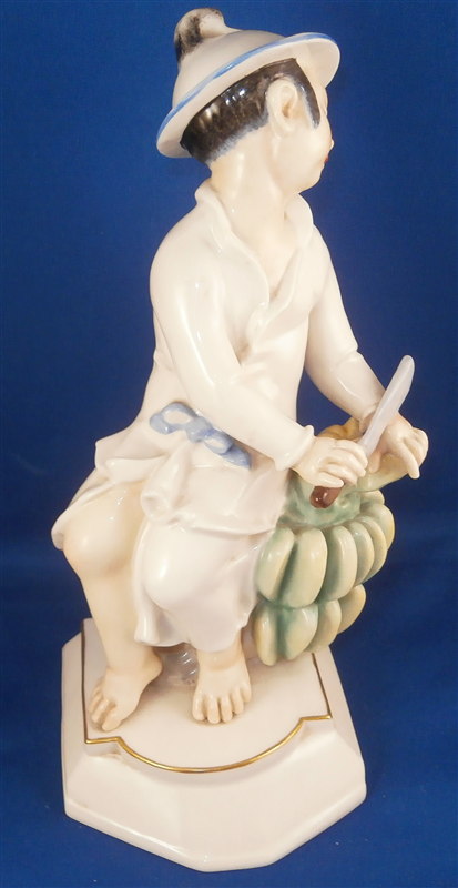 This is a superb figurine made by the Schwarzburger Werkstaetten in about 1920 when he was first designed by Martha Schlameus . That means he is one of the rare Schwarzburger Werkstätten original pieces. And also a very typical figurine for them in the style and coloration of the Art Nouveau period. It is an Asian influenced figurine holding a machete after just finishing to cut down some bananas off a tree. Great base with a gold trim line. The piece is great condition with just a small glaze line on the side of the base as shown which doesn't take away from it nor does it show when on display! The simple decoration of these figures makes it even more elegant I think! The piece is 8.5 inches tall, 3.75 inches wide and 5 inches deep. He is marked with the underglaze blue fox mark as well as U 525 - the model number - underneath. Also impressed on the base we find the artist initials MS impressed for Martha Schlameus. It also states Schwarzburger Werkstatten fuer Porzellankunst impressed underneath as well as some sort of red mark which might be a painter's mark. I have the entire set of four of them that look amazing together and are very hard to find. Please email me for more information or other pictures.