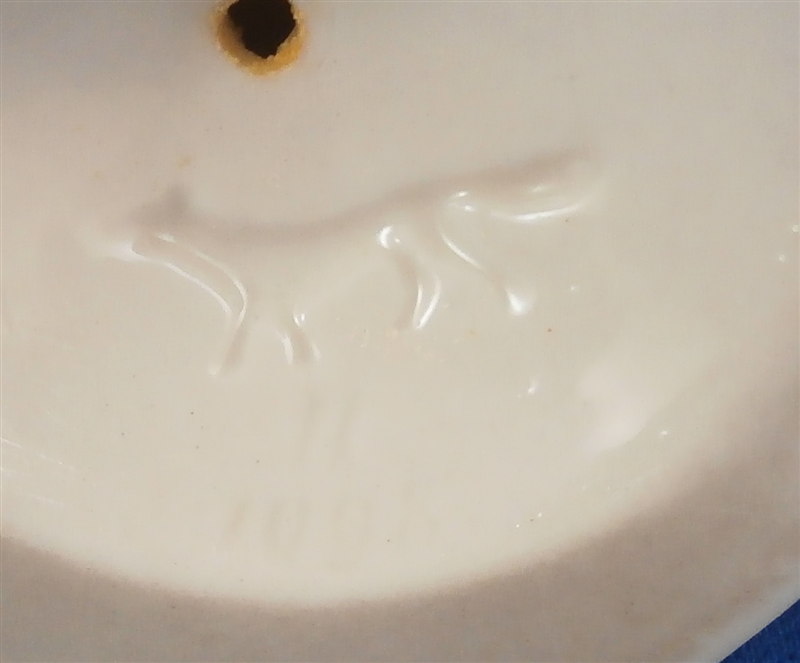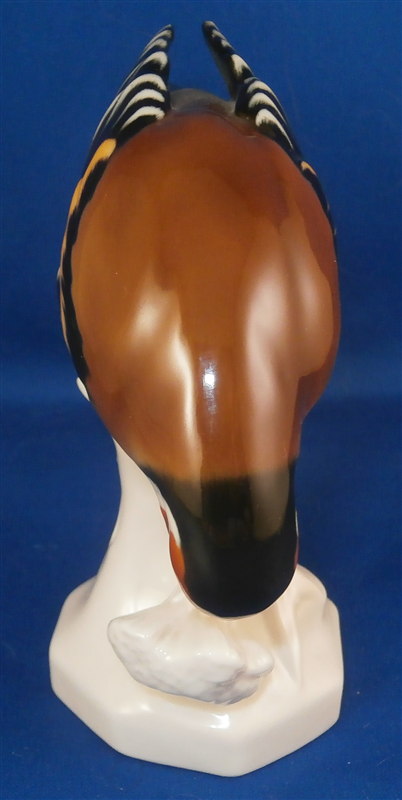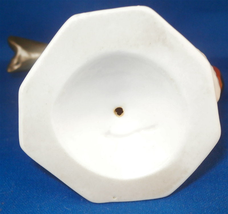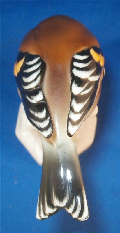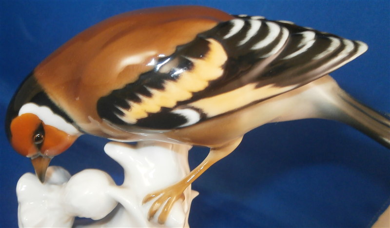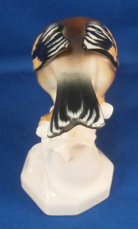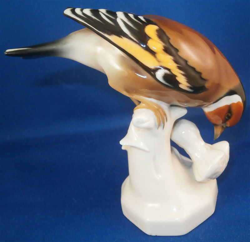 This is a figurine of a bird made by the Schwarzburger Werkstaetten in the earlier part of the 20th century when it was first designed. That means it is one of the rare original pieces and not a later copy! I think I ahve seens this design by Unterweissbach as well but that would be a bit later. The bird is superbly handpainted in very naturalistic colors and looks almost real. He sits on top of a thistle which is is pecking at. The piece is in perfect condition. It is 4.625 inches tall, 2.25 inches wide and about 4.375 inches long. The piece is marked with the impressed fox mark as well as the impressed model number I cannot make out easily but it seems to be U1098. Probably one of their last models. Please email me for more information or other pictures.