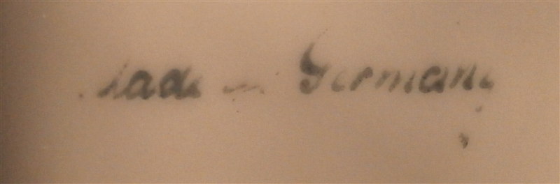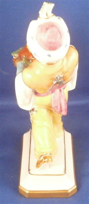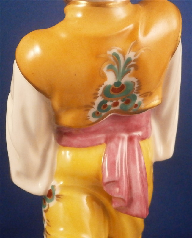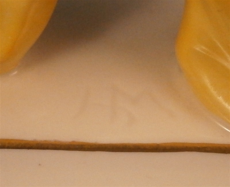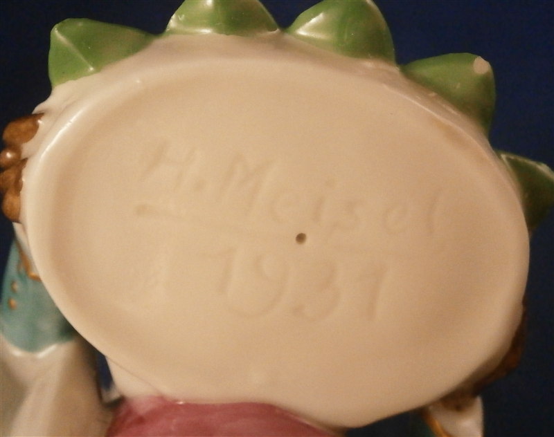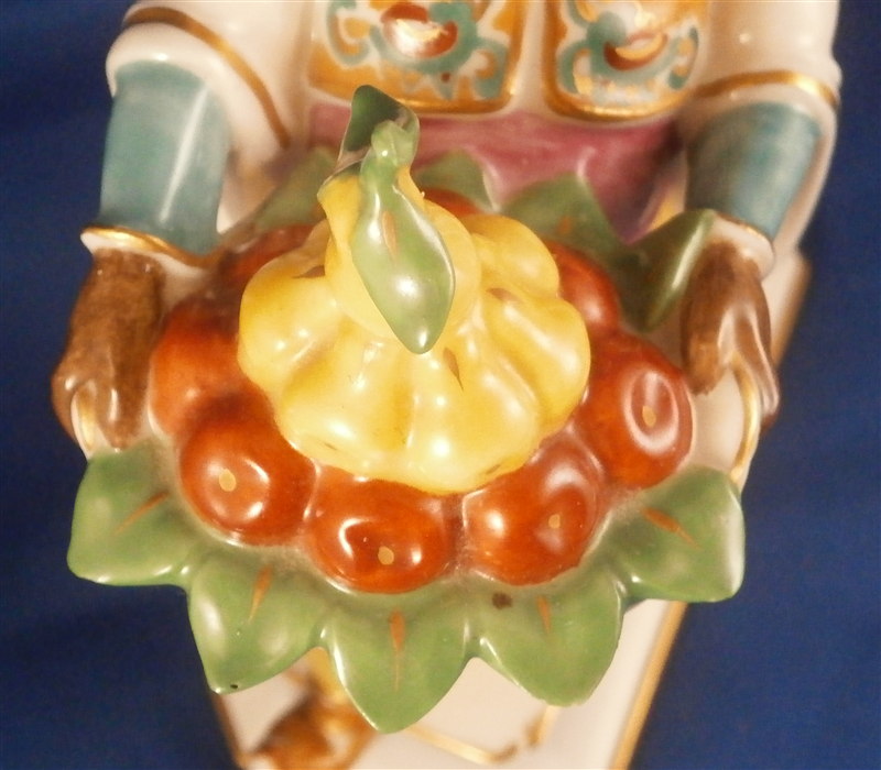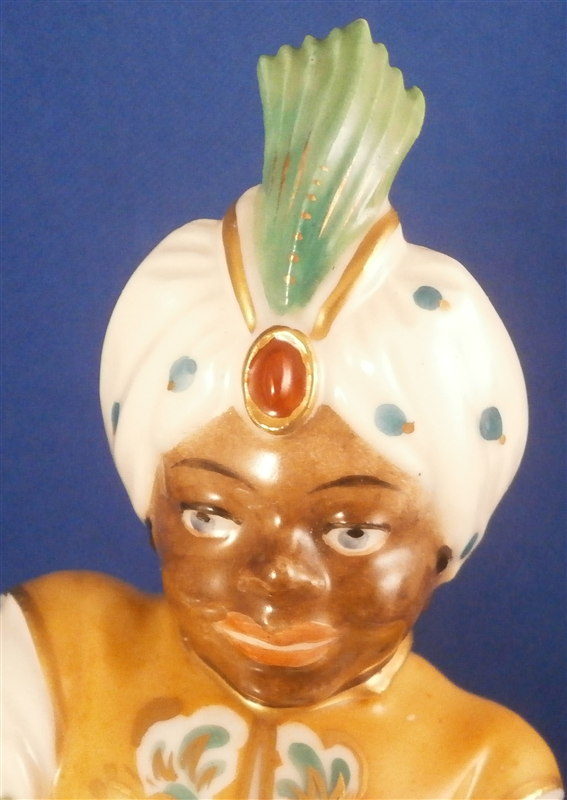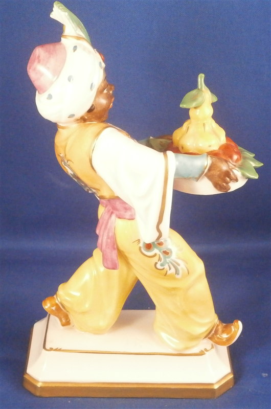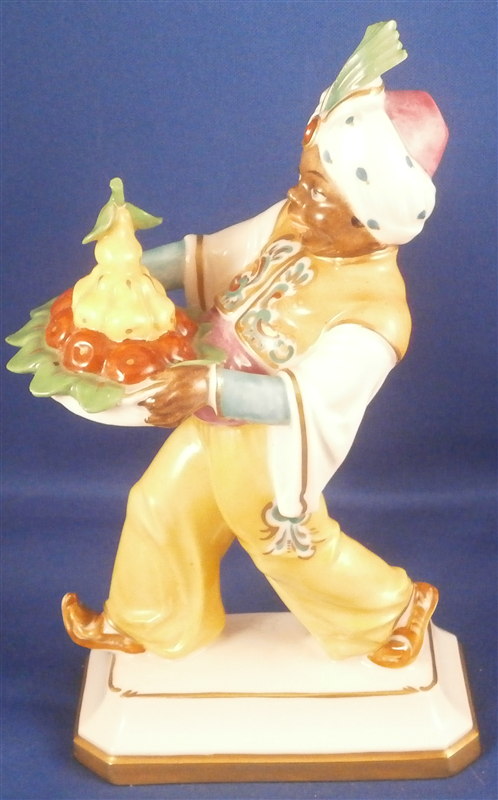 This is a figurine made by the Schwarzburger Werkstaetten around 1931 when he was first designed. That means he is one of the rare original pieces. And also a very typical figurine for them in the style and coloration of the Art Nouveau period. One of a set of four which is a complete set for these! It is a blackmoor holding a fruit platter in front of him. He is wearing a turban and is handpainted with a neat colorful design. Mostly yellow ground color with a fancy green, gold and red design to it. The piece is in perfect condition except for a teeny chip to the underside of one leaf on the rim of the platter which doesn't take away from the piece at all! The piece is the smaller version being 7 inches tall, 2.25 inches wide and 4 inches long. He is marked with the underglaze blue fox mark as well as U 732 over 2 underneath. Also impressed on the base we find the artist initials HM impressed for Hugo Meisel. Underneath the platter is the impressed H. Meisel and the year 1931 . Also the impressed stamp (be it lightly) stating Schwarzburger Werkstaetten fuer Porzellankunst. In blue we have Made in Germany above glaze. Sorry about the pics - still learning the ins and outs of the new camera! Please email me for more information or other pictures.