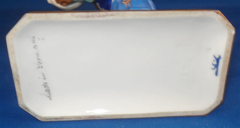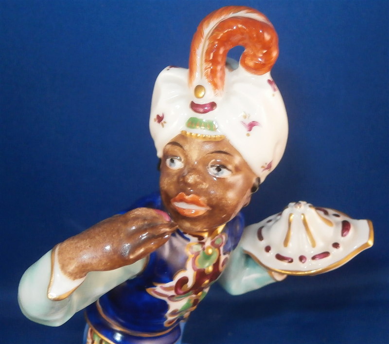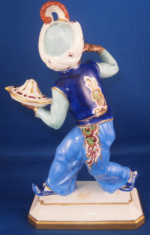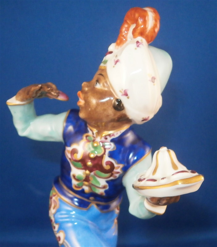 This is a figurine made by the Schwarzburger Werkstaetten around 1931 when he was first designed. That means he is one of the rare original pieces. And also a very typical figurine for them in the style and coloration of the Art Nouveau period. One of a set of four which is a complete set for these! It is a blackmoor holding a cake or some sort of dessert platter in front of him - sneaking a cookie in from his other hand :) He is wearing a turban and is handpainted with a neat colorful design. Mostly blue ground color with a fancy green, gold and red design to it. The piece is in perfect condition except for one small scratch to the gold trim around the base which doesn't take away from the piece at all! The piece is the smaller version being about 7 inches tall, 2.25 inches wide and 4 inches long. He is marked with the underglaze blue fox mark as well as U 731 over 2 underneath. Also impressed on the base we find the artist initials HM impressed for Hugo Meisel. Also the impressed stamp (be it lightly) stating Schwarzburger Werkstaetten fuer Porzellankunst. In blue we have Made in Germany above glaze. Please email me for more information or other pictures.
