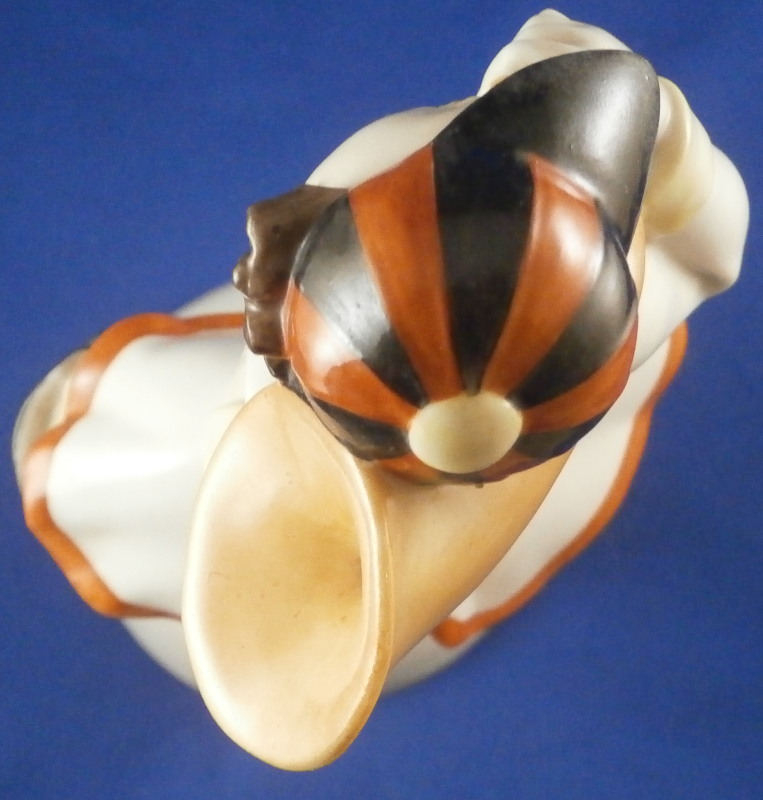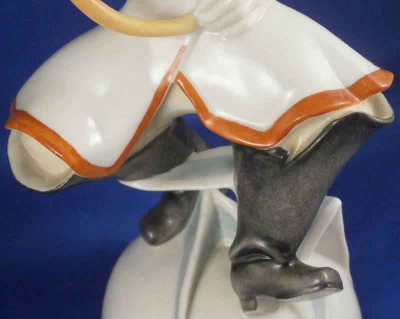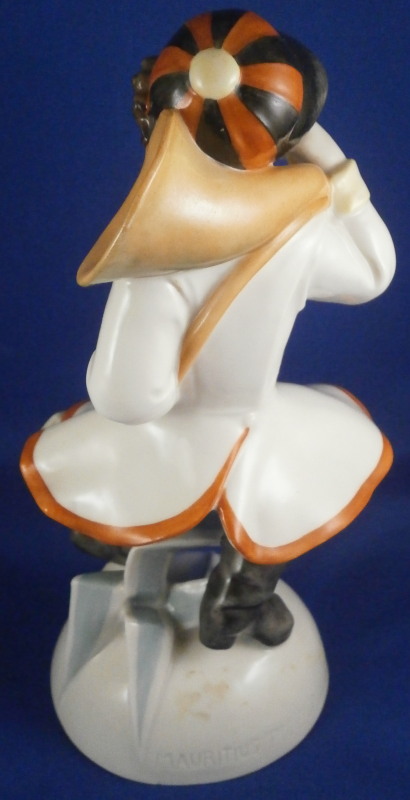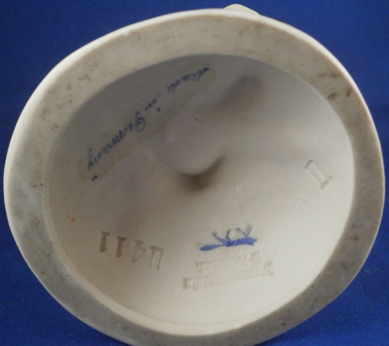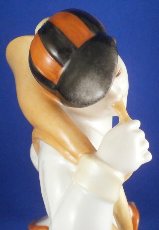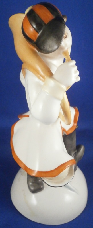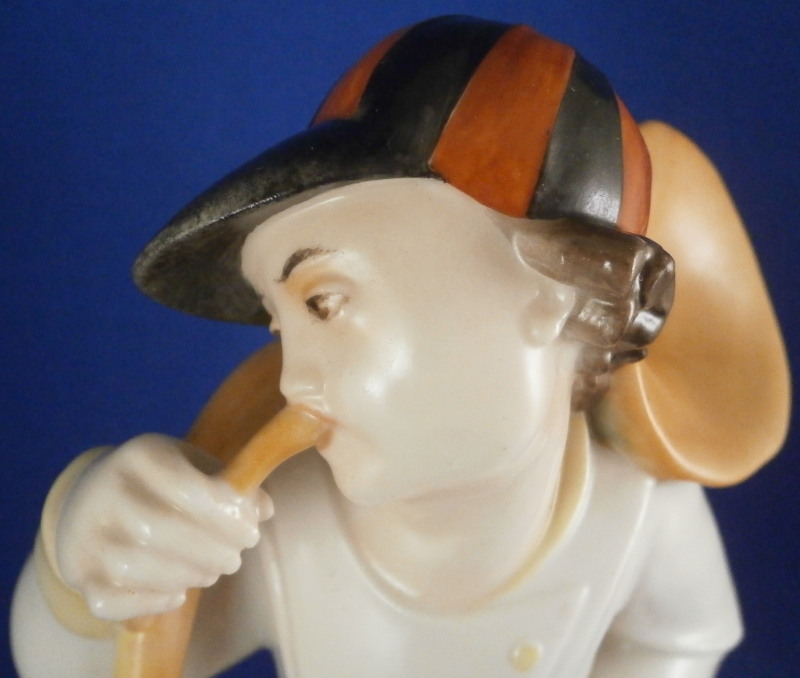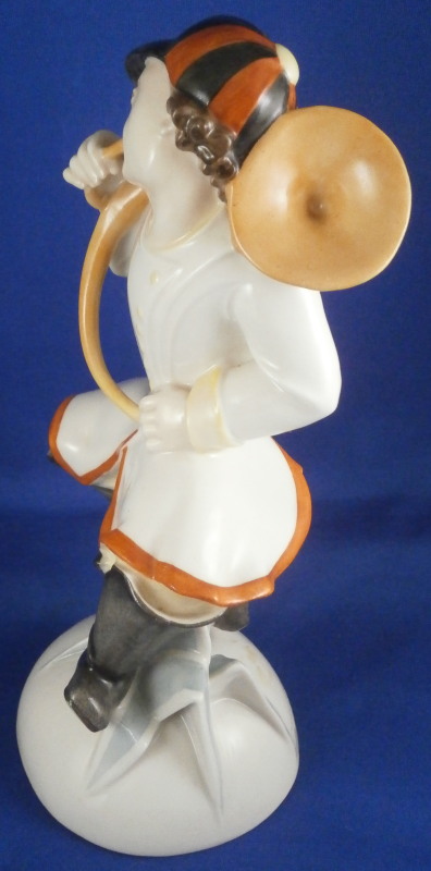 This is a superb figurine made by the Schwarzburger Werkstaetten around 1922 when he was first designed by the famous Mauritius Pfeiffer who originally was a sculptor I believe. His pieces are extremely collectible! The figurine is of a hunter blowing his horn. A really well modeled and painted figurine that is typical for this designer and period. This is an original period piece but they were also later reporduced by Volkstedt. The figurine is 8.125 inches tall, 4 inches wide and 3.25 inches deep. He is marked with the painted blue impressed fox mark as well as an impressed U411 as the model number, an impressed II, Made in Germany in blue and the impressed stamp stating Schwarzburger Werkstaetten fuer Porzellankunst. On the back of the base we find the artist name Mauritius Pfeiffer impressed into the paste. The figure e is in perfect. Please email me for more information or other pictures.