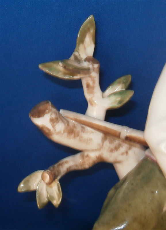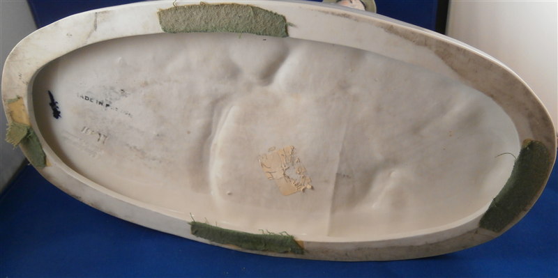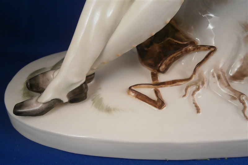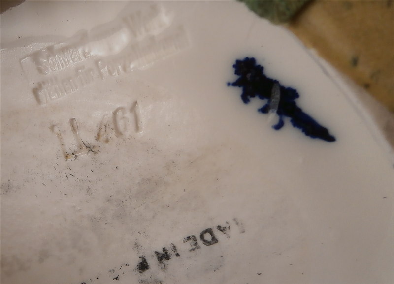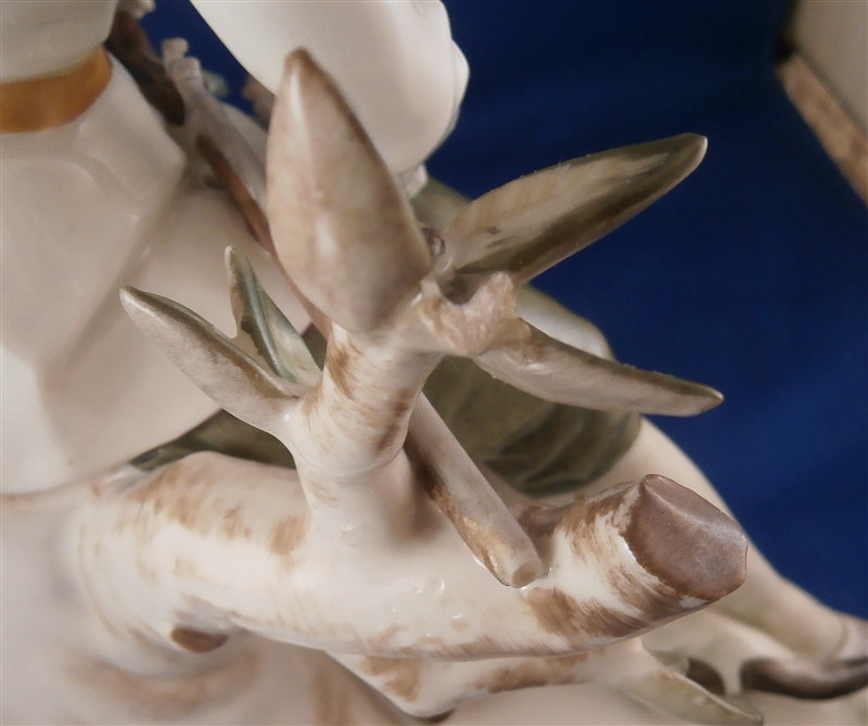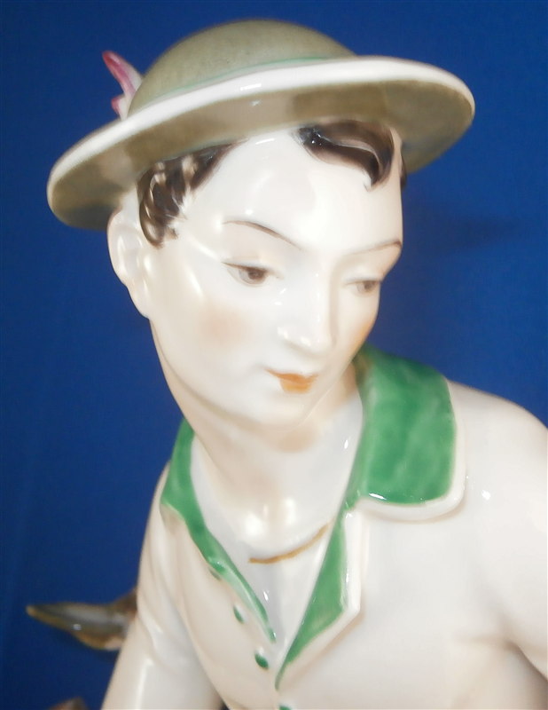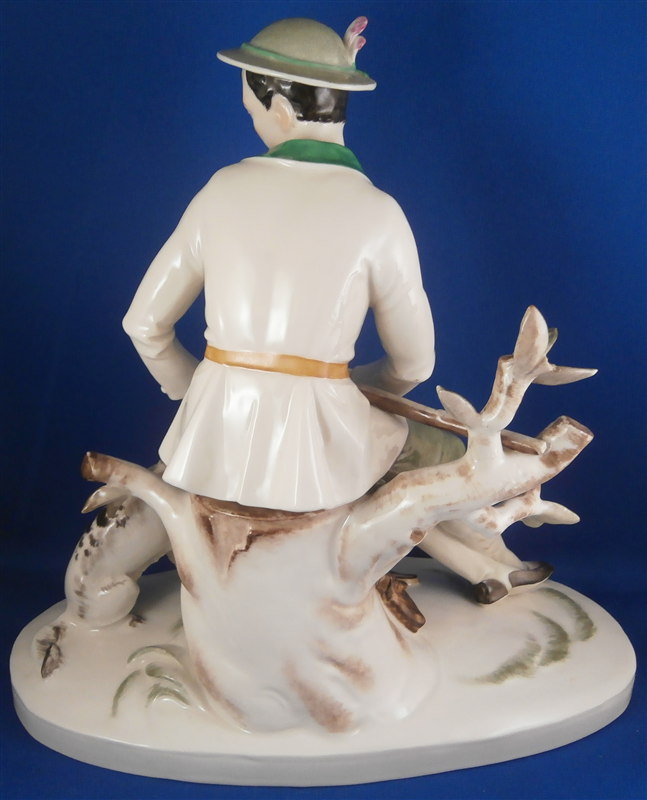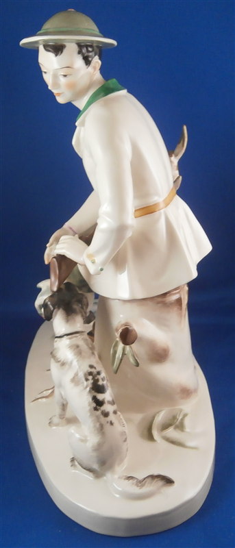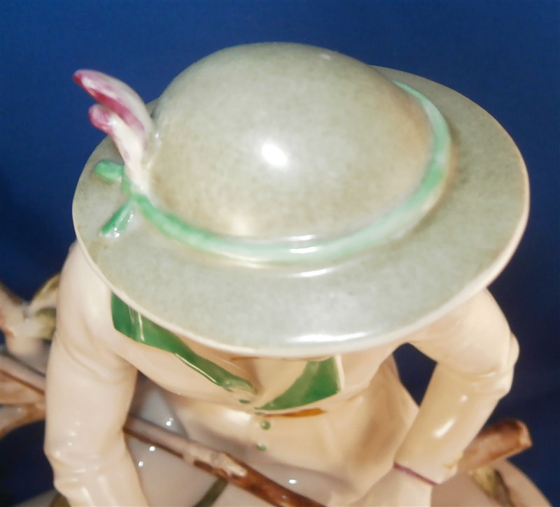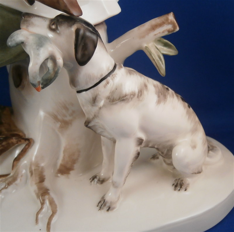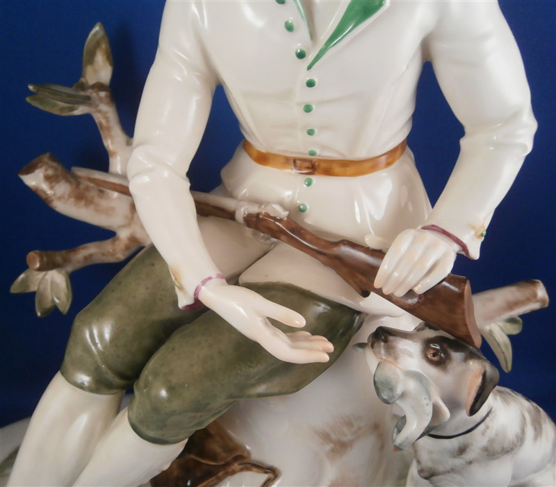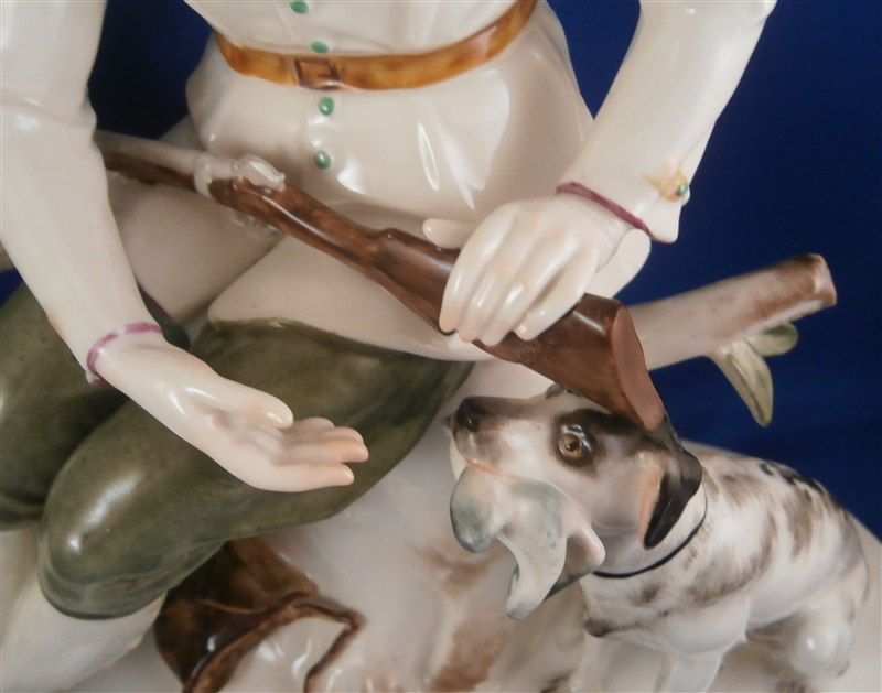 This is a large and superb figurine made by the Schwarzburger Werkstaetten in 1924 about when it was first designed by the famous Hugo Meisel. It is of a hunter sitting on a tree stump with his trusted dog by his side. The dogg has a bird in his mouth and the hunter is holding a rifle in his lap and a bag underneath him on the ground. I do believe there is a mate to this piece of a lady figurine but I do not own it (yet). The piece is extremely well modeled and painted in the Art Nouveau style of the period. A stunning piece for sure! The figurine is 10.75 inches tall, 10.75 inches wide and 5.25 inches deep. The figure is marked with the blue fox mark as well as an impressed U461 (I think) for the model number, Made in Germany in smudged black and the impressed stamp stating Schwarzburger Werkstaetten fuer Porzellankunst. On the top of the base we find the artist signature H.Meisel impressed in script with 24 next to it for the year mark. The piece is in greatt condition with one leaf broken off and the very tip of the rifle seems a little rough though it still has the little indent in the front so it might just be the way it was made or a tiny tiny sliver is missing of the front. It displays perfectly! There is a shallow groove over the fox mark not sure if it a second as they are usually deeper but I assume so. Please email me for more information or other pictures.