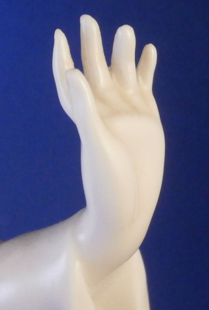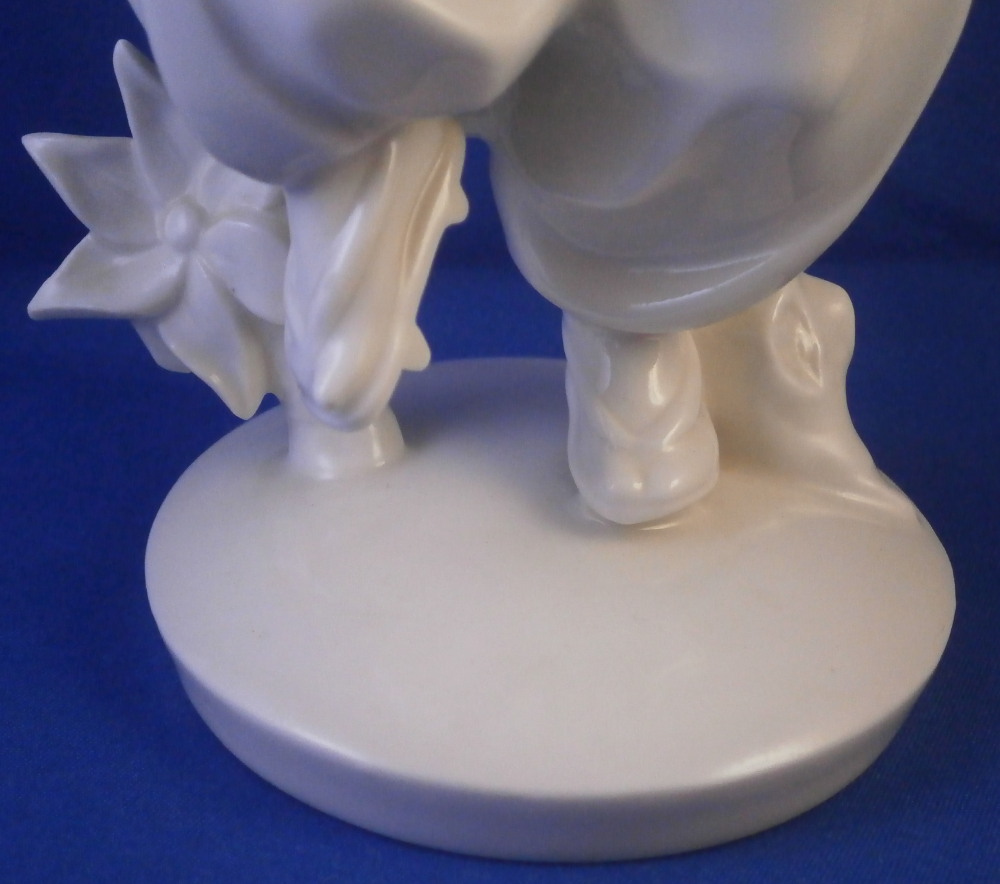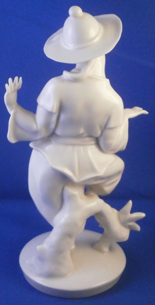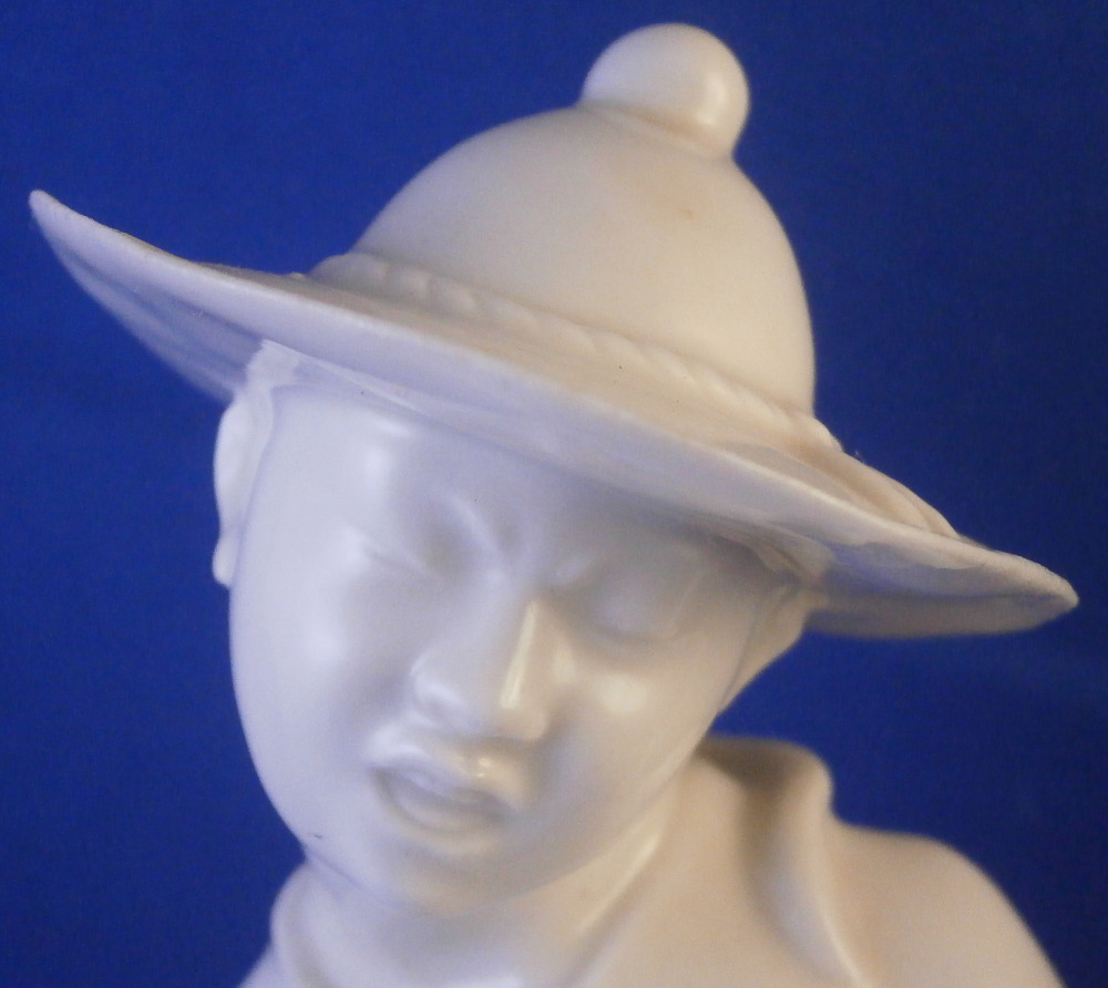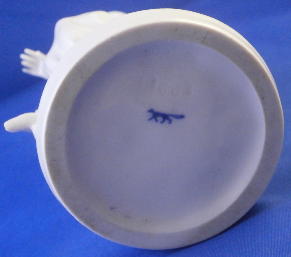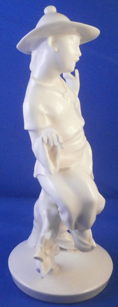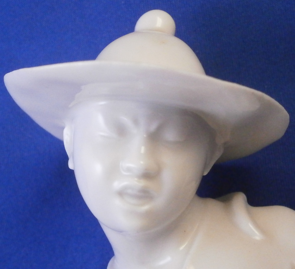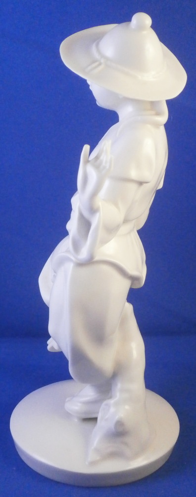 This is a superb blanc de Chine figurine of a Japanese person made by the Schwarzburger Werkstaetten in the early 20th century when it was first designed. A very typical figurine for them in the style of the Art Nouveau Jugendstil period. It is an Asian man or possibly woman dressed in a fancy outfit wearing a hat and traditional wooden shoes. A stylized flower next to him / her on the base. The figure is full of movement and looks amazing. Lots of fine details to it - look at those well done fingers! The piece is in perfect condition and is 7.5 inches tall, 3.875 inches wide and 3 inches deep. It is marked with the blue fox mark as well as the impressed model number U603 over 3 underneath and also the the impressed stamp stating Schwarzburger Werkstaetten fuer Porzellankunst as shown. Please email me for more information or other pictures.
