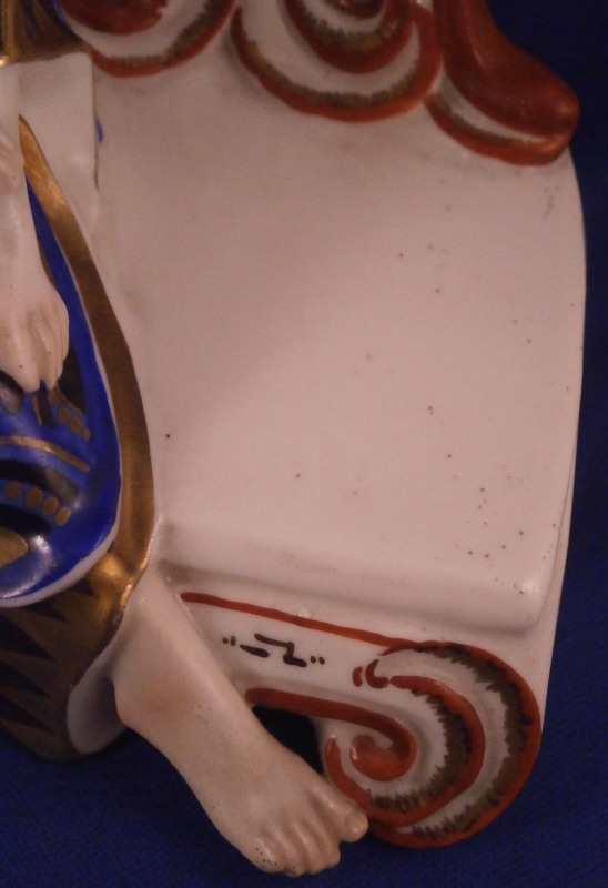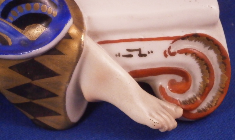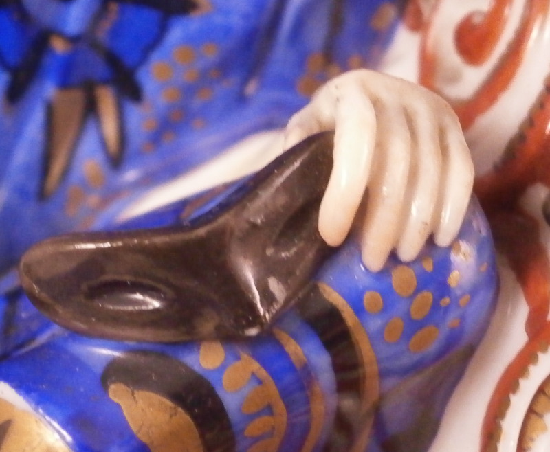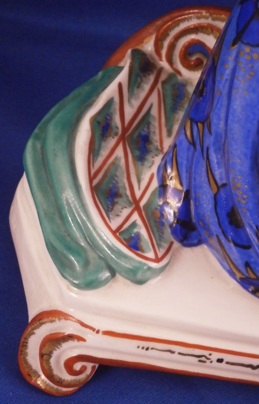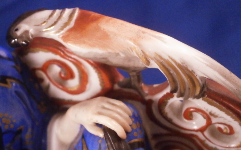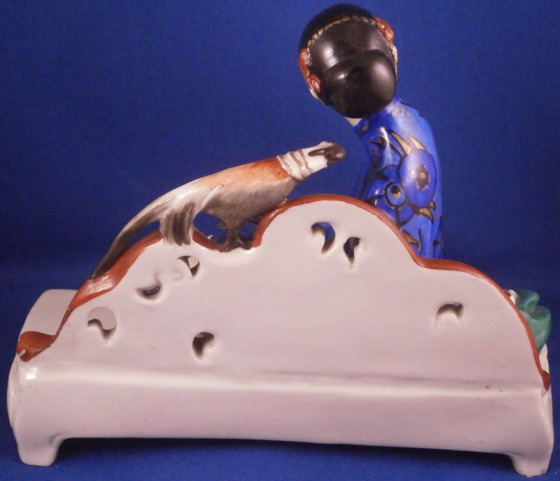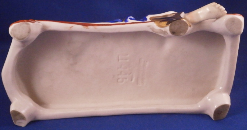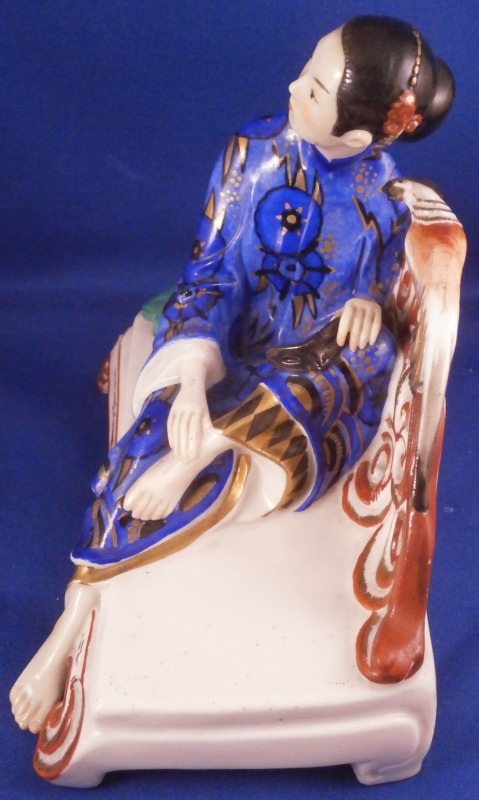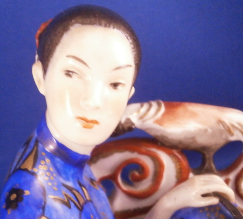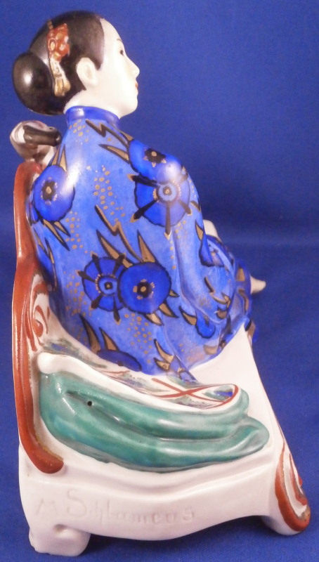 This is a figurine made by the Schwarzburger Werkstaetten in the early 20th century when it was first designed. That means it is one of the rare original pieces. I have not been abelt to find another one of these in my books or online so definitely one of thie rarer pieces by them. The figure is of an Asian lady - likely Japanese - resting on a nicely shaped sofa with a green pillow behind her. She is wearing a fancy blue outfit while holding a mask in her left hand. A bird is perched in the back of the sofa. Not sure what the mask is for - maybe she is going to a masquerade ball or something like that. The piece is in superb condition with just some tiny black firing spots from the firing process when she was made and a flat chip to the mostly the underside of the left back foot which does not show when on display. The figurine is 5.5 inches tall, 7.125 inches wide and 3.5 inches deep. The piece is marked with the impressed fox mark as well as U 445 and the impressed stamp stating Schwarzburger Werkstätten für Porzellankunst. The fox has a cut through it denoting it being a second choice piece. On the side of the base we find the artist name impressed M. (for Marta ) Schlameus who designed the piece. Please email me for more information or other pictures.