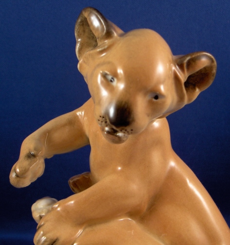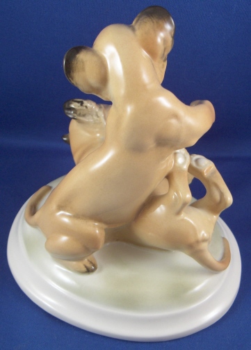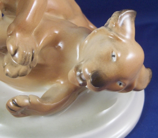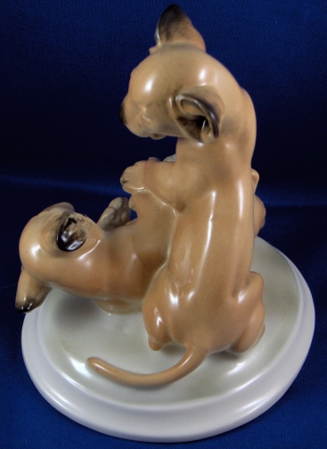 This is a figurine of a pair of lion cubs playing made by the Schwarzburger Werkstaetten in the 20th century. It was designed by Etha Richter who was one of the most important animal modelers of the Jugendstil / Art Deco period. This is the painted version to the white one I also own. One lion is one top of the other that is lying down on his back. All on a rounded base. The figurine is in great condition with a firing line on the tail of the top lion from the making. The figurine is marked with the impressed fox mark as well as the artists initials I believe. The piece is 5.5 inches tall, 5.5 inches wide and 4.75 inches deep. Please email me for more information or other pictures.