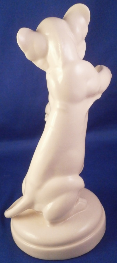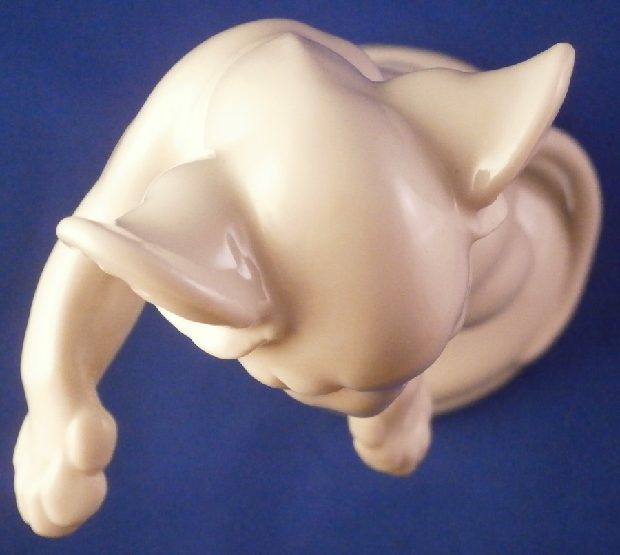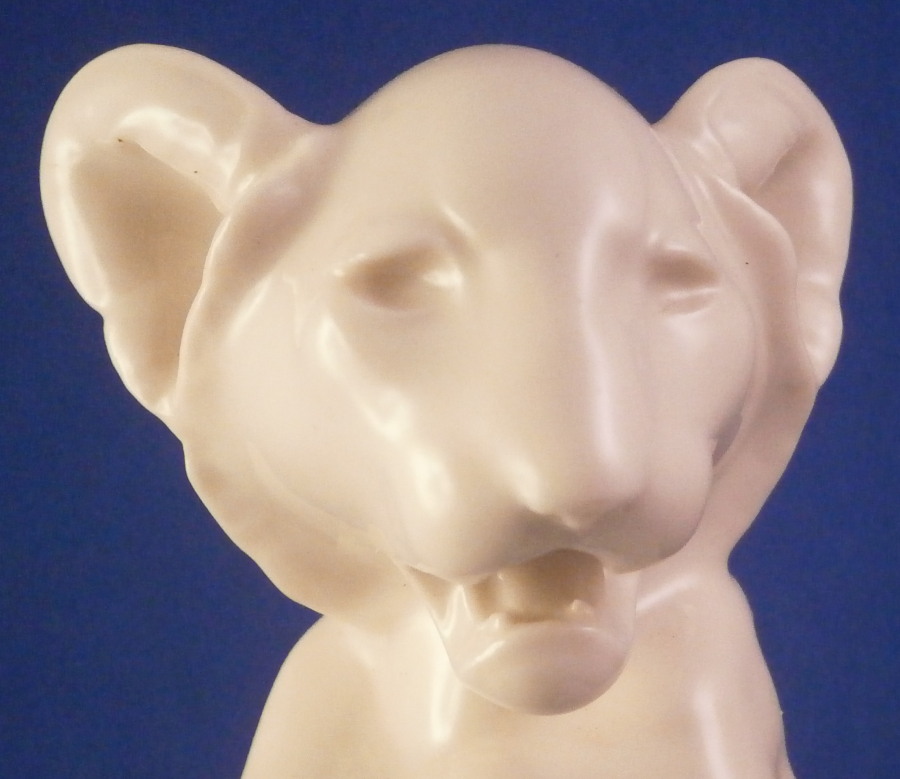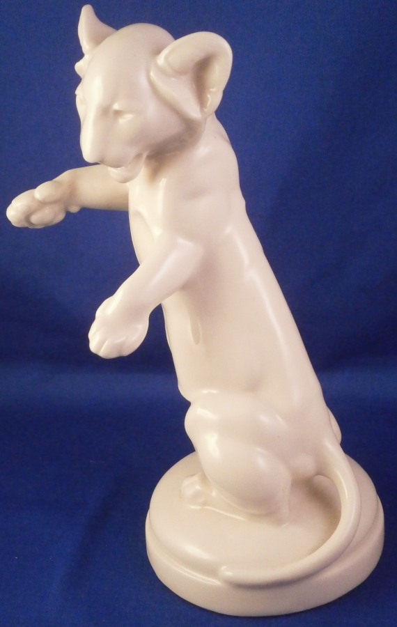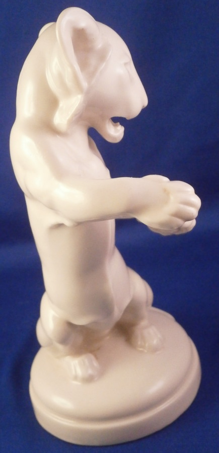 This is a figurine of a lion cub made by the Schwarzburger Werkstaetten around 1930. It is standing on his hind paws with his front paws out as if ready to slap his brother / sister in some playful fighting. It was probably designed by Etha Richter who was one of the most important animal modelers of the Jugendstil / Art Deco period. Nice simple base with the tail of the lion wrapping around part of the edge. Again a very simple figurine yet so elegant. That is why these figurines are so collectable. The figure is in perfect condition. It is marked with the impressed fox mark as well as U. 1098. underneath. Also the impressed stamp Schwarzburger Werkstaetten fuer Porzellankunst. All the stamps are hard to make out but they are there. The piece is 6.375 inches tall, 4 inches wide and 3 inches deep. Please email me for more information or other pictures.