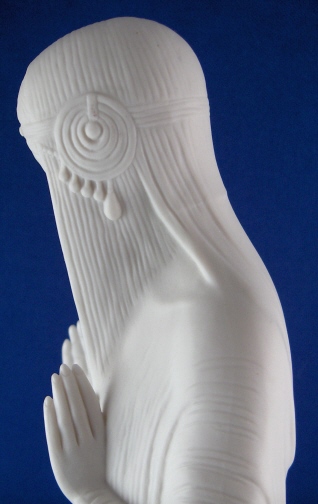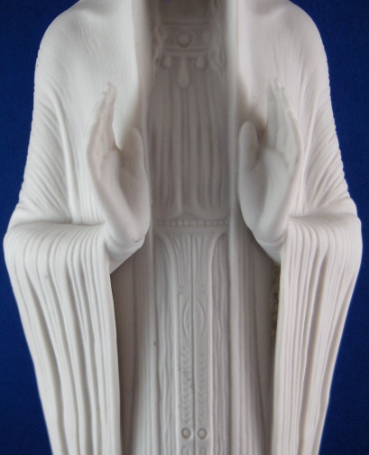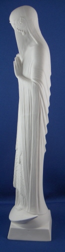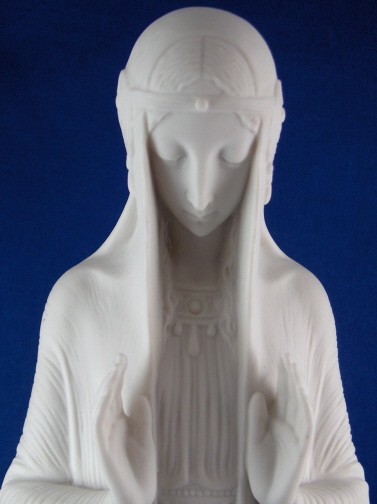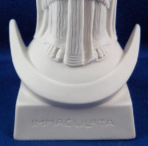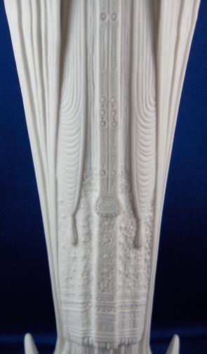 This is an unglazed porcelain figurine made by the Schwarzburger Werkstaetten in the early 20th century when she was first designed. That means she is one of the rare original pieces and not a later Volkstedt re-issue. It is of the Madonna modeled in a whole new way. Actually she is the nicest one I have ever seen! Superbly modeled with an Art Nouveau dress with lots of amazing detail! The figure is in perfect condition and the larger version which is nice. She is 12.25 inches tall, 2.75 inches wide and 2.375 inches deep. The piece is marked with the underglaze blue fox mark as well as U 676 and also the impressed stamp stating Schwarzburger Werkstaetten fuer Porzellankunst. On the side of the base we find the artist initials impressed - TML or something like that and on the front IMMACULATA. Please email me for more information or other pictures.