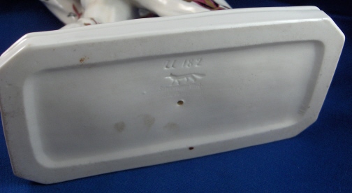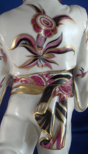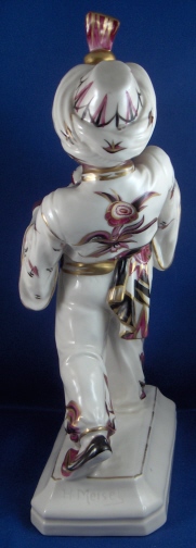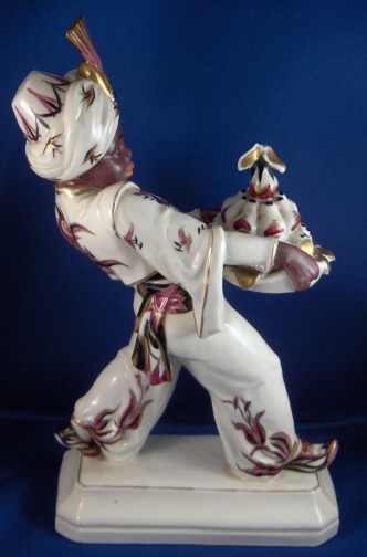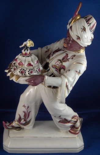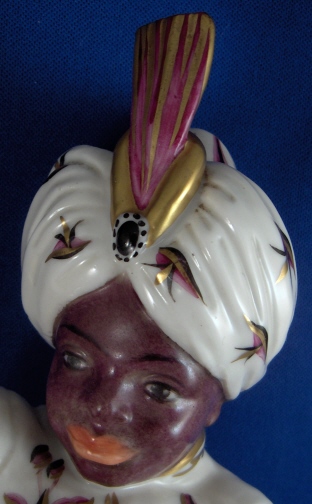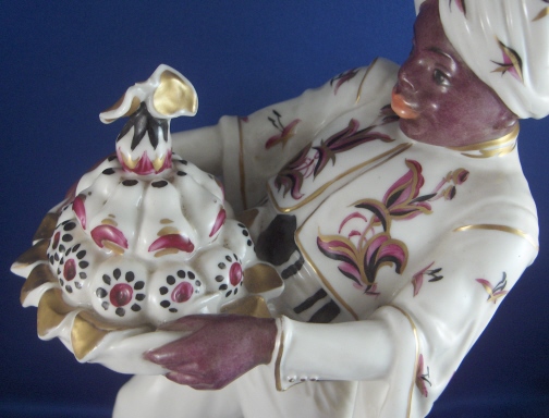 This is a figurine made by the Schwarzburger Werkstaetten around 1936 when he was first designed. That means he is one of the rare original pieces. And also a very typical figurine for them in the style and coloration of the Art Nouveau period. It is a blackmoor holding a cake in front of him. He is wearing a turban and is handpainted with a neat design in black, purple and gold. The piece is in great condition with the stem of the pear on top of the cake missing but the leaves are there and it is not easy to spot. The piece is the larger version being 11.5 inches tall, 3 inches wide and 6.75 inches long. He is marked with the impressed fox mark as well as U 182 underneath. Also the impressed stamp (be it lightly) stating Schwarzburger Werkstaetten fuer Porzellankunst. On the side of the base we find the artist name impressed - H. Meisel. Please email me for more information or other pictures.