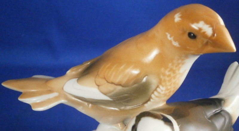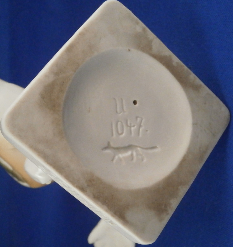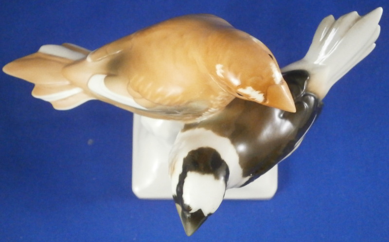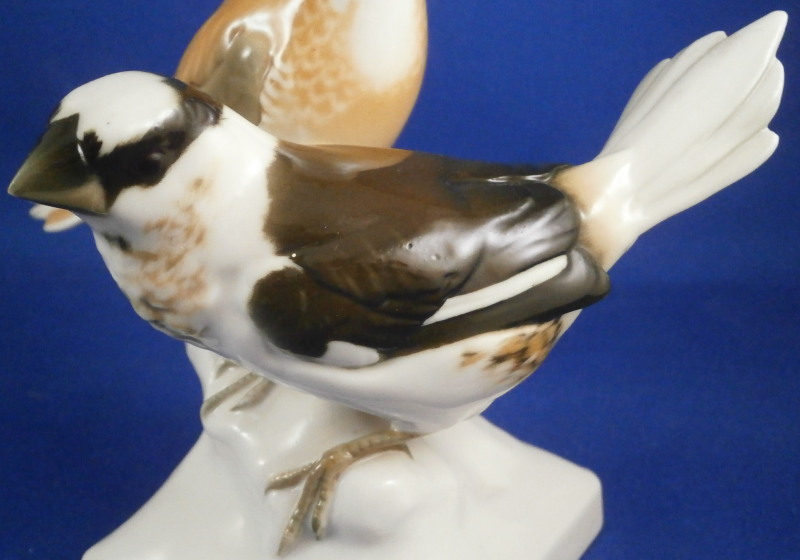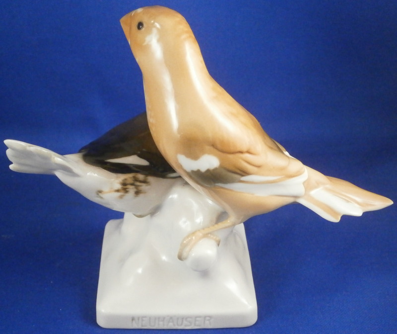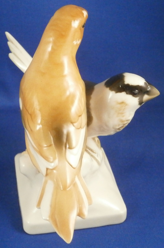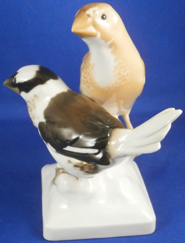This is a fun figurine of a pair of birds (no idea what kind) made by the Schwarzburger Werkstaetten in the early 20th century when it was first designed. That means it is one of the rare original pieces and not a later copy! The figure is superbly modeled and hand painted in very naturalistic colors typical of this maker. The piece is in perfect condition. It is 4.5 inches tall, 5.375 inches wide and 3 inches deep. The pair is marked with the impressed fox mark as well as the impressed model number U 1047 . The edge of the base has the designer's name impressed - Neuhäuser . Please email me for more information or other pictures.