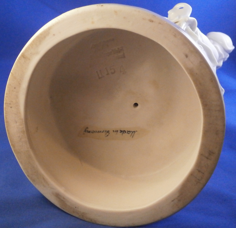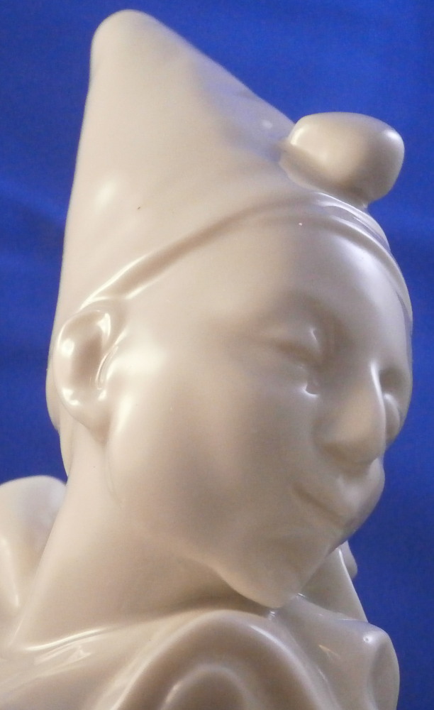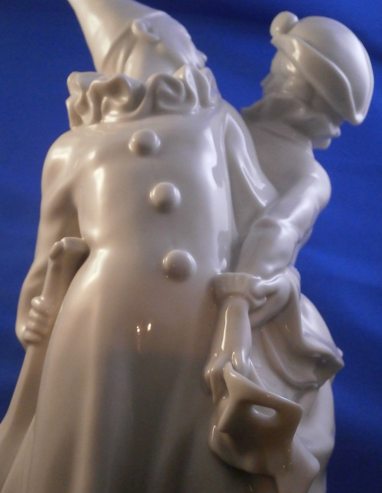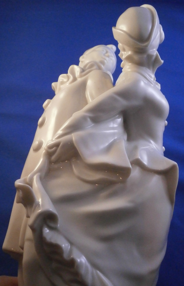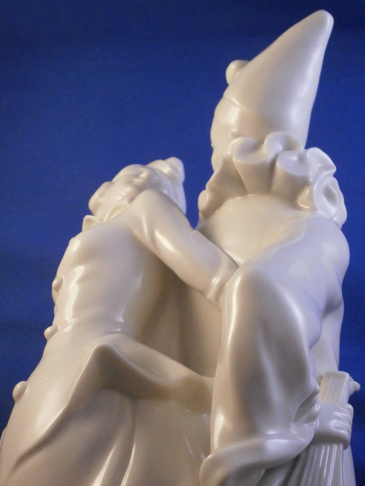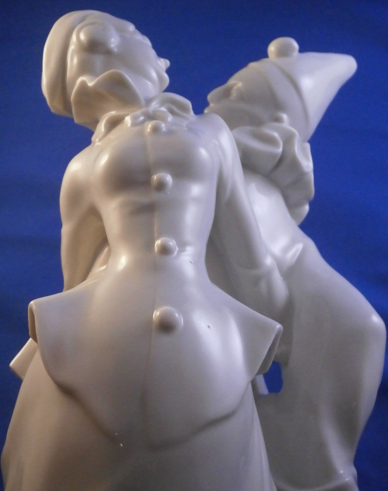 This is a large and superb figurine made by the Schwarzburger Werkstaetten around 1917 when it was first designed by the famous Hugo Meisel. This factory was really the frist to make these large figures in the Art Nouveau and Art Deco style often left in the white to show off all that amazing modeling. You don't find pieces like this often in the porcelain world and they are superb! Not a maker that is appreciated enough yet! The figure is of a couple - one being Pierrot the clown and the other I thought would be Harlequina but she is simply called a lady unmasked. They are fecing each other in terms of the heads but the back of the lady is against the front of the gentleman. Both are wearing nice yet simply modeled outfits with her having a long coat over a skirt and high heeled shoes and him in his traditional costume including the fancy collar and hat. He is holding a guitar while she is holding a hankerchief and her mask. Simple round raised base. It's a superbly done figure that looks amazing - a super elegant piece and rather large! The figurine is 13.5 inches tall with the base having a diameter of 5.5 inches. The figurine is marked with the impressed fox mark as well as an impressed U154 for the model number and the impressed stamp stating Schwarzburger Werkstaetten fuer Porzellankunst . Made in Germany in script in blue. On the top of the base we find the artist name H. Meisel incised. The piece is in perfect condition but there are some tiny firing spots typical of their larger white pieces. Minor and do not detract from it, Also a mark of a firing support that was attached as shown under the corner of her skirt also a typical thing for this maker. Please email me for more information or other pictures.