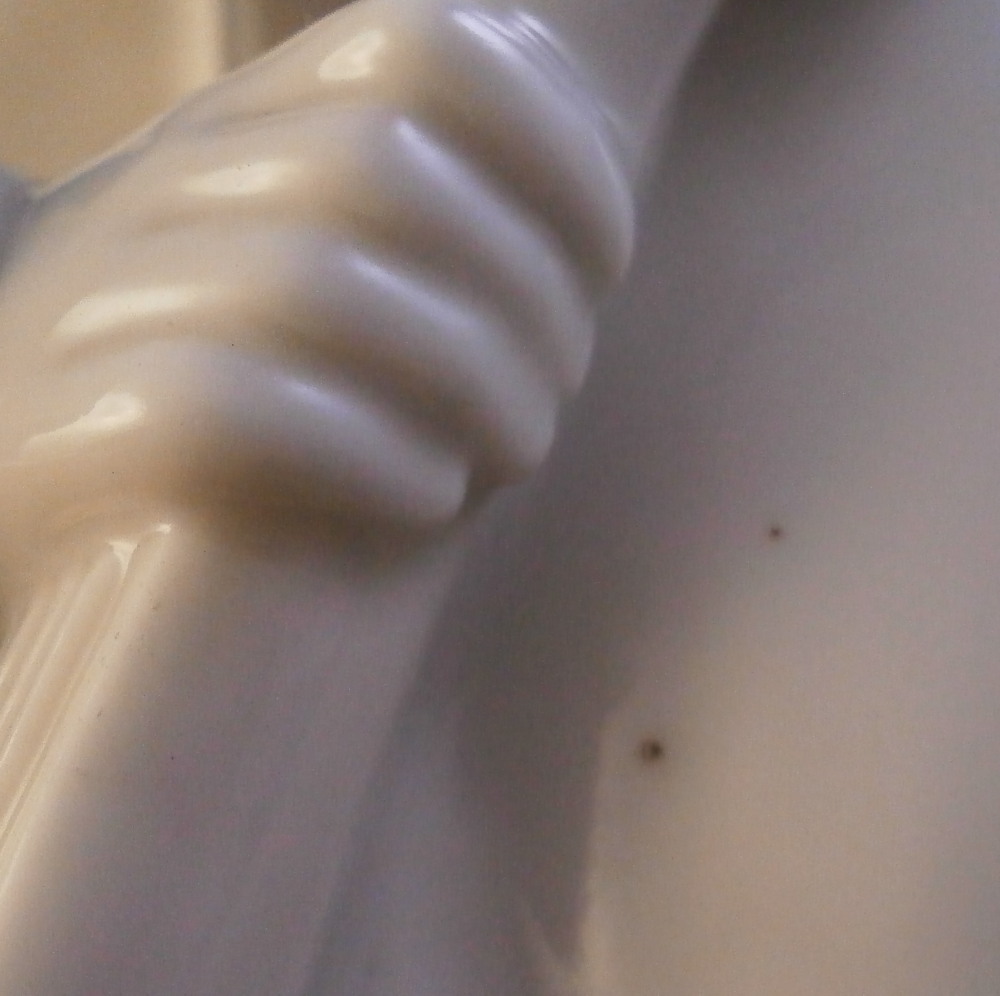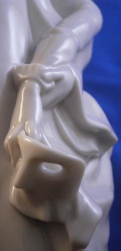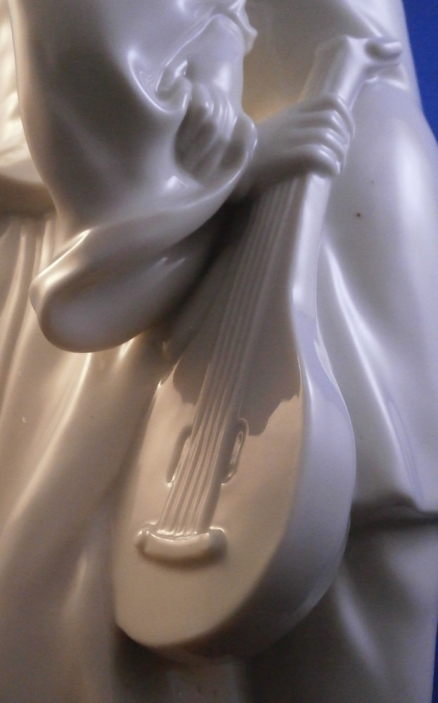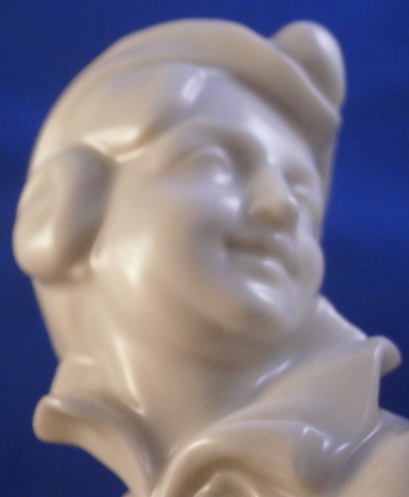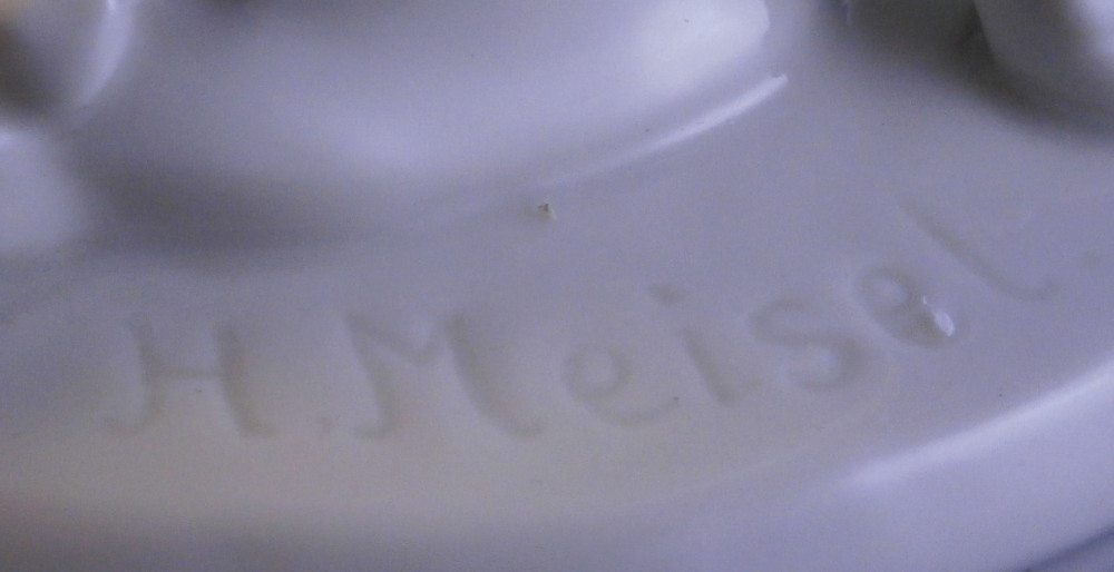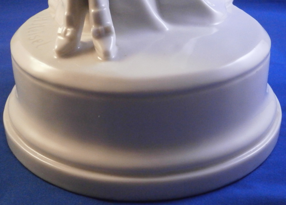 This is a large and superb figurine made by the Schwarzburger Werkstaetten around 1917 when it was first designed by the famous Hugo Meisel. This factory was really the frist to make these large figures in the Art Nouveau and Art Deco style often left in the white to show off all that amazing modeling. You don't find pieces like this often in the porcelain world and they are superb! Not a maker that is appreciated enough yet! The figure is of a couple - one being Pierrot the clown and the other I thought would be Harlequina but she is simply called a lady unmasked. They are fecing each other in terms of the heads but the back of the lady is against the front of the gentleman. Both are wearing nice yet simply modeled outfits with her having a long coat over a skirt and high heeled shoes and him in his traditional costume including the fancy collar and hat. He is holding a guitar while she is holding a hankerchief and her mask. Simple round raised base. It's a superbly done figure that looks amazing - a super elegant piece and rather large! The figurine is 13.5 inches tall with the base having a diameter of 5.5 inches. The figurine is marked with the impressed fox mark as well as an impressed U154 for the model number and the impressed stamp stating Schwarzburger Werkstaetten fuer Porzellankunst . Made in Germany in script in blue. On the top of the base we find the artist name H. Meisel incised. The piece is in perfect condition but there are some tiny firing spots typical of their larger white pieces. Minor and do not detract from it, Also a mark of a firing support that was attached as shown under the corner of her skirt also a typical thing for this maker. Please email me for more information or other pictures.