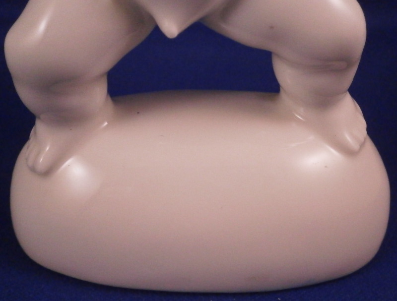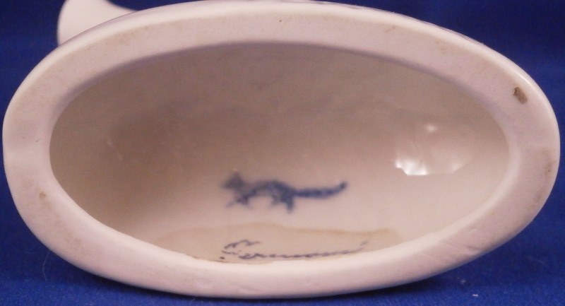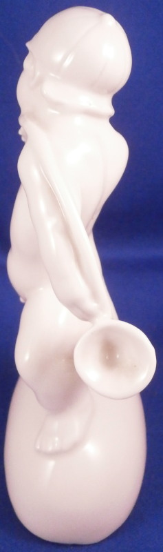 This is a fun little figurine made by the Schwarzburger Werkstätten für Porzellankunst in the early 20th century when it was first designed. The figure was modeled by the famous Mauritius Pfeiffer who originally was a sculptor I believe. His pieces are extremely collectible! The figurine is of putto or young boy wearing a hat while blowing a natural horn or hunting horn which was the precursor to the French horn. Nicely modeled and left in the white to show off all that nice detail - quite typical for this maker. A fairly hard to find piece! Raised oval base with the name of the designer impressed into the back as shown. The figure is in perfect condition! The piece is 4.5 inches tall, 2.625 inches wide and 1.5 inches deep. It is marked with the under glaze blue fox mark as well as Germany above glaze in blue. Also incised U N. (or A.) I. underneath but it is hard to see unless you shine a light through it. Not sure what that stands for usually the U is followed by a model number. Please email me for more information or other pictures.