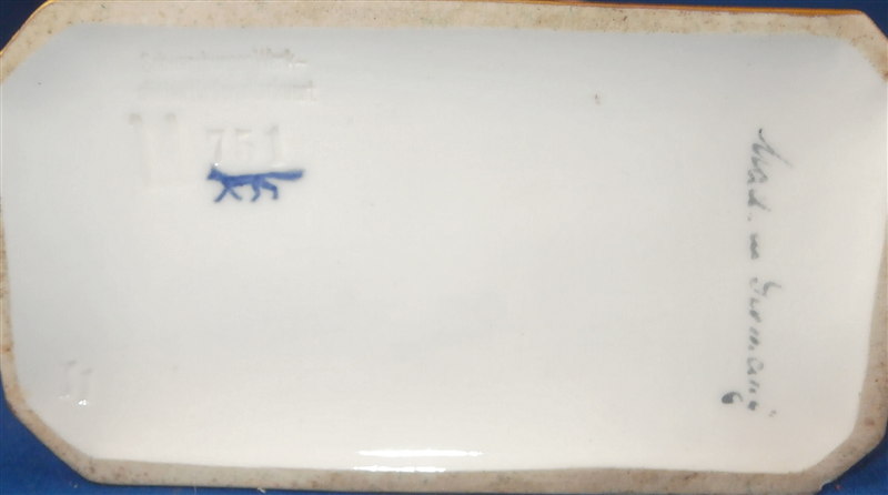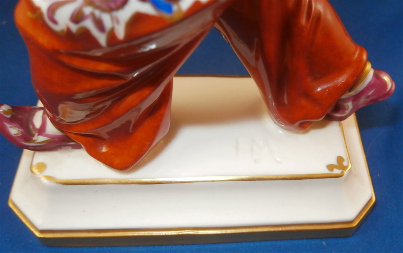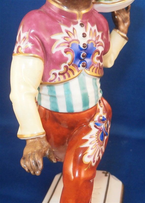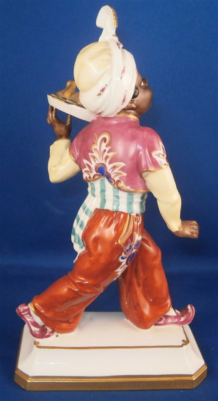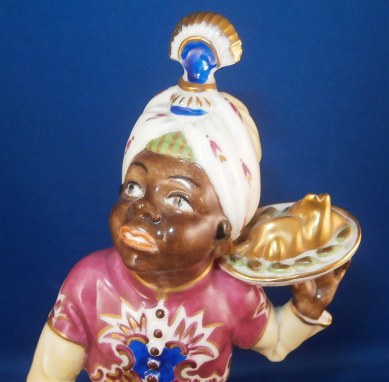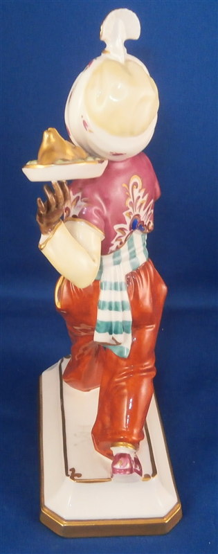 This is a figurine made by the Schwarzburger Werkstaetten around 1931 when he was first designed. That means he is one of the rare original pieces. And also a very typical figurine for them in the style and coloration of the Art Nouveau period. One of a set of four which is a complete set for these! It is a blackmoor holding a chicken with some sort of veggies around it on a platter behind him. He is wearing a turban and is handpainted with a neat colorful design. Mostly red ground color with a fancy blue, gold and red design to it. The piece is in perfect condition! The piece is the smaller version being about 7 inches tall, 2.25 inches wide and 4 inches long. He is marked with the underglaze blue fox mark as well as U 751 and an 11. Also impressed on the base we find the artist initials HM impressed for Hugo Meisel. Also the impressed stamp (be it lightly) stating Schwarzburger Werkstaetten fuer Porzellankunst. In blue we have Made in Germany above glaze. Please email me for more information or other pictures.