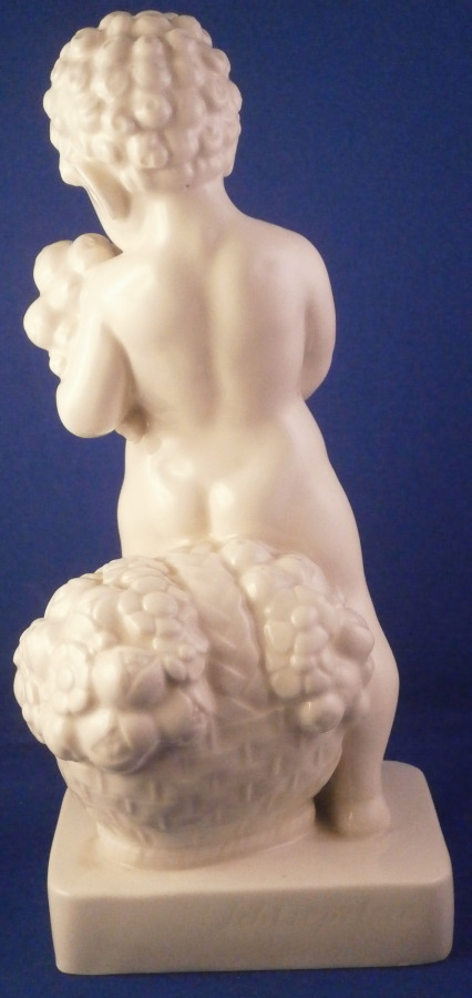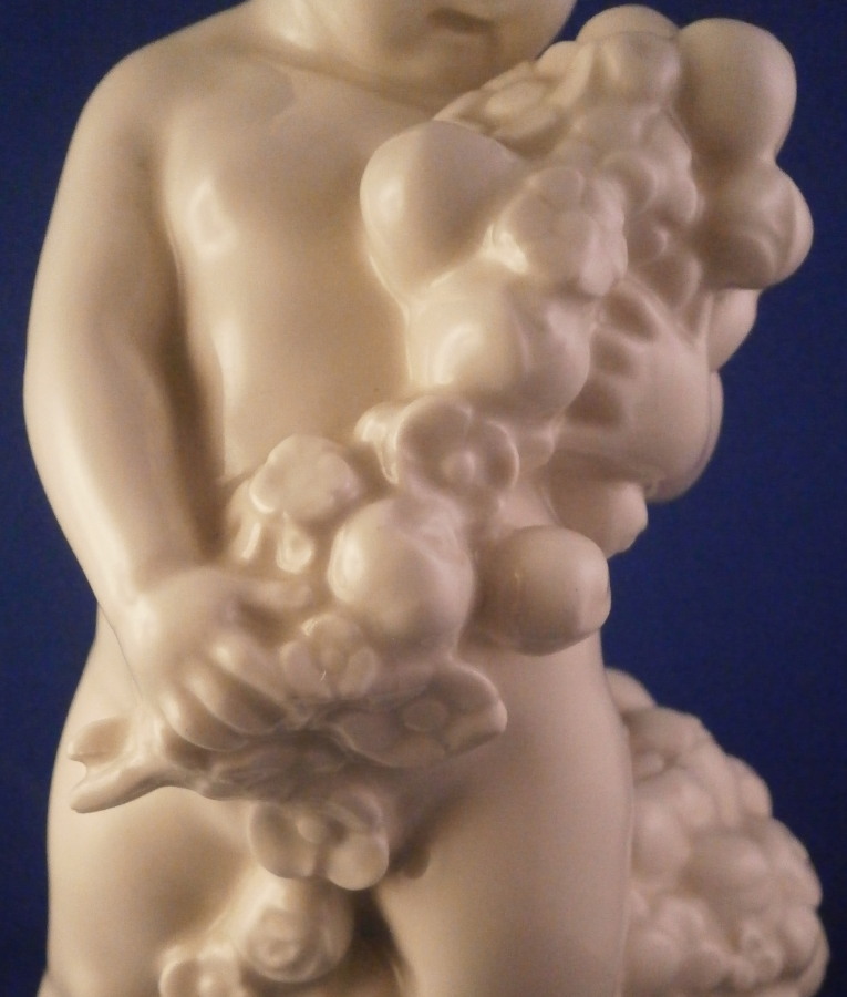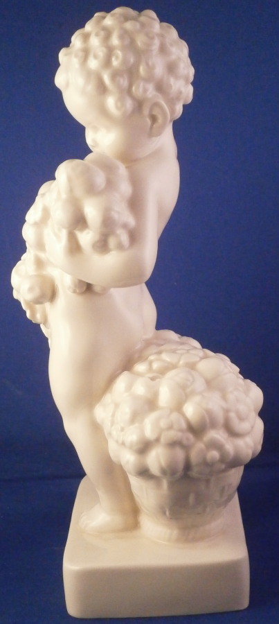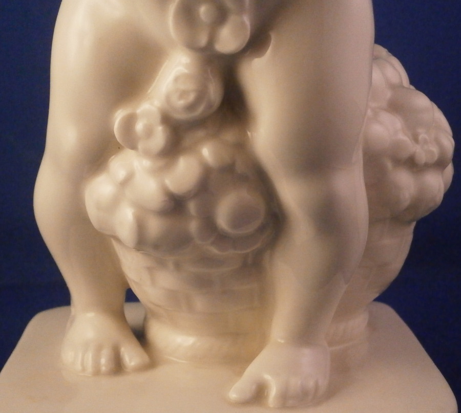This is a large putto figurine made by the Schwarzburger Werkstätten für Porzellankunst in the early 20th century when it was first designed. The figure was designed by Gerhard Schliepstein around 1920 and is of a putto holding a floral garland in his hands with a basket full of flowers sitting on the base behind him. Nicely modeled and quite typical for this maker. Hard to find the original version but one can still get the Volkstedt later copies more easily. The figure is in good condition and displays perfectly but there are a few glaze cracks here and there. Not that common on German porcelain but it happens with this maker as well as Nymphenburg pieces once in a while. These are not hairlines just cracks in the surface and they are stable. A small rough spot to the end of the flower garland looks to be a tiny popped glaze bubble from when it was made. The figurine is 9.125 inches tall and the base is 4 inches wide and 2.875 inches deep. The figure is marked with the blue fox mark as well as U442 for the model number and another impressed number 2 underneath. Also the impressed stamp stating Schwarzburger Werkstaetten fuer Porzellankunst. The back of the base has the artist mark incised. The original period pieces are very hard to find so I was thrilled to own it! Please email me for more information or other pictures.
