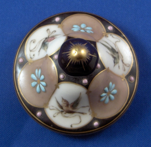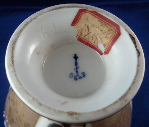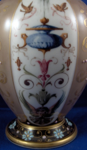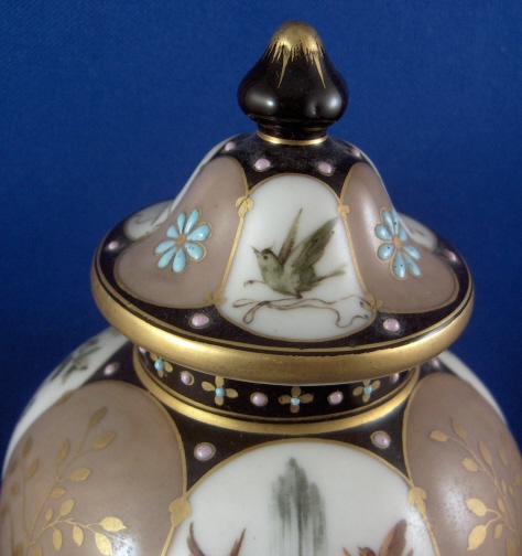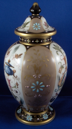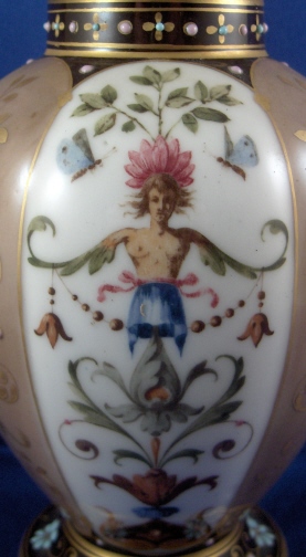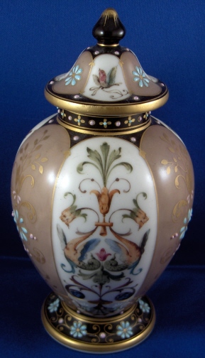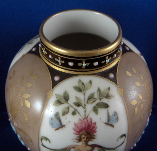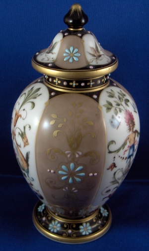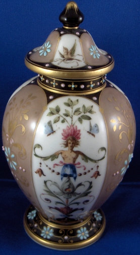 This is a lidded vase, a ginger jar or just a large tea caddy made by Seger around 1900. It is superbly handpainted with panels showing historism revival type scenes alternating with a brownish ground panel painted in gold with flowers painted using raised enamels. The panels go inwards a tiny bit as they meet making a shape that is much nicer. This type of shape originated in Asia and was used by KPM for quite a while already. These types of colors were the ones made possible by Seger's experiments with new colors and porcelain that was able to be fired at lower temperatures. The raised parts look liked jewels! The lid has the same alternating panels as well. Marked underneath with the underglaze blue scepter with SgrP mark as well as an incised mark and the lid has the painters signature inside of Fr. in black. The jar is 7.5 inches tall with the lid and 4 inches in diameter. The jar and lid are in perfect condition but one of the brownish panels has a flaw in the brown color where it is not as thick as the rest of the area. Doesn't take away from the piece at all. Please email me for more information or other pictures.