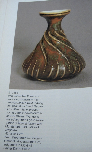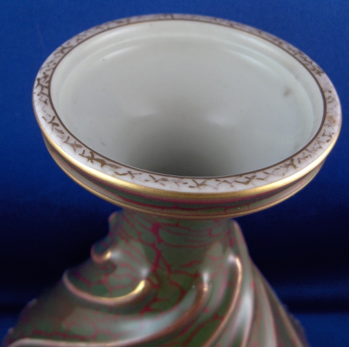 This is a rare vase made by Seger porcelain later owned by KPM around 1919. It is handpainted with one of his dual layer crackle glazes. The top layer is an olive green and the bottom layer that shows through the cracks in a nice red. There is relief decoration that was highlighted in gold as well. The vase is 7.5 inches tall, 5.75 inches in diameter. It is marked underneath with the underglaze blue scepter with the letters S.g.r.P. underneath. Also an impressed S over 25 and a golden 48 and some other mark that looks like RF or Af in gold - probably the painters mark. It is in perfect condition with some wear to the gilding. Please email me for more information or other pictures.