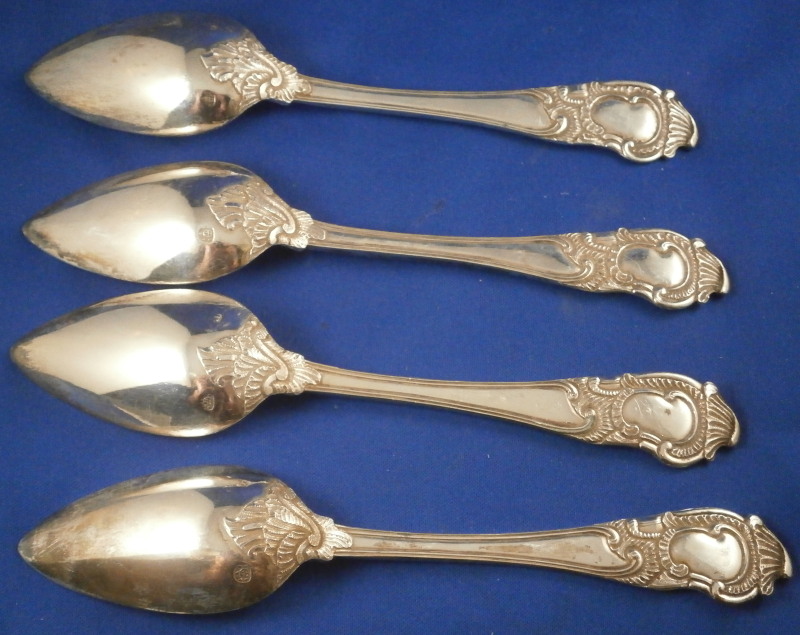 This is a great set of 4 Sterling Silver soup spoons made in Vienna , Austria in 1838. It would have been made during the early part of the second Rokoko period or Rokoko revival since they still show the typical Biedermeier tip. The design work is unusually nice and they are very heavy weighing in at about 330 grams together. Each spoon is marked on the back as shown with the Austrian silver mark with the city letter A for Vienna and 1838 as the year mark. Each spoon is about 8.25 inches long and the bowl is 3 inches long by 1.625 inches wide. These match the 18th century KPM porcelain handled knife and fork sets I have on the site. Please email me for more information or other pictures.