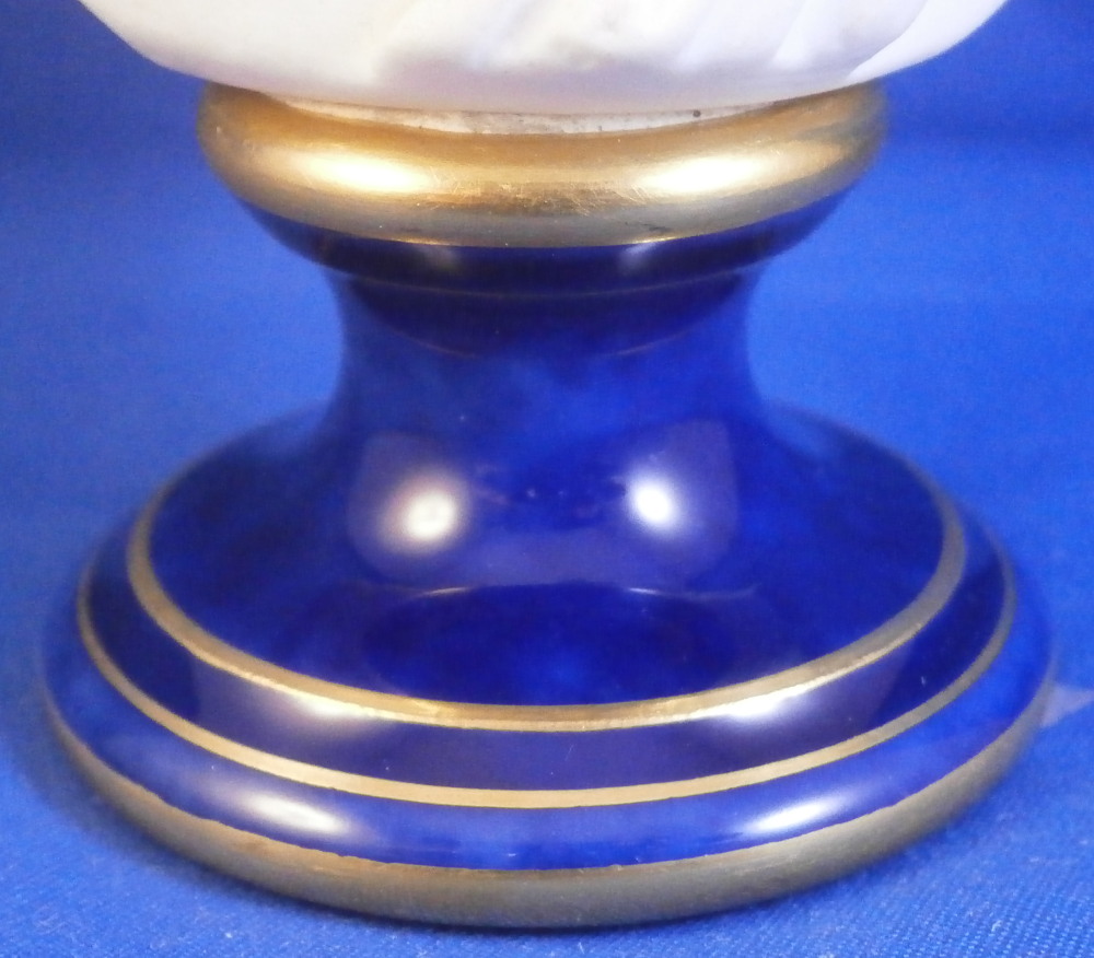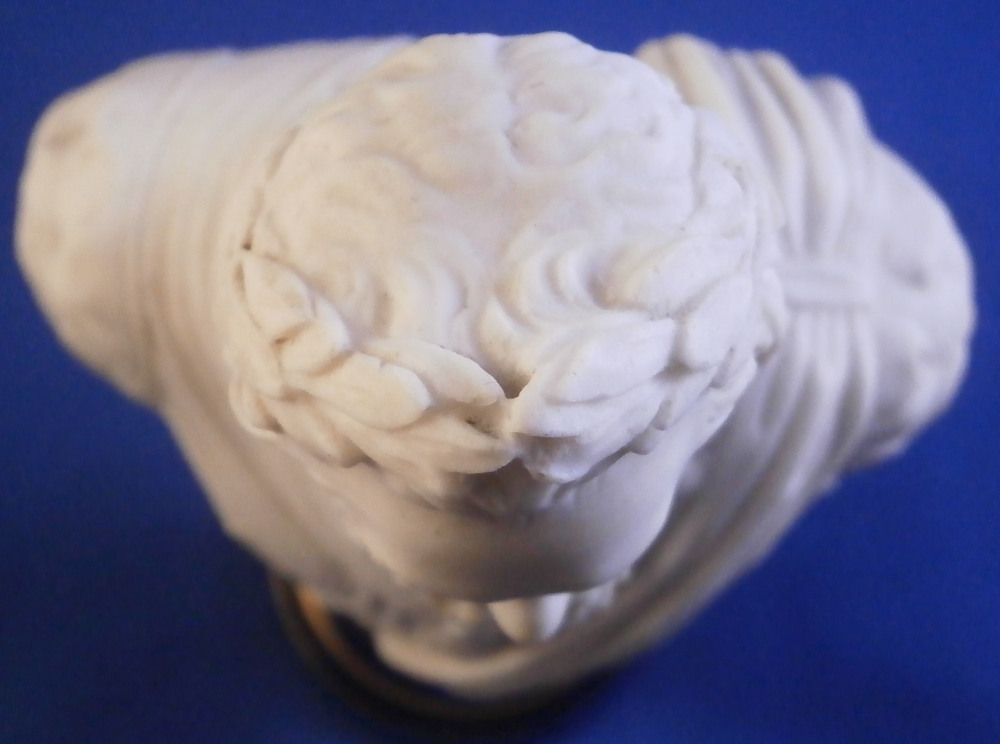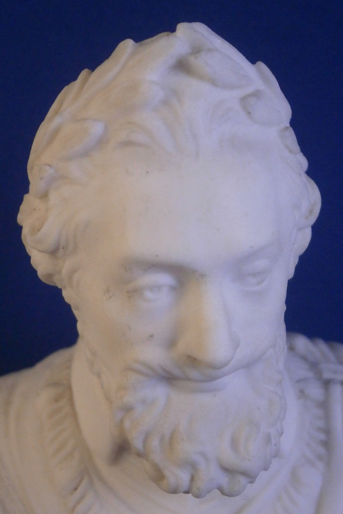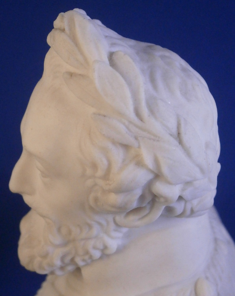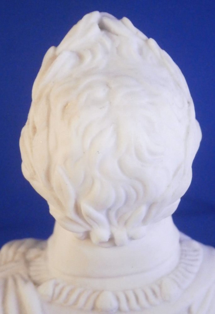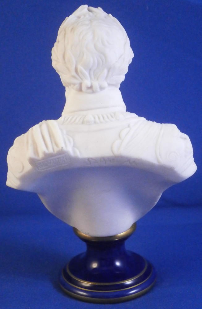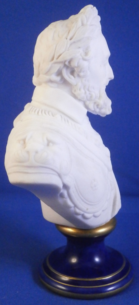 This is a biscuit figural bust of the famous King Herny IV (aka Henry the Usurper ) made by Sevres in the late 19th century - 1888/90/91. Henry was the King of ENgland from 1399 until 1413. The bust is made of unglazed bisque or biscuit porcelain and is extremely well modelled with lots of superb details. He is wearing a draped cuirass with what looks to be lion faces on his shoulders. He has a beard and has a laurel wreath on his head. A stunning piece and the unevenly blue ground colored base with the gold trim only brings it out even more. The piece is in perfect condition. A very clear and crisp mold! The bust is marked on the back by his shoulders with the impressed Sevres mark as well as the year mark for 1890 and under the base there is the green Sevres year mark S .88 in an oval type shape as well as the red gilder's mark for 1891 and the usual incised marks of this period. The piece is 5.125 inches tall, about 3.25 inches wide and 2.375 inches deep. Please email me for more information or other pictures.