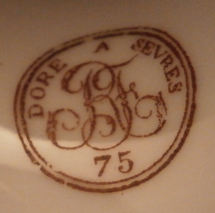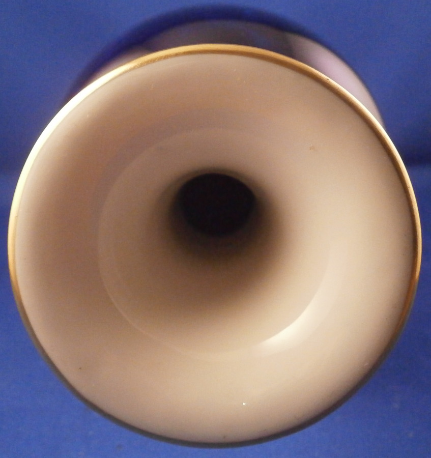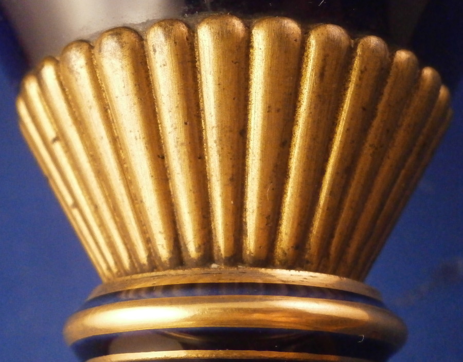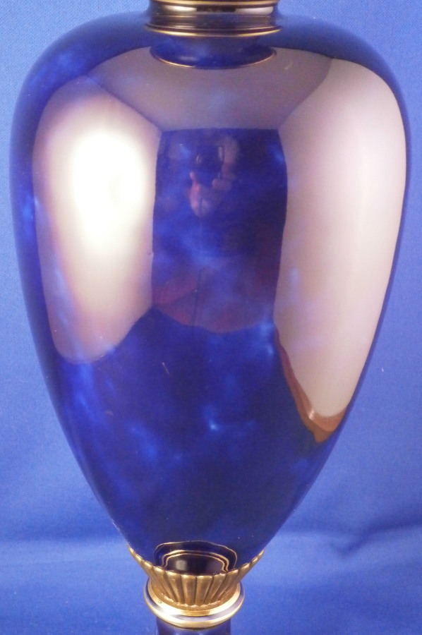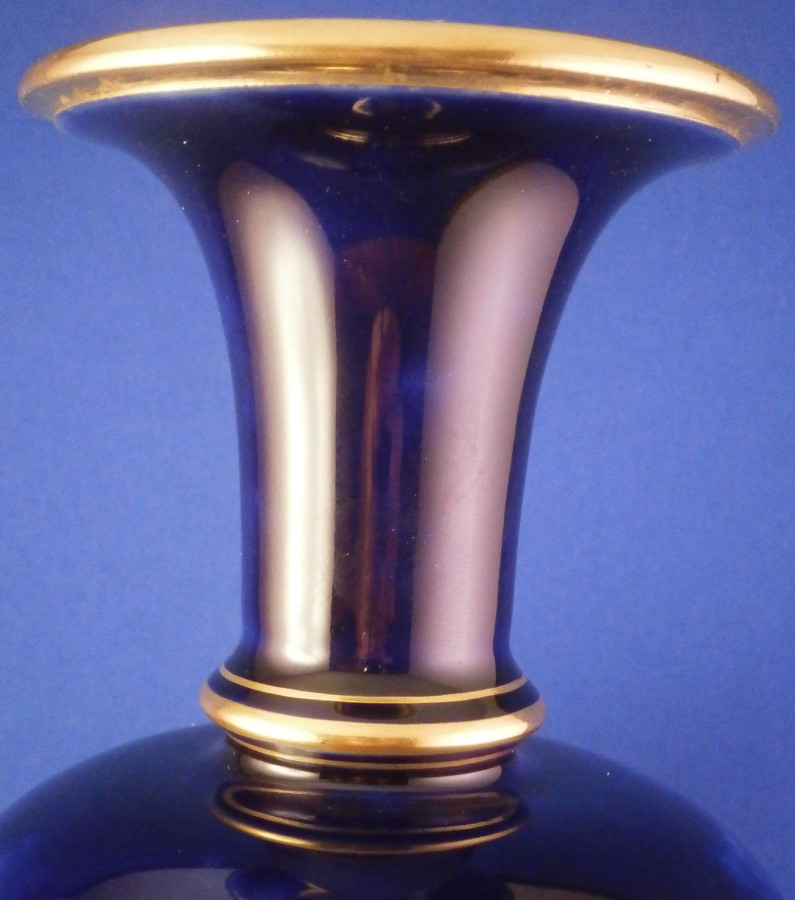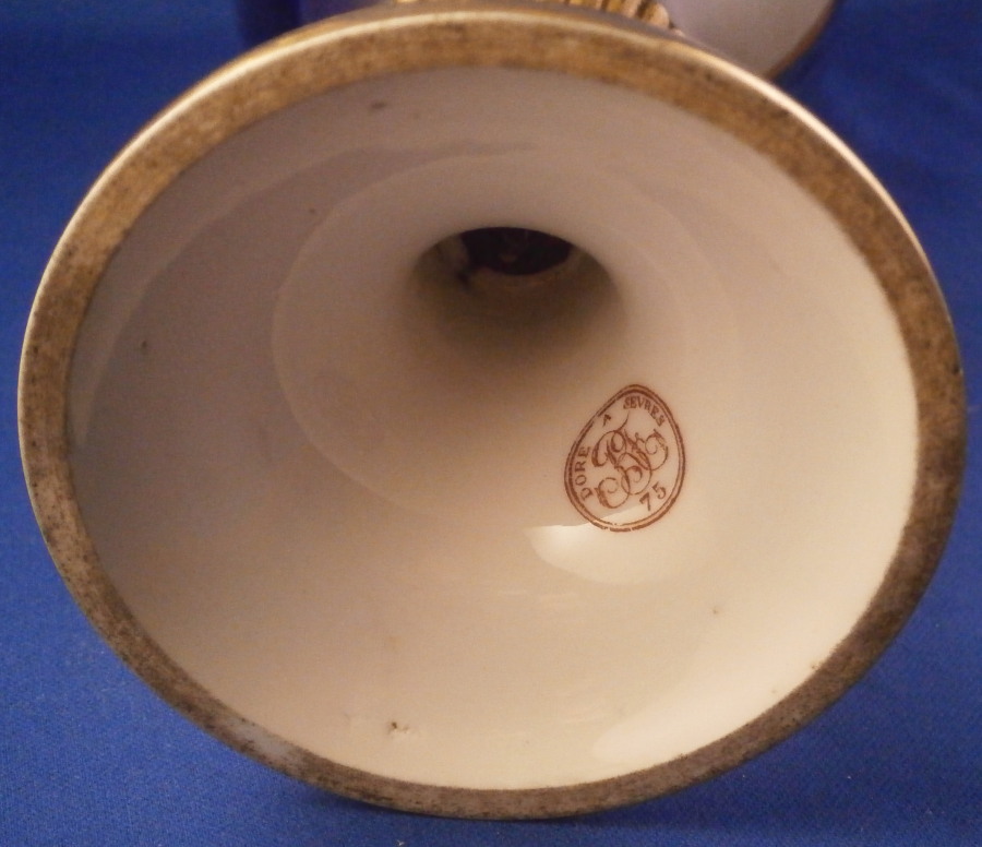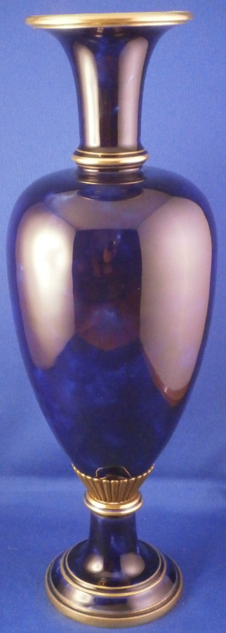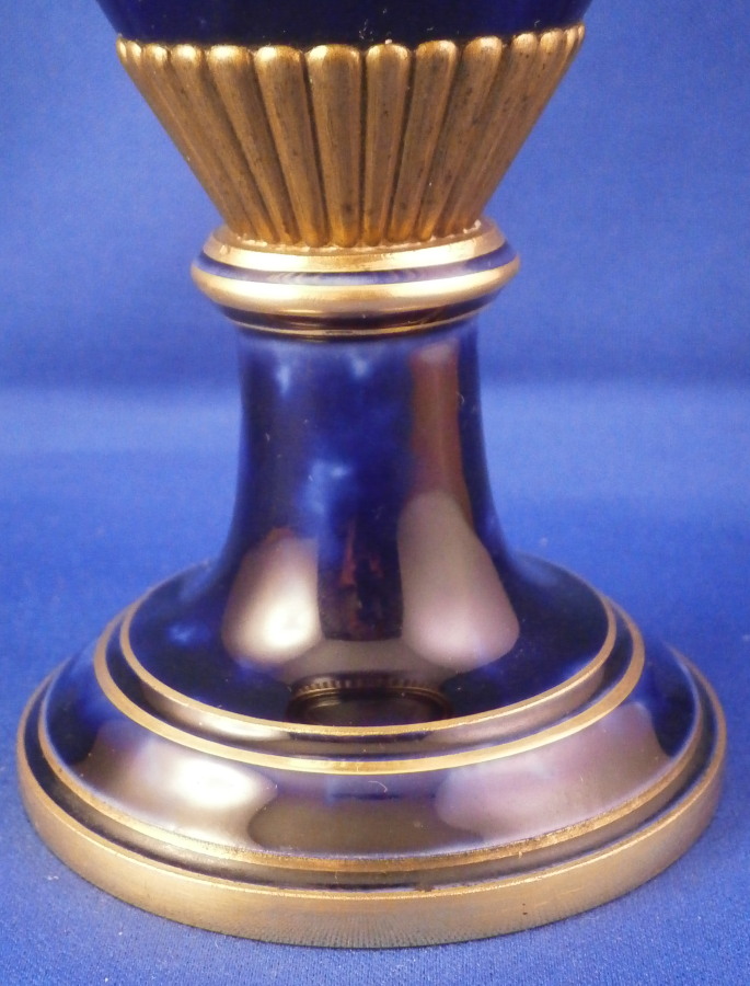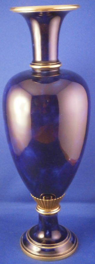 This is a large, elegant and simply superb vase made by Sevres in 1875. The piece has their famous deep cobalt blue ground color with lighter shades here in there I think was meant to look a bit like lapis lazuli. It is one of my favorite colors in the world of porcelaine specially with the combination of gilding. There is just enough simple gold trim to make the vase very elegant in combination with its shape. with a superb fancy gold trim that reminds me of palm leaves around the top part of the side and some tiny scattered gold designs to the rest of the piece as well as gold trim to the edges. That cobalt blue and gold trim cobmination is definitely my favorite color combination in the porcelain world! Stunning and elegant. The piece is in perfect condition. The piece is marked underneath with the red Dore a Sevres mark with a 75 in it for 1875. Oddly enough no other mark like the green mark or incised marks normally found on these but the peice was definitely made by Sevres during this period. Impossible to copy that quality! The vase is 12.25 inches tall and about 4 inches in diameter at the widest point. Please email me for more information or other pictures.