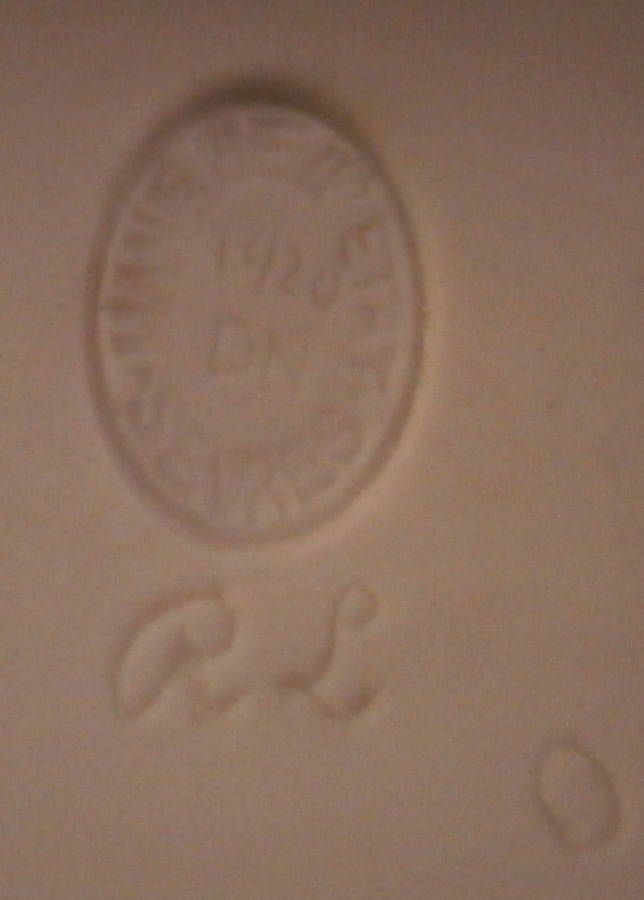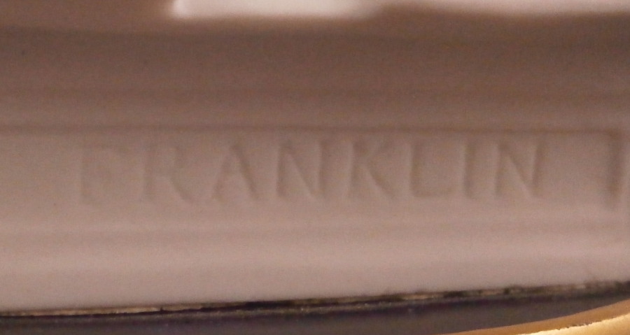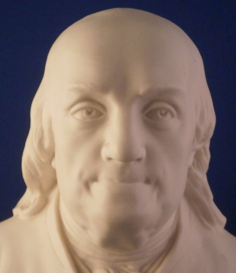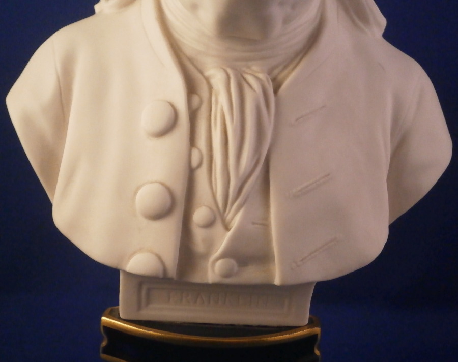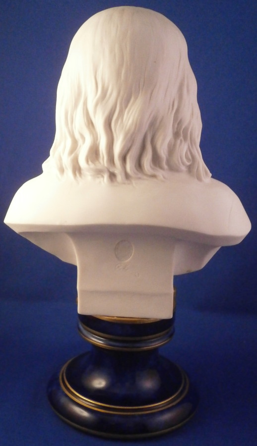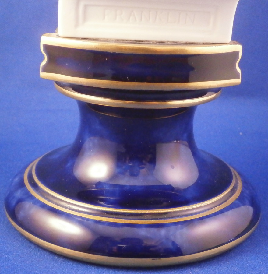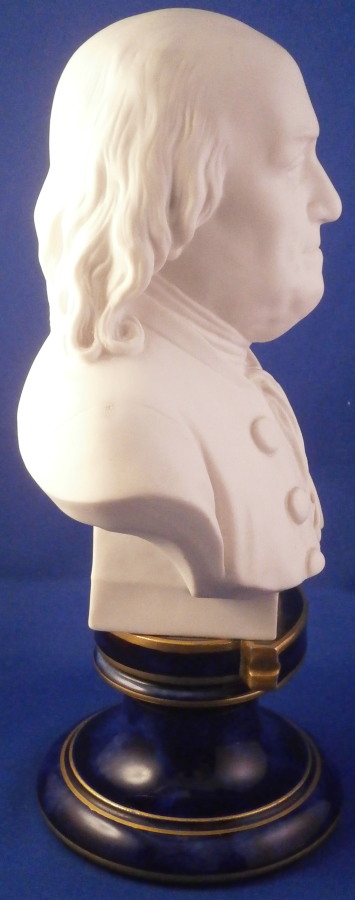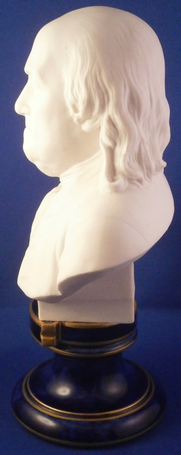 This is a superb biscuit figural bust of the famous Benjamin Franklin made by Sevres in the early 20th century. I cannot make out the date marks clearly but the green mark unde the base was used from 1900 on and I think the impresed mark on his back states 1920. Eitehr way a superb bust and very unusual being an American and having been made by a French maker. Franklin is very well respected in France having lived there from 1776 until 1785 and being one of America's first diplomats! Franklin was a writer, scientist, inventor and many other things and was embraced by the French aristocrats! The bust is made of unglazed bisque or biscuit porcelain and is extremely well modeled with lots of superb details. A stunning piece and the blue ground colored glazed base with the gold trim only brings it out even more. Just in case on didn't know who he was his name is on the front of the base of the bust portion :) The piece is in superb condition with a couple of small stains common to these unglazed pieces and a ground down firing flaw on top of his right shoulder from when it was made. The piece displays perfectly! The bust is marked on the back with an impressed mark as shown and the underside base has the green triangular Sevres mark as well as the usual incised numbers and letters as shown. The entire piece is 9.125 inches tall, about 5.375 inches wide and 3.75 inches deep. Please email me for more information or other pictures.