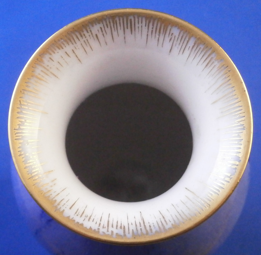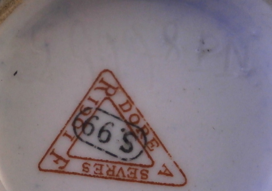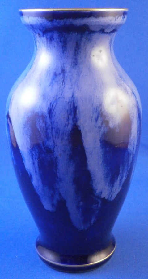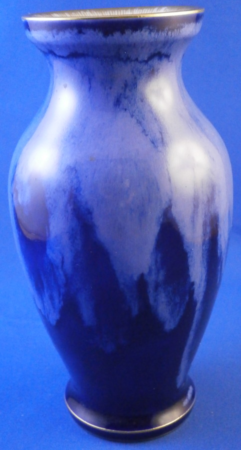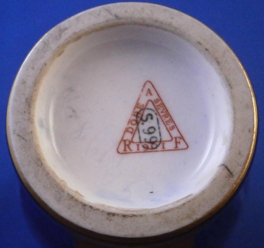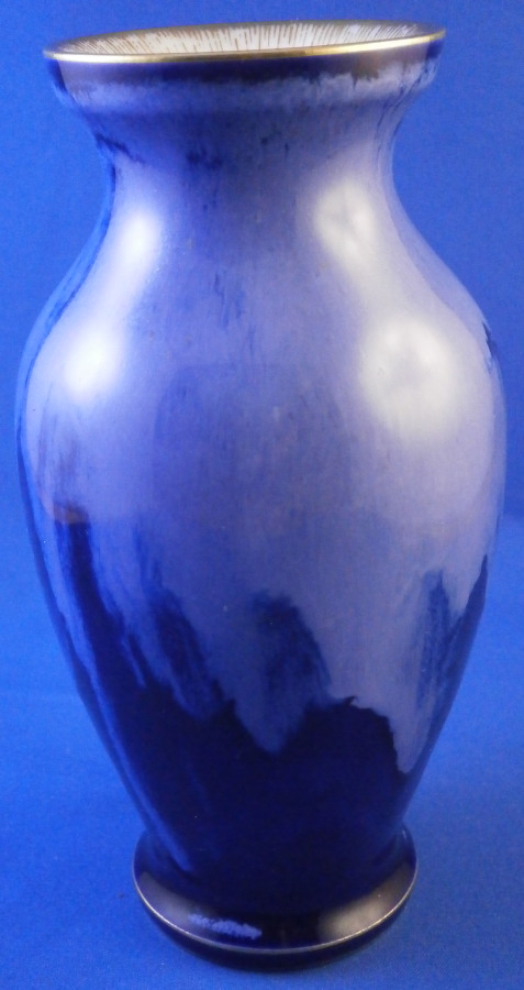 This is a rare vase made by Sevres around 1900. It is covered with one of their famous and quite rare special glazes - this one being the blue flambe one but they also made oxblood ones in this style. This piece here is all in different shades of blue with the lighter blue flowing over the darger cobalt blue solor. Godl trim to the edges and inside top. This is truly an amazing glaze! The vase is in perfect condition with a touch of wear to the gilding on the inside edge and the occasional scratch to the clear glaze which does not detract. It is marked underneath with the S.99 which means the blank was made in 1899 and the red Dore a Sevres gilder's mark for 1901. There are also the usual incised marks underneath as shown. The vase is 5.625 inches tall and 2.875 inches in diameter. An extremely rare piece to find! Please email me for more information or other pictures.