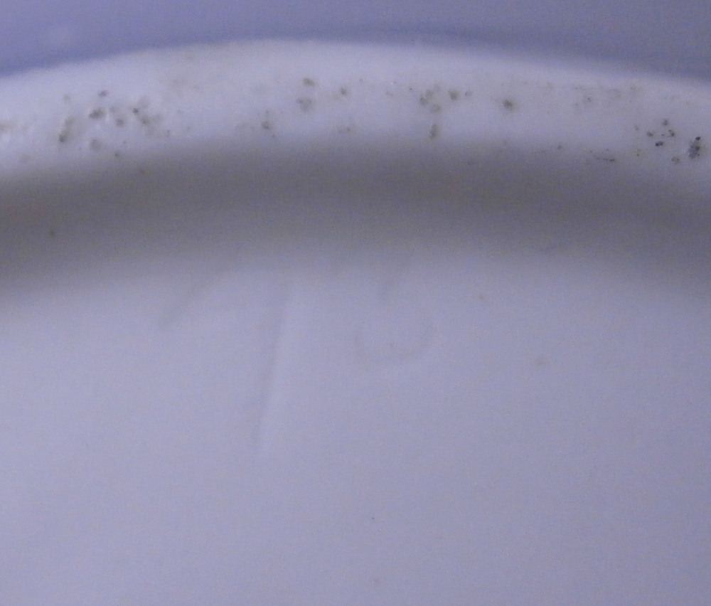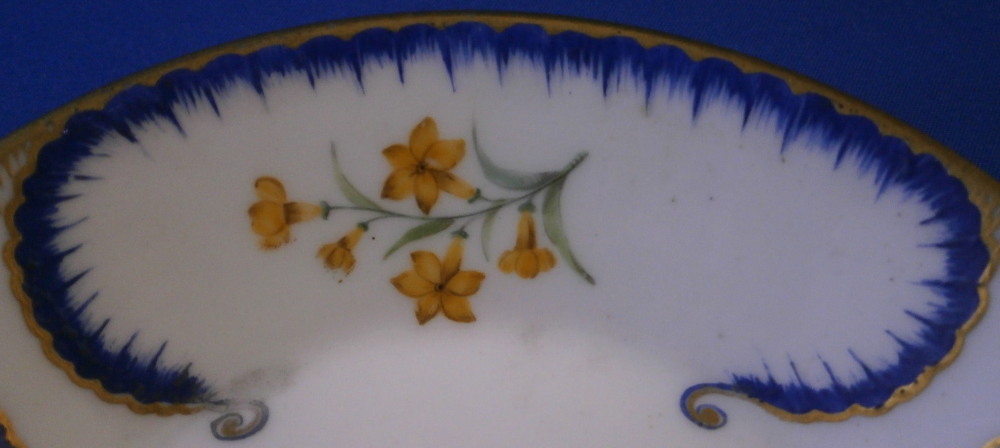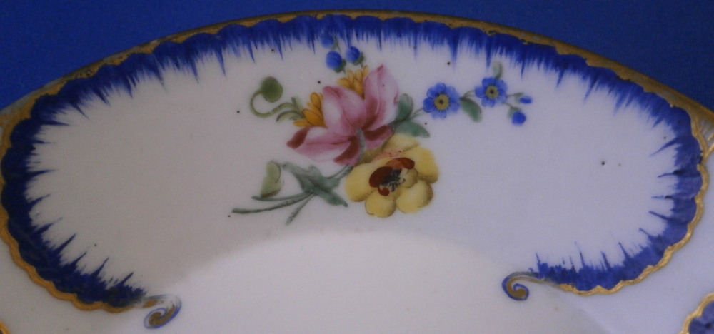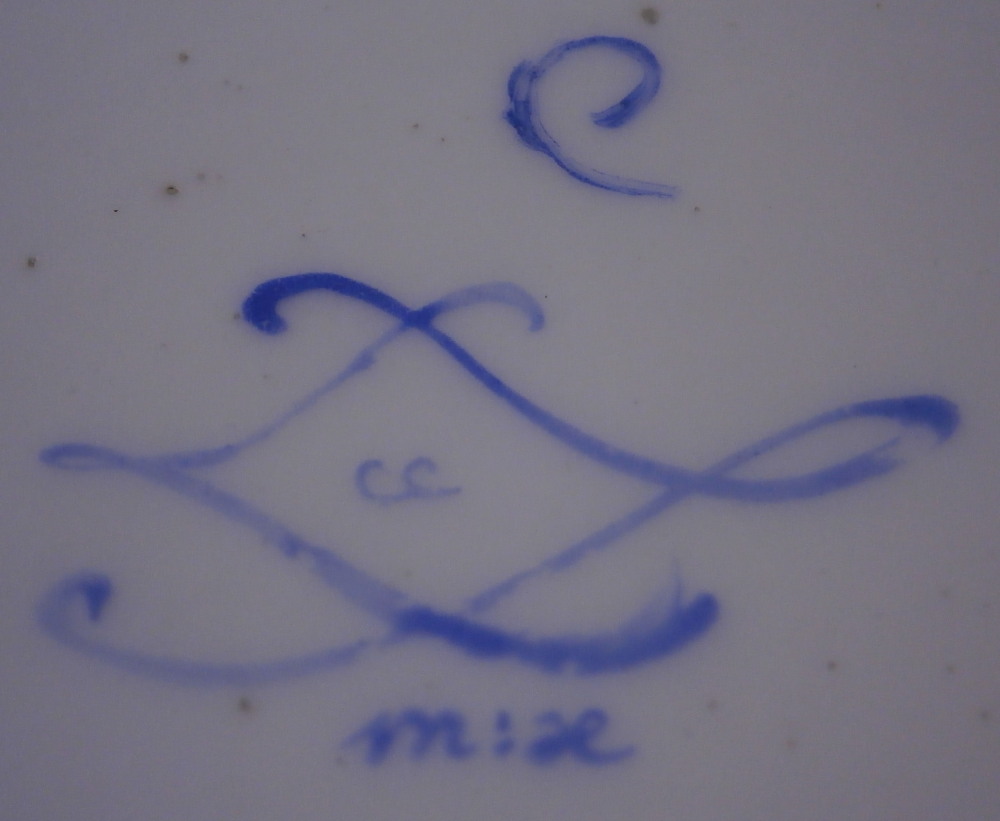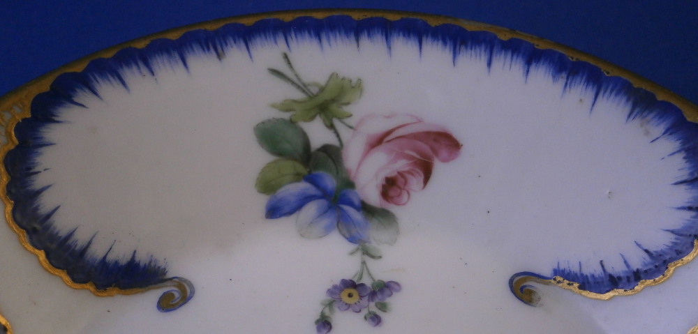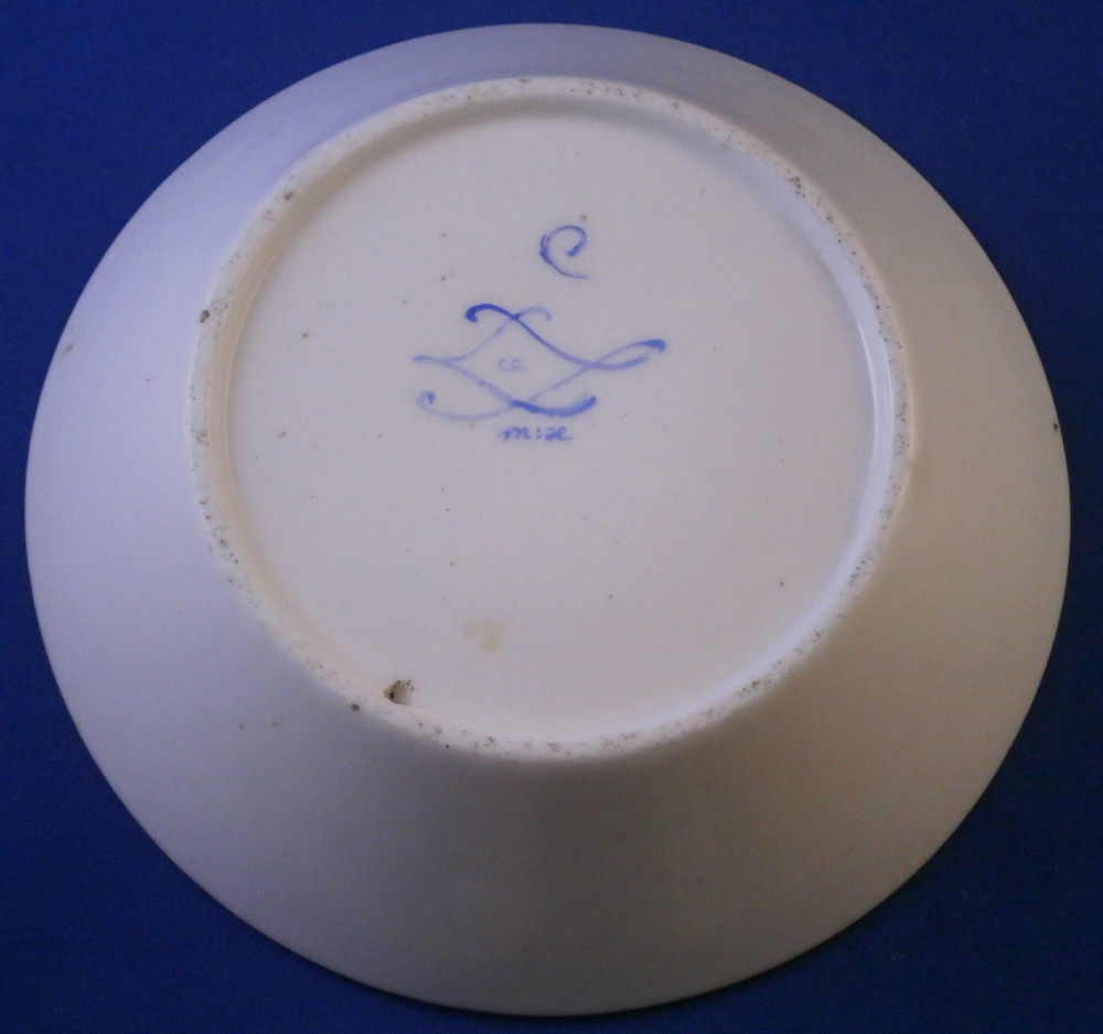 This is a nice saucer made by Sevres in the 18th century or to be more exact in about 1780. It is hand painted with the Feuille de Choux / Chou (I have seen it spelled both ways) pattern which includes three floral arrangements along the rim as well as a single flower in the center and that destinctive blue and gold trim on a raised design. I think it was based on cabbage leaves originally. Looks stunning and is not that easy to find in good condition. Sadly no cup. Their enamel colors and gilding are just superb. The saucer is in great condition with some very minor wear which is typical of soft paste pieces. Looks stunning on display! It is marked underneath with the interlaced blue L mark with the CC as the date code in the center. It is made of softpaste porcelain and has the hole for hanging in the kiln near the footring. There are also two artist and incised marks as shown. The piece is 1.125 inches tall and 5 inches in diameter. Please email me for more information or other pictures.