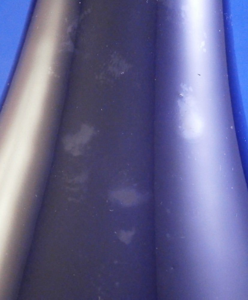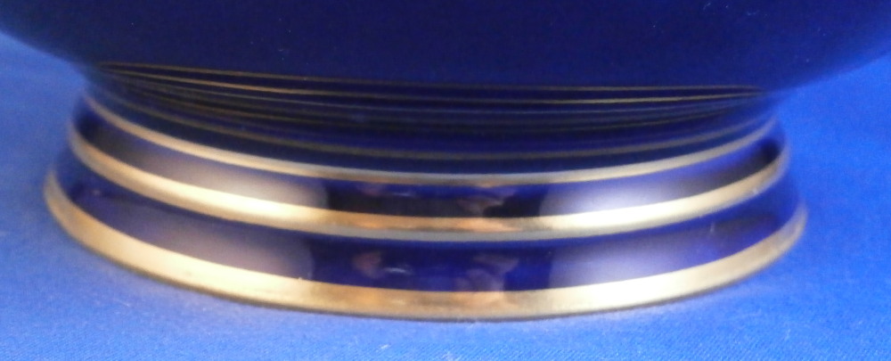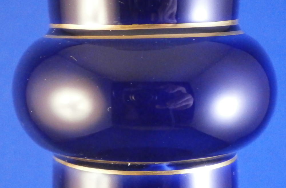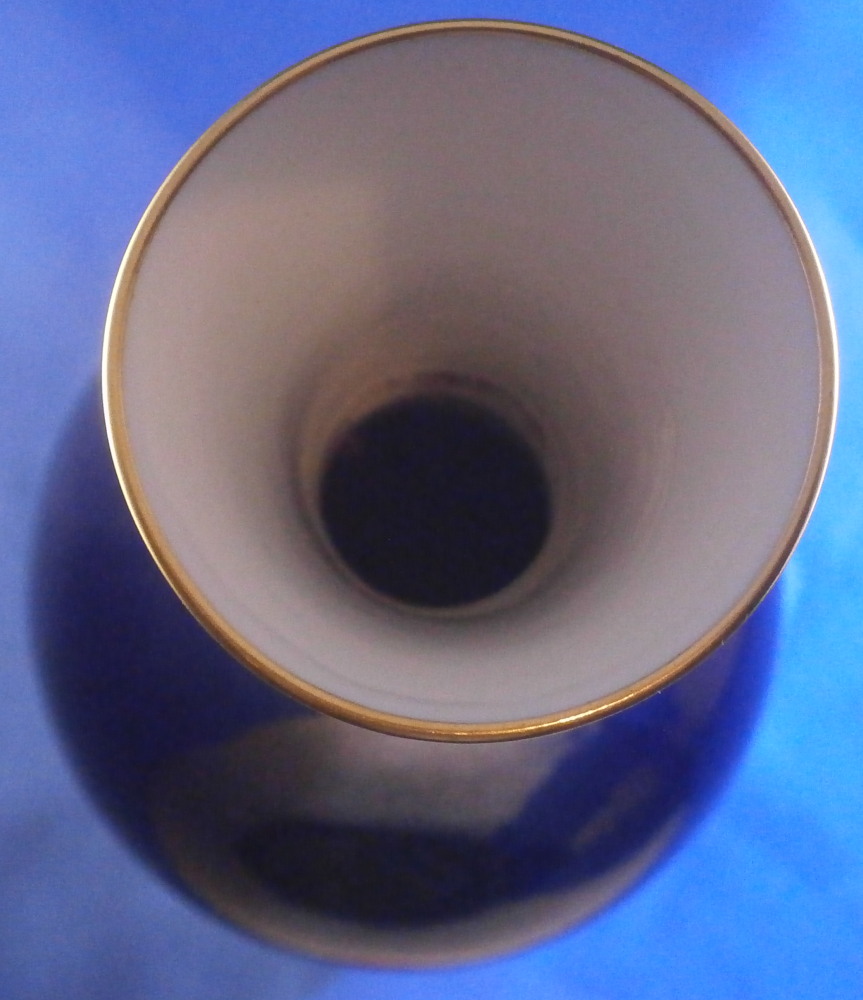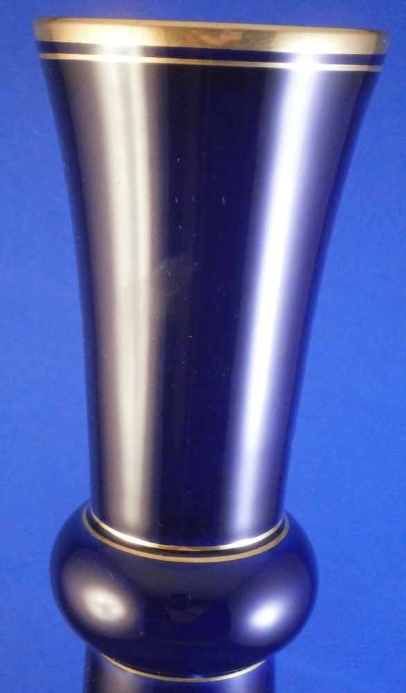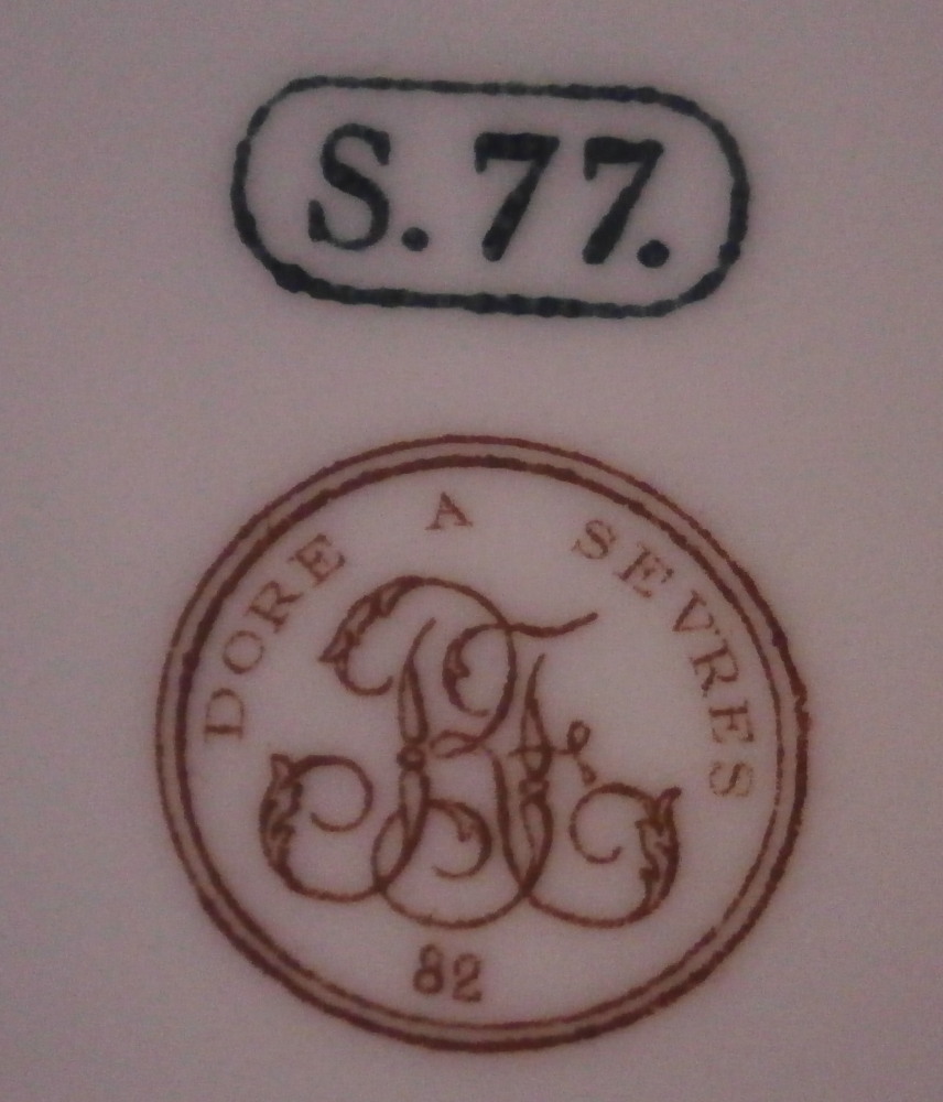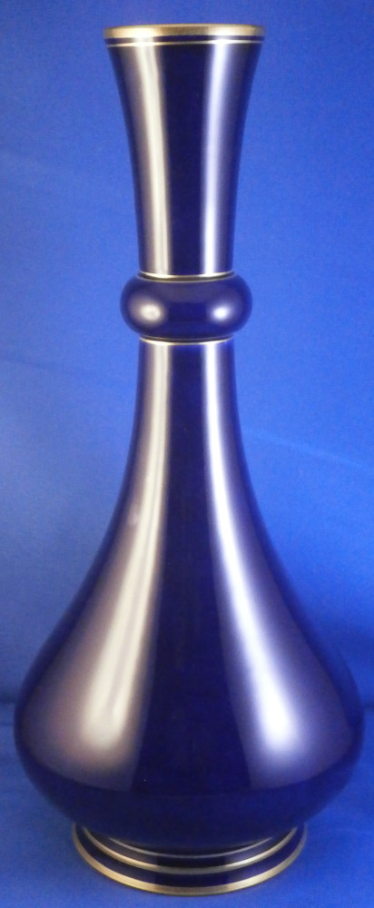This is a nicely shaped large vase made by Sevres in 1877/ 1882. It has a bulbous shape with a thin neck that flares a bit at the top. Little bulb decoration in the neck. The vase is covered in a deep cobalt blue ground color with just some simple gold trim to strategic location to make it look very elgant. Not often one finds these larger examples and this shape it very nice! The vase is in great condition with one area of a few spots to the cobalt blue color. Something happend to this color sometimes over time that make it look like this. I ahve seen it on cobalt blue from all different makers. Does not distract when on display as it needs to be held at the right angle to show. It displays perfectly! It is marked underneath with the oval S.77. mark in green for 1877 as well as the red circular Dore a Sevres mark for 1882 as shown. There are also the usual incised marks one finds on authentic Sevres pieces as well as an artist mark as shown. The vase is 12.75 inches tall and about 5.5 inches in diameter at the widest part. The top opening is 2.25 inches in diameter. Please email me for more information or other pictures.