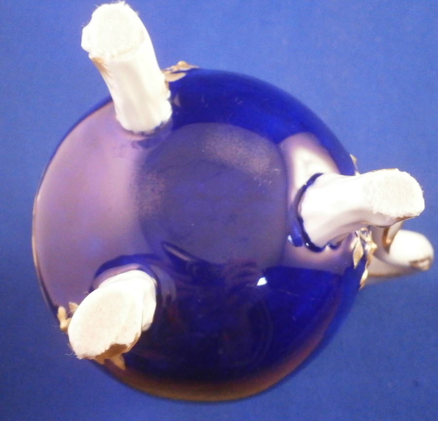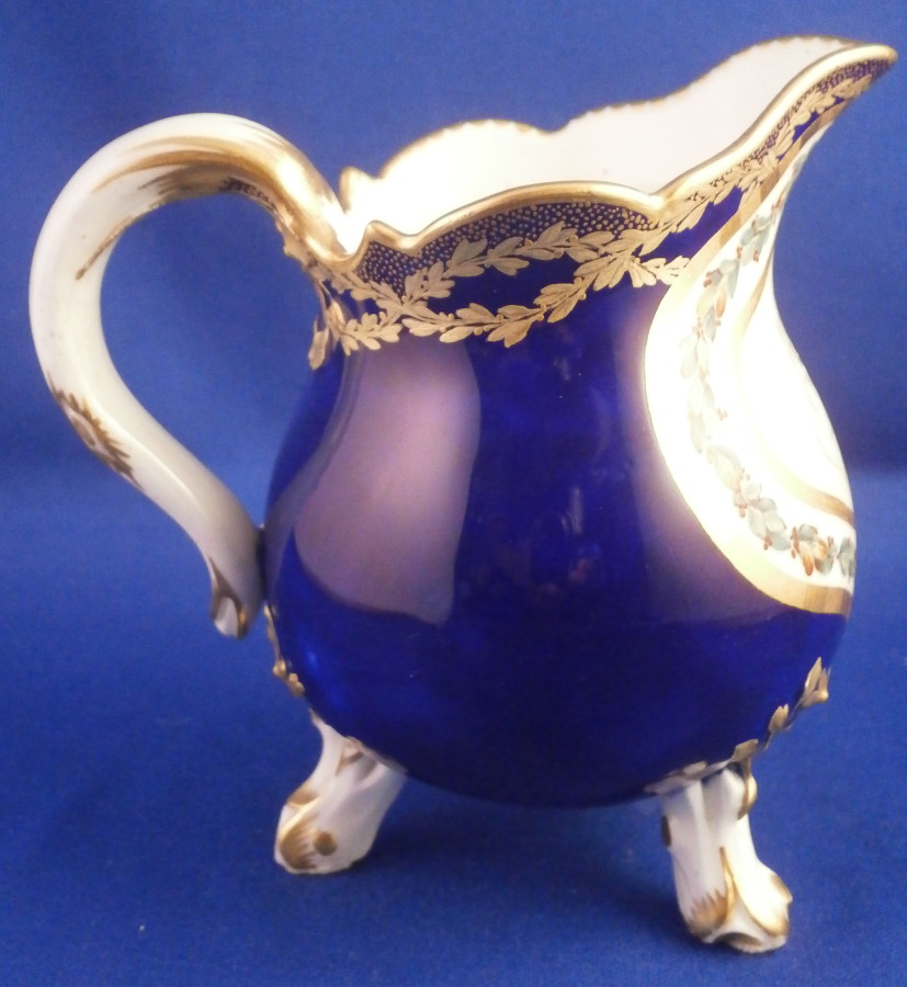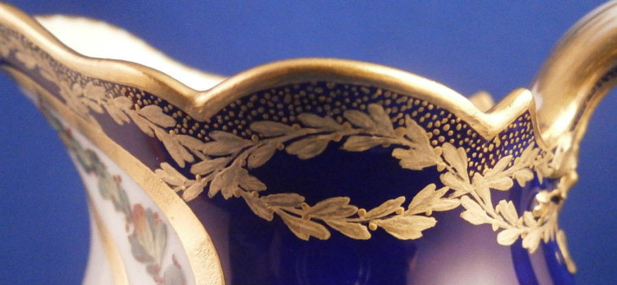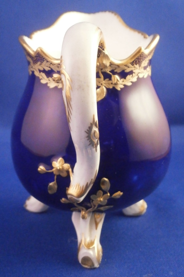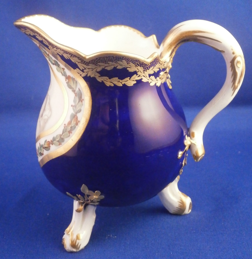 This is a rare creamer / milk jug / pot à lait à trois pieds made by Sevres around 1773 (the teapot of the set has the date mark as well as artist marks). The pitcher is made of soft paste porcelain and has that very nice creamy white paste that collectors love so much. The piece is hand painted with a superb scene en grisaille (in tones of grey / black) of a cherub / angel sitting on a cloud working on some sort of garland / braid. The scene is surrounded by a gold band, then a leaf and berry garland and another gold trim around that that is tooled nicely. The rest of the main body has an amazing deep cobalt blue ground color and a really nice thick gold trim around the top. It sits on three feet made to look like pieces of a branch and has a handlealso made to look like a branch that terminates into 3D flowers and leaves on either end. The feet and handle are highlighted with gilding. The piece is in perfect conditionwith a couple of very minor scratches to the glaze from use which is normal on softpaste pieces! It displays perfectly! The pot is marked with the interlaced double L mark in blue underneath one of the feet which I jsut discovered. Each foot has a piece of felt glued to the underside and I will leave them there. No artist marks on this piece but the one artist mark of the teapot from this set is for Fountaine (J.) who was a painter at the factory from 1752 until 1807. The other artist mark on the tea pot I could not figure out. The piece is 4 inches tall, 2.875 inches wide and 4.125 inches from handle to spout. Please email me for more information or other pictures.