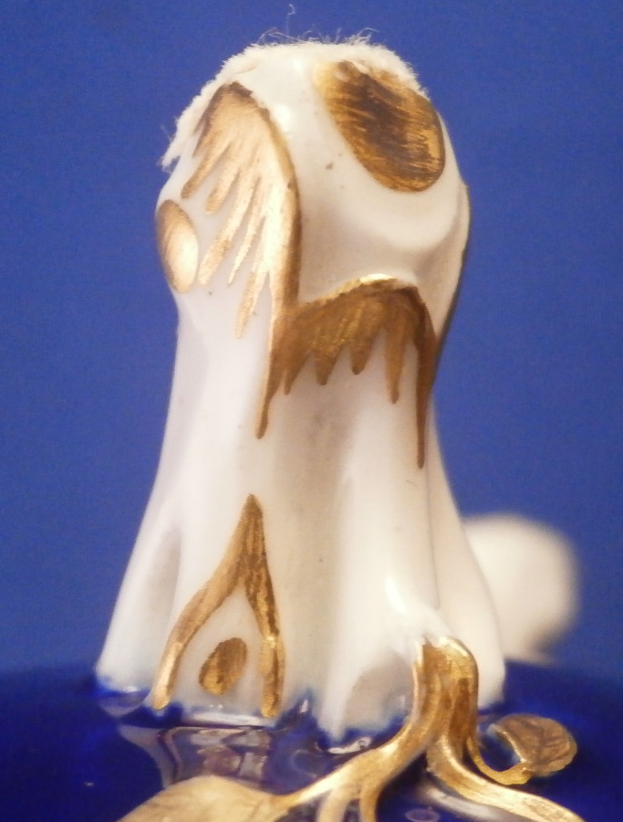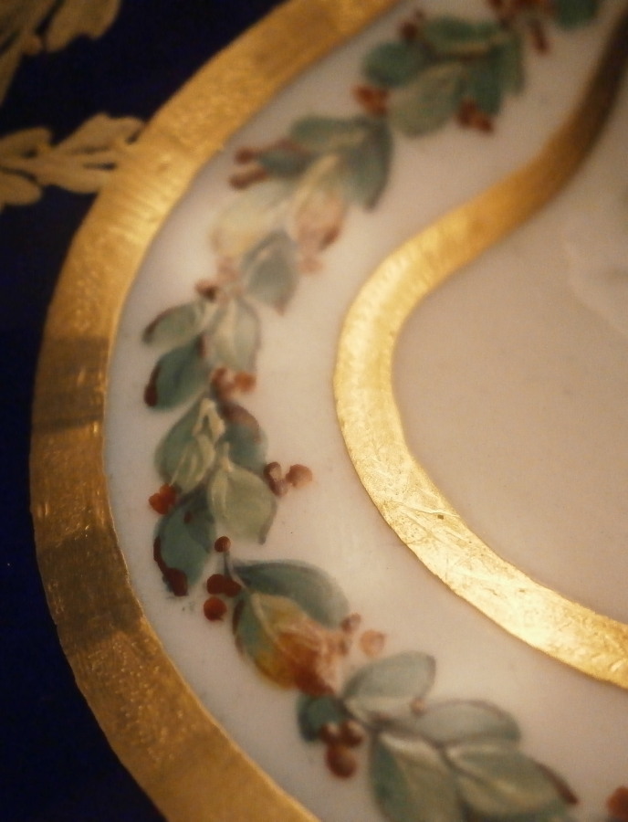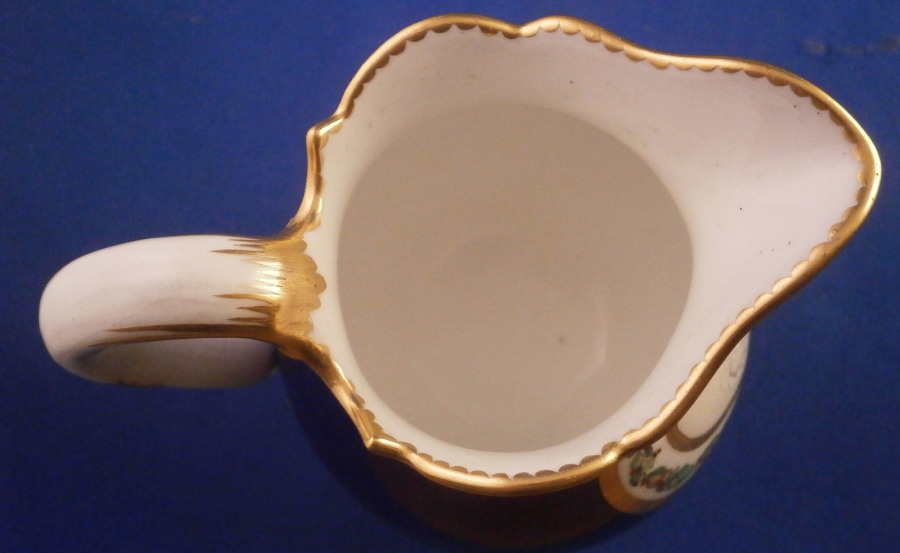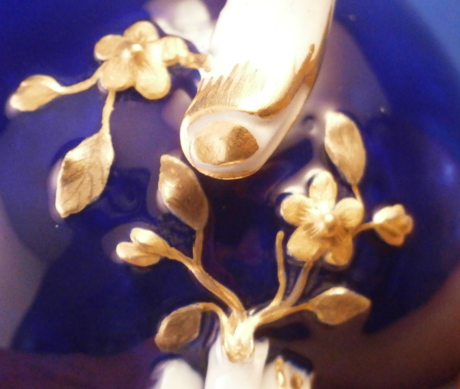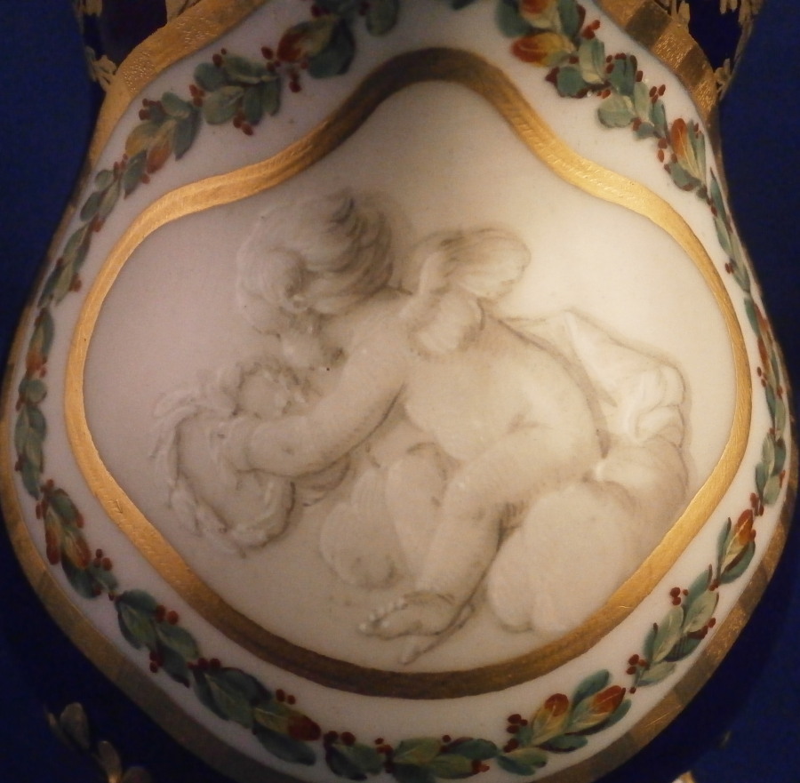 This is a rare creamer / milk jug / pot à lait à trois pieds made by Sevres around 1773 (the teapot of the set has the date mark as well as artist marks). The pitcher is made of soft paste porcelain and has that very nice creamy white paste that collectors love so much. The piece is hand painted with a superb scene en grisaille (in tones of grey / black) of a cherub / angel sitting on a cloud working on some sort of garland / braid. The scene is surrounded by a gold band, then a leaf and berry garland and another gold trim around that that is tooled nicely. The rest of the main body has an amazing deep cobalt blue ground color and a really nice thick gold trim around the top. It sits on three feet made to look like pieces of a branch and has a handlealso made to look like a branch that terminates into 3D flowers and leaves on either end. The feet and handle are highlighted with gilding. The piece is in perfect conditionwith a couple of very minor scratches to the glaze from use which is normal on softpaste pieces! It displays perfectly! The pot is marked with the interlaced double L mark in blue underneath one of the feet which I jsut discovered. Each foot has a piece of felt glued to the underside and I will leave them there. No artist marks on this piece but the one artist mark of the teapot from this set is for Fountaine (J.) who was a painter at the factory from 1752 until 1807. The other artist mark on the tea pot I could not figure out. The piece is 4 inches tall, 2.875 inches wide and 4.125 inches from handle to spout. Please email me for more information or other pictures.