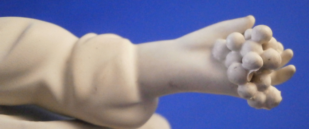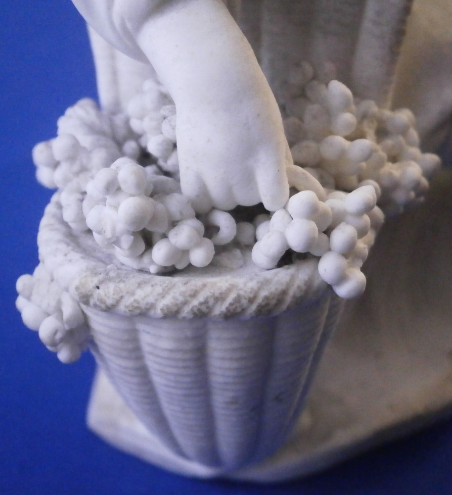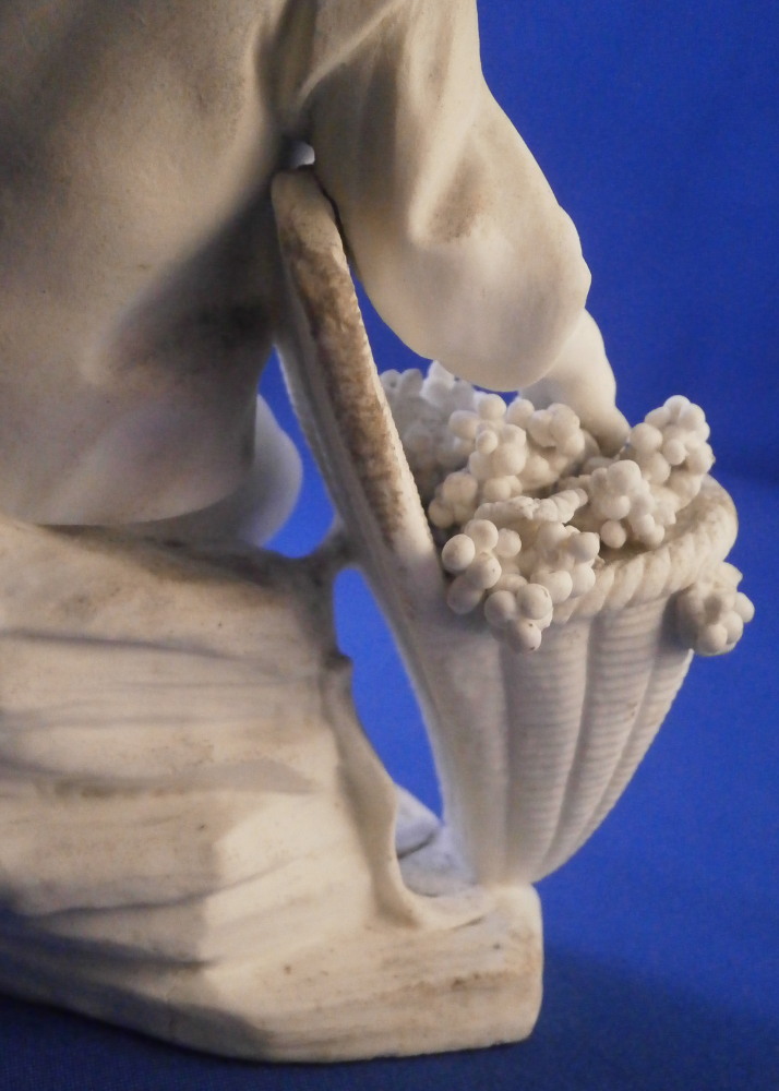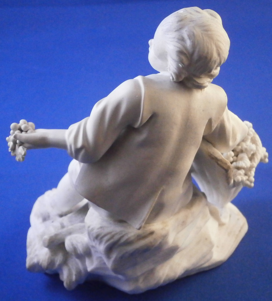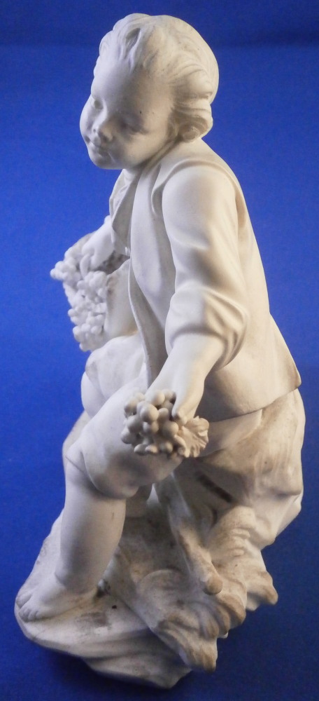 This is a great figurine made by Sevres in about 1760. The figure is made of biscuit porcelain (unglazed porcelain) and is of a young man or boy resting while sitting on some rock and leaning on the basket of grapes he just picked. The basket is a typical French harvest basket of the period. Nice rocky base typical to these figures and a stick behind his legs and a bunch of grapes in his outstretched hand. Nicely modeled figurine and it being unglazed means all the details are much clearer. The figure is marked underneath with an incised F for Falconet. Falconet added his F to pieces he approved so this was not necessarily modeled by him. The piece displays superbly but has some fine black kiln dust mainly on the right side of the base and some over spray from an old restoration which means I cannot tell you exactly what is wrong with the piece as it was well done. Here is what I think it has - I think there iwas a hole on top of his head, The out stretched arm was off and the thumb was restored. It is impossible to tell though and the piece looks nice. The overspray is often so much worse than the damage sicne they try to hide the repair. The paint covers part of his back and his hair and face but that was definitely not worked on. The figurine is 4.875 inches tall, 4.375 inches wide and 2.5 inches deep. Please email me for more information or other pictures.