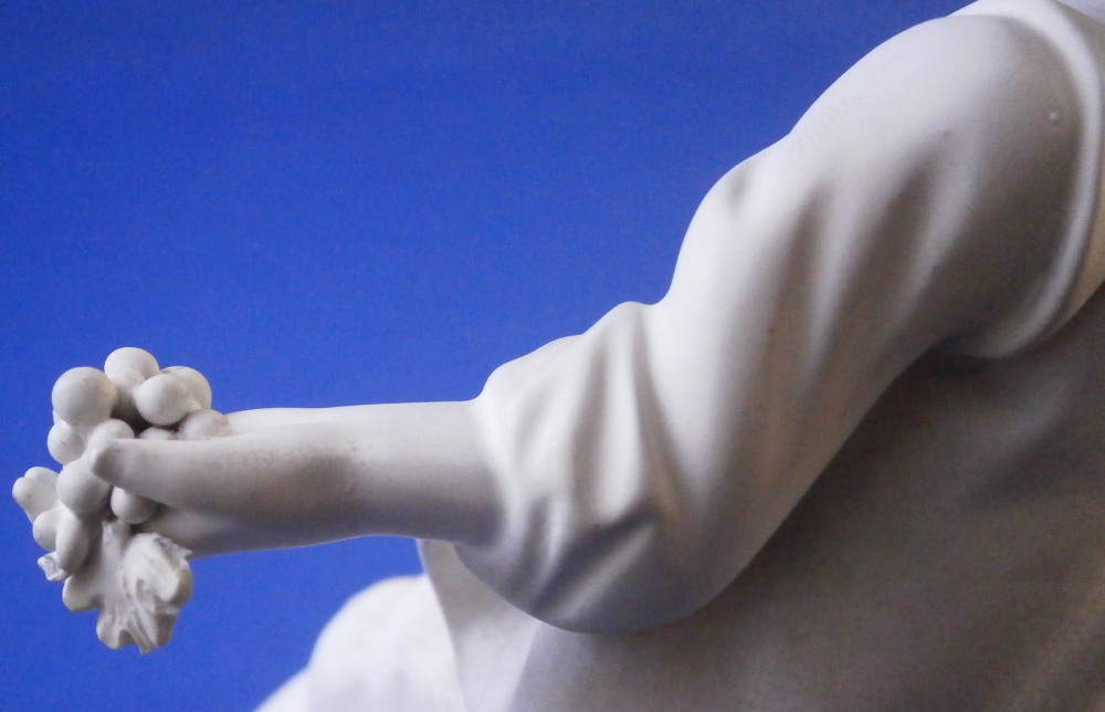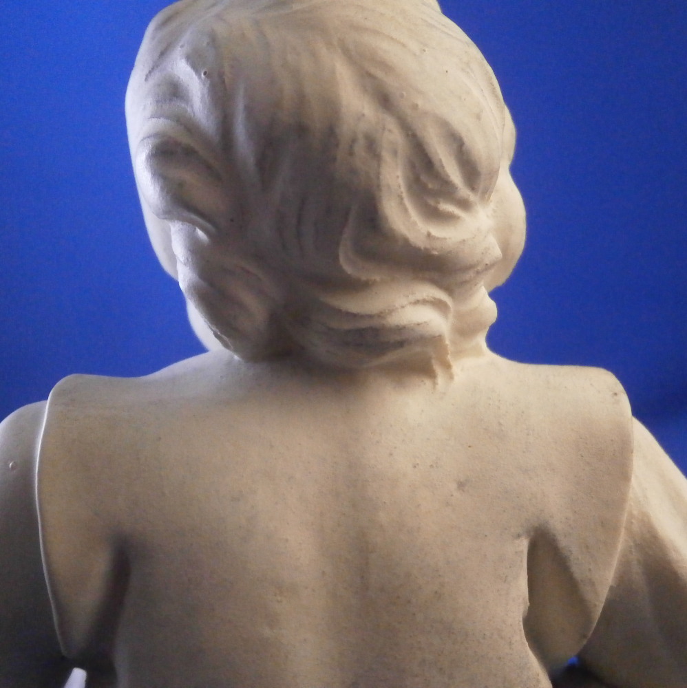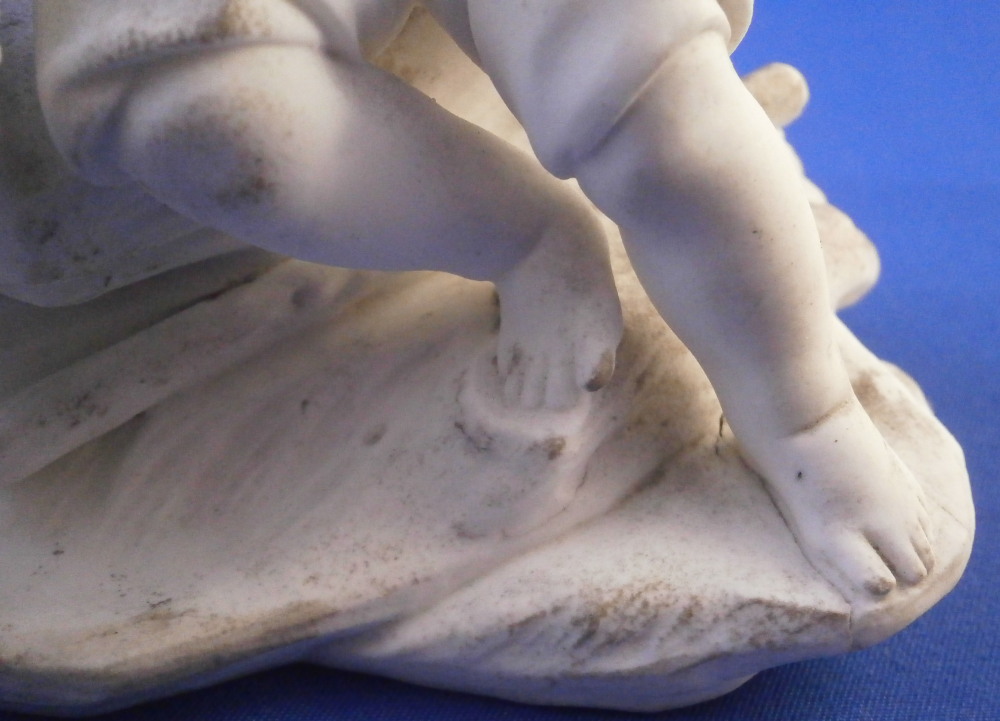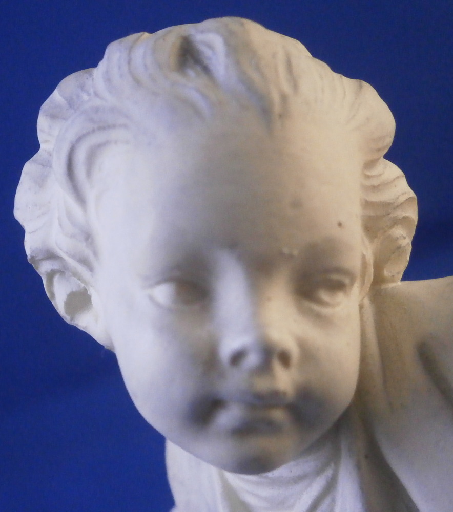 This is a great figurine made by Sevres in about 1760. The figure is made of biscuit porcelain (unglazed porcelain) and is of a young man or boy resting while sitting on some rock and leaning on the basket of grapes he just picked. The basket is a typical French harvest basket of the period. Nice rocky base typical to these figures and a stick behind his legs and a bunch of grapes in his outstretched hand. Nicely modeled figurine and it being unglazed means all the details are much clearer. The figure is marked underneath with an incised F for Falconet. Falconet added his F to pieces he approved so this was not necessarily modeled by him. The piece displays superbly but has some fine black kiln dust mainly on the right side of the base and some over spray from an old restoration which means I cannot tell you exactly what is wrong with the piece as it was well done. Here is what I think it has - I think there iwas a hole on top of his head, The out stretched arm was off and the thumb was restored. It is impossible to tell though and the piece looks nice. The overspray is often so much worse than the damage sicne they try to hide the repair. The paint covers part of his back and his hair and face but that was definitely not worked on. The figurine is 4.875 inches tall, 4.375 inches wide and 2.5 inches deep. Please email me for more information or other pictures.
