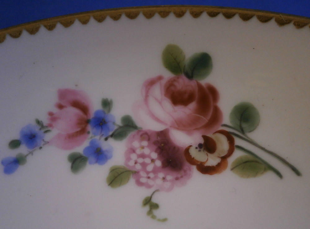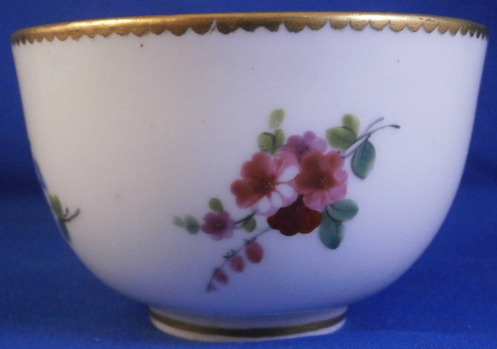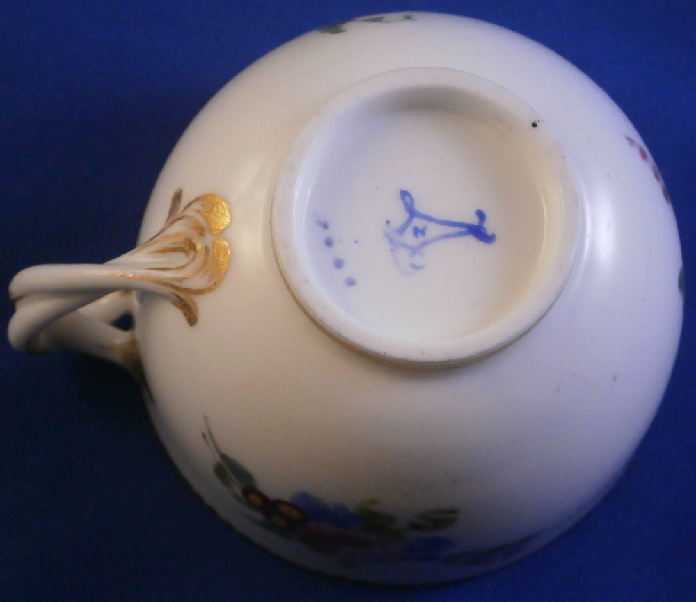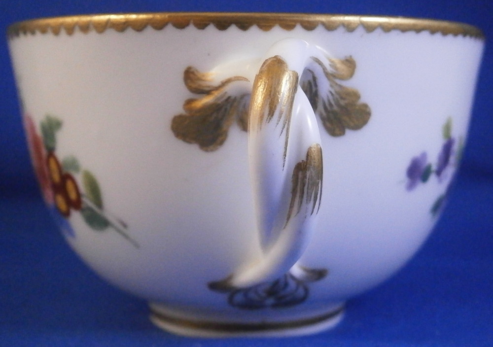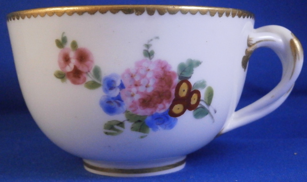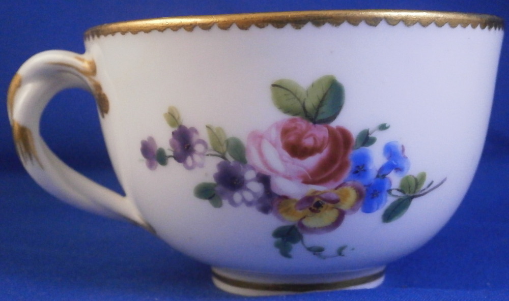 This is a really nice cup and saucer made by Sevres during the 18th century in 1775 I believe thought I am not what letter it is. Looks like an x to me but judge for yourself. Either way it is an 18th century example! This set is made of soft paste porcelain which just has a stunning warmth to it and the enamel colors are just superb! Both pieces are hand painted with some superb floral arrangements as well as a nice gold trim. The cup has an intertwined branch design handle with gold highlights to it. They are both marked underneath with the interlaced L mark with the letter x (I think) inside and each has the little hole from the firing process typical of Sevres. The saucer has some incised marks as shown. Both have four dots as the painter's mark as well as a squiggly line on the saucer. The four dots are for Theordore who was a decorator and gilder at the factory from 1765 until 1779. Not sure who that squiggly line is meant to represent. The set is in superb condition with just one spot of gold wear on the cup rim and two on the saucer outside edge. As nice as they come and a great example of this style! The cup is 1.875 inches tall and 3.125 inches in diameter. The saucer is 1.125 inches tall and 4.75 inches in diameter. Please email me for more information or other pictures.