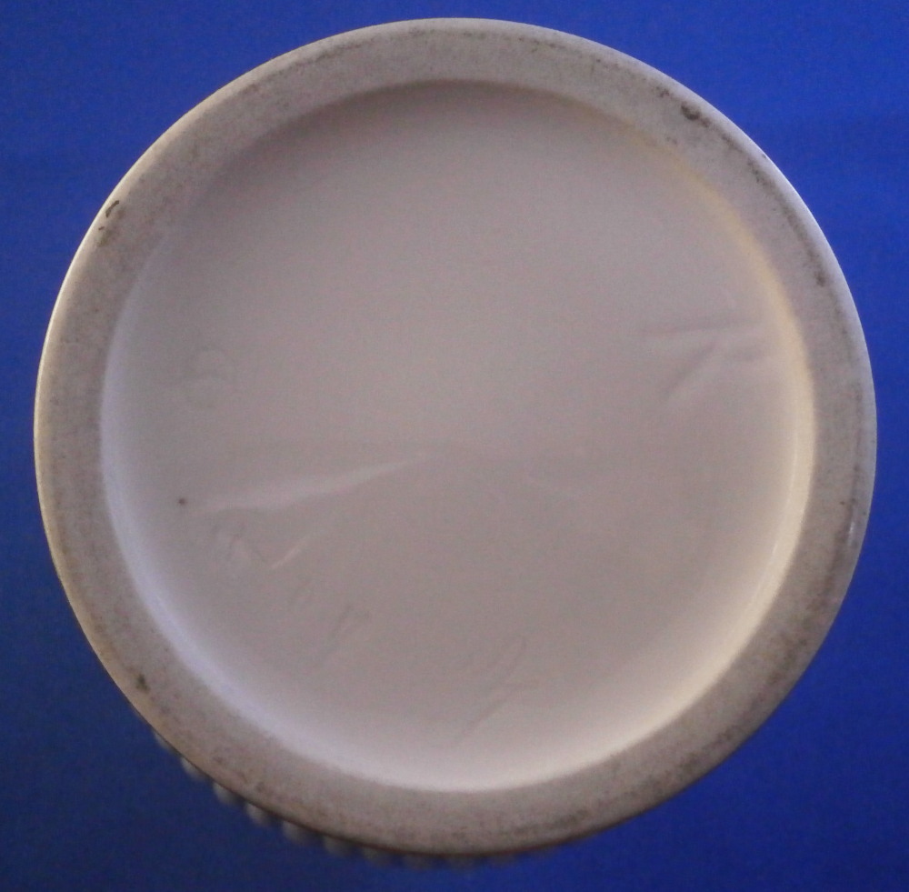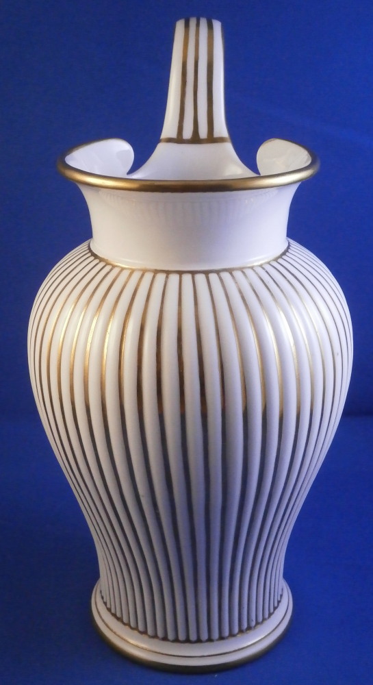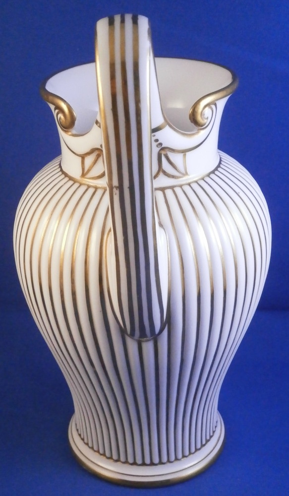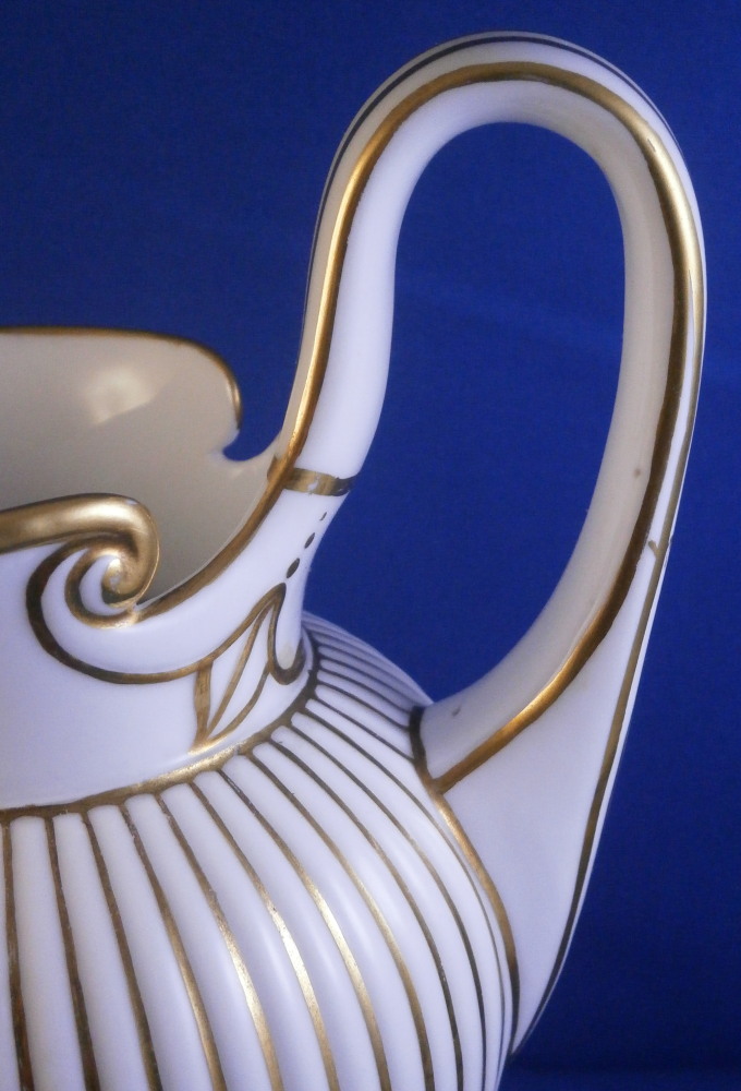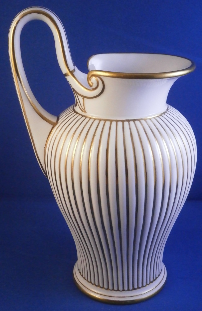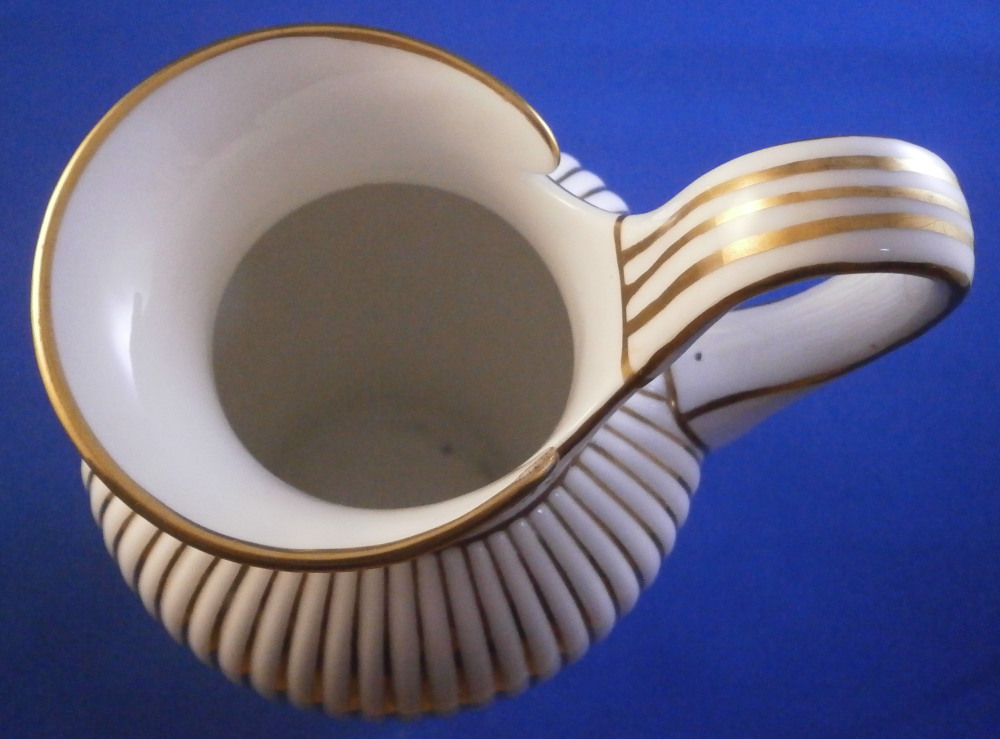 This is a really nice large creamer made by Sevres in 1840. The piece is decorated in the Godronnee design with a ribbed / reeded type of design to the outside with raised sections and gilding to the valleys between the raised parts. Gold trim to the edges as well as handle. It is a simple but very stunning looking decoration that one does not see often at all! The creamer is in great condition same as the day it was made but has a few issues. Some stray gold marks to the handle and to one spot on one side of the creamer and on the inside towards the top right by the lower handle terminal there is a large flaw to the paste. I couldn't get a picture of it due to its location. Obviously is does not show when on display. One spot of wear to the gilding on the handle. It's a great looking piece. Nice shape and decoration! It is marked underneath with just their typical incised marks as shown. The creamer is just over 7.5 inches tall including the handle, 4.5 inches from handle to spout and 4 inches in diameter. Please email me for more information or other pictures.
